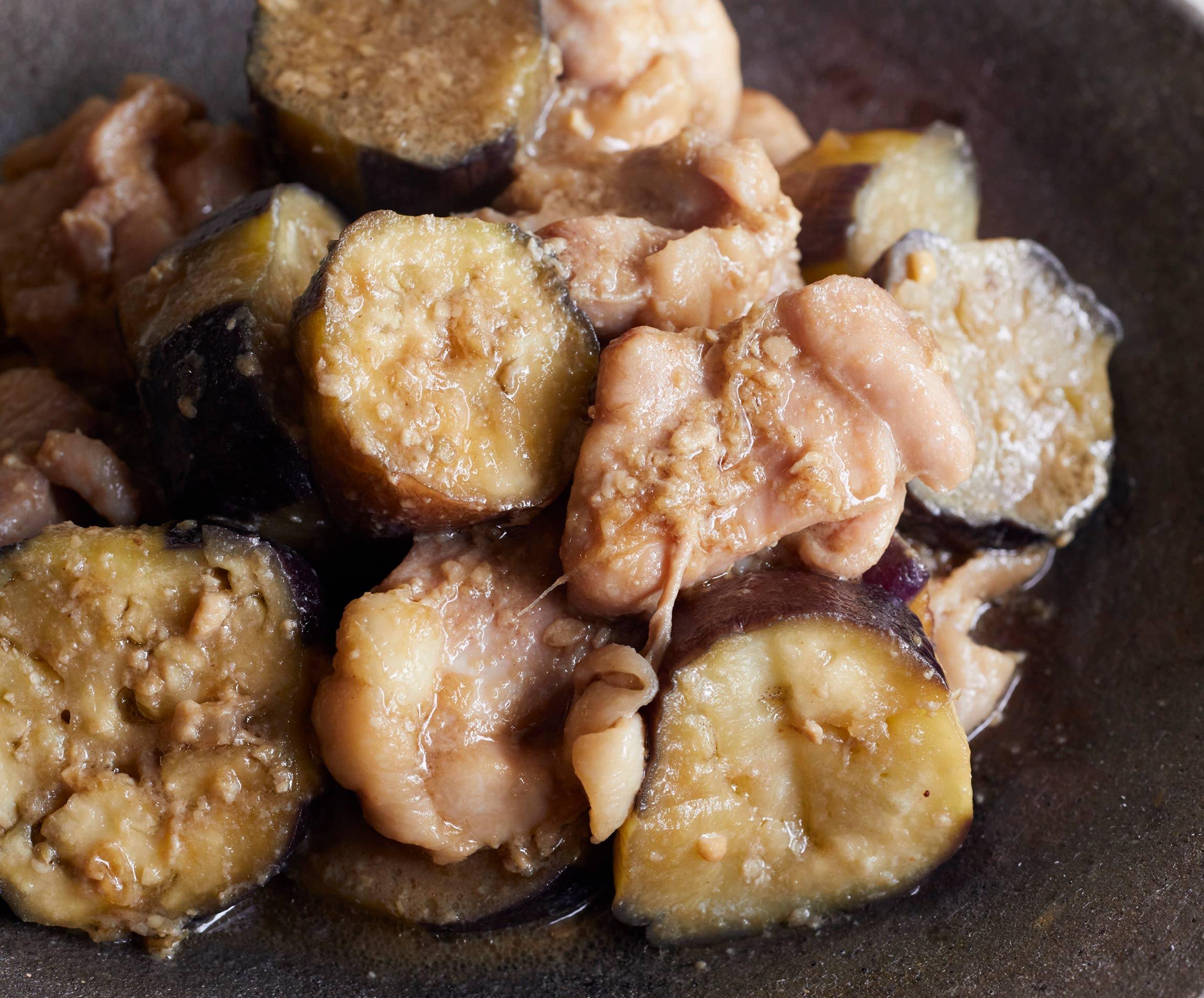 フライパンの底面全体にサラダ油を塗り、なすの切り口を上下にして並べ、鶏肉をのせる。蓋をして中火にかけ、煮たってきたら弱火にして10~12分蒸し煮する。なすがやわらかくな ったら全体を混ぜて器に盛る。