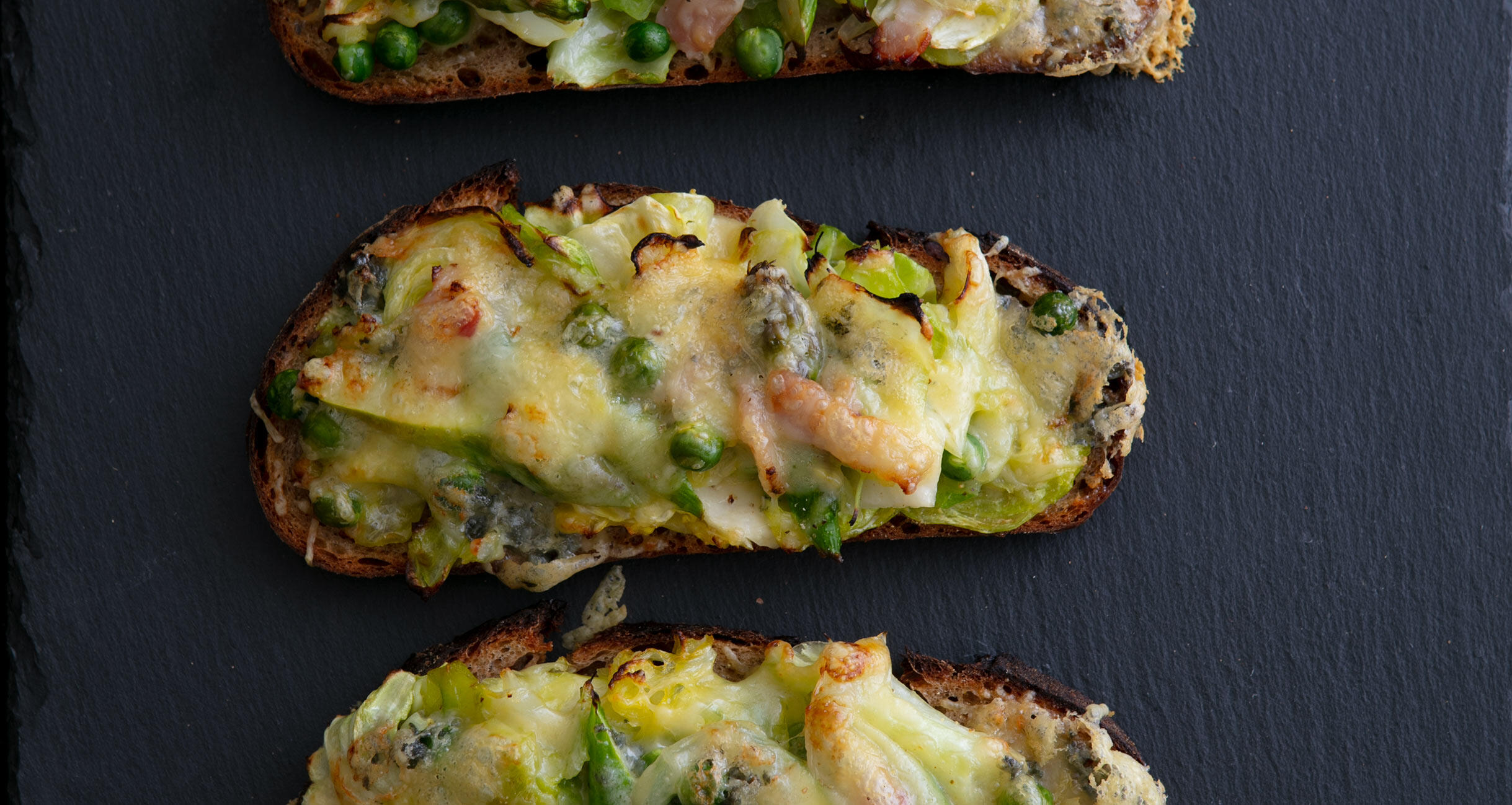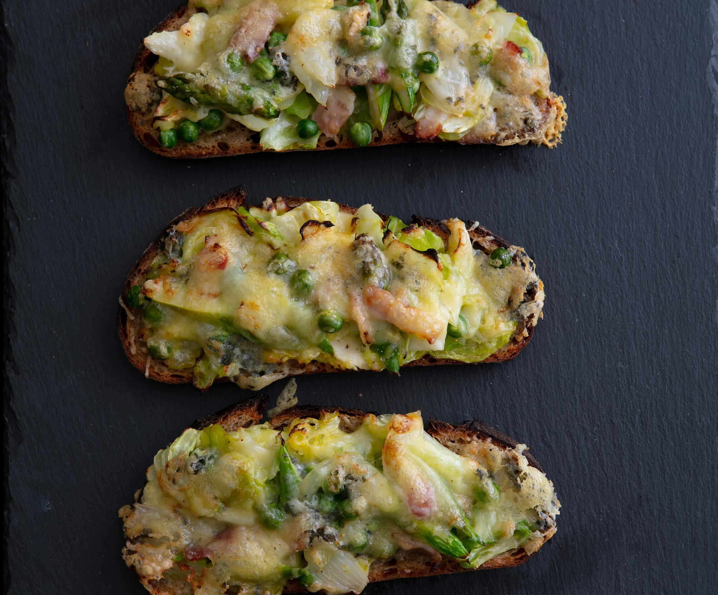 「焼いて仕上げるタルティーヌは、前日のパンでつくることが多く、具材を支えるためにも少しかためのバゲットやパン・ド・カンパーニュがつくりやすいですね。特にカンパーニュは2~3日たったほうが味が落ち着きます。さらに、カリッとトーストすれば香ばしさとパンチが加わります」 春野菜とチーズをたっぷりのせた“春野菜のタルティーヌ”は、これだけで食卓が華やぐ一品。隠し味に加えたブルーチーズが野菜と渾然一体となって深い余韻をもたらす。焼きたてもいいが、冷めてもなおしっとりとおいしいのがうれしい。
