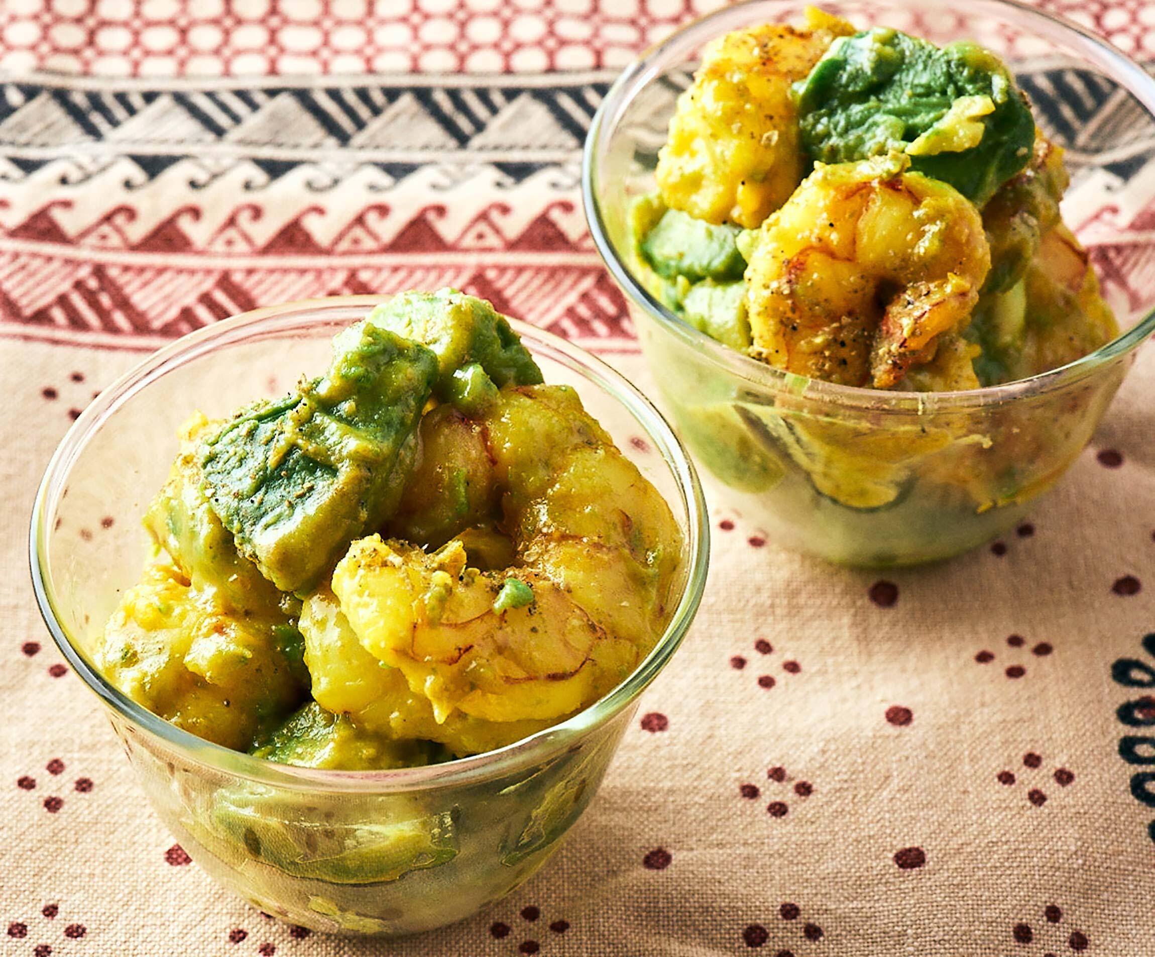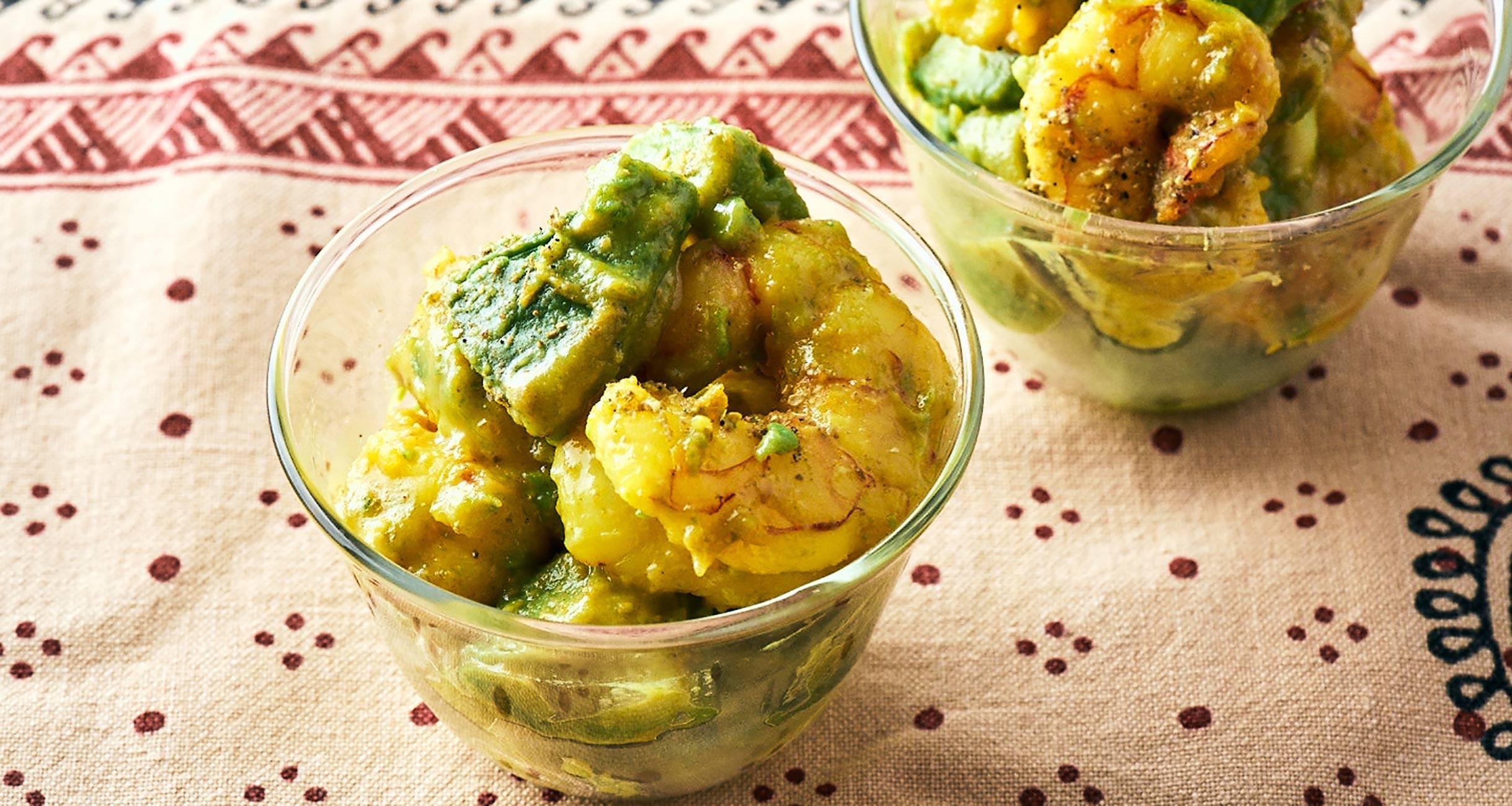 インド・スパイス料理研究家の香取薫さんが教えてくれたのは、山椒が爽やかに香るアボカドつまみ。西京味噌が入っているので、ほのかに甘みがあり日本酒に合う一品です。クリーミーなアボカドとプリプリの海老は鉄板の組み合わせです!