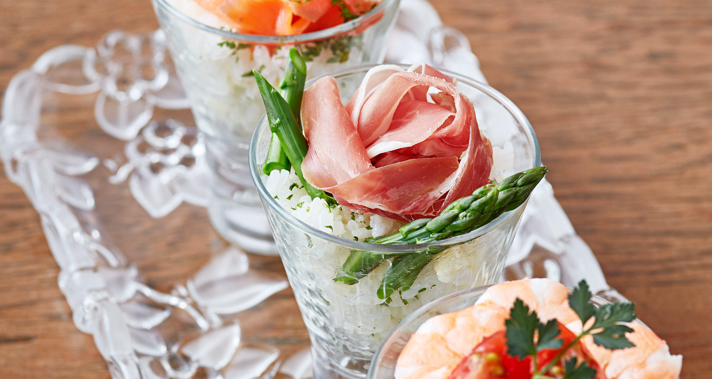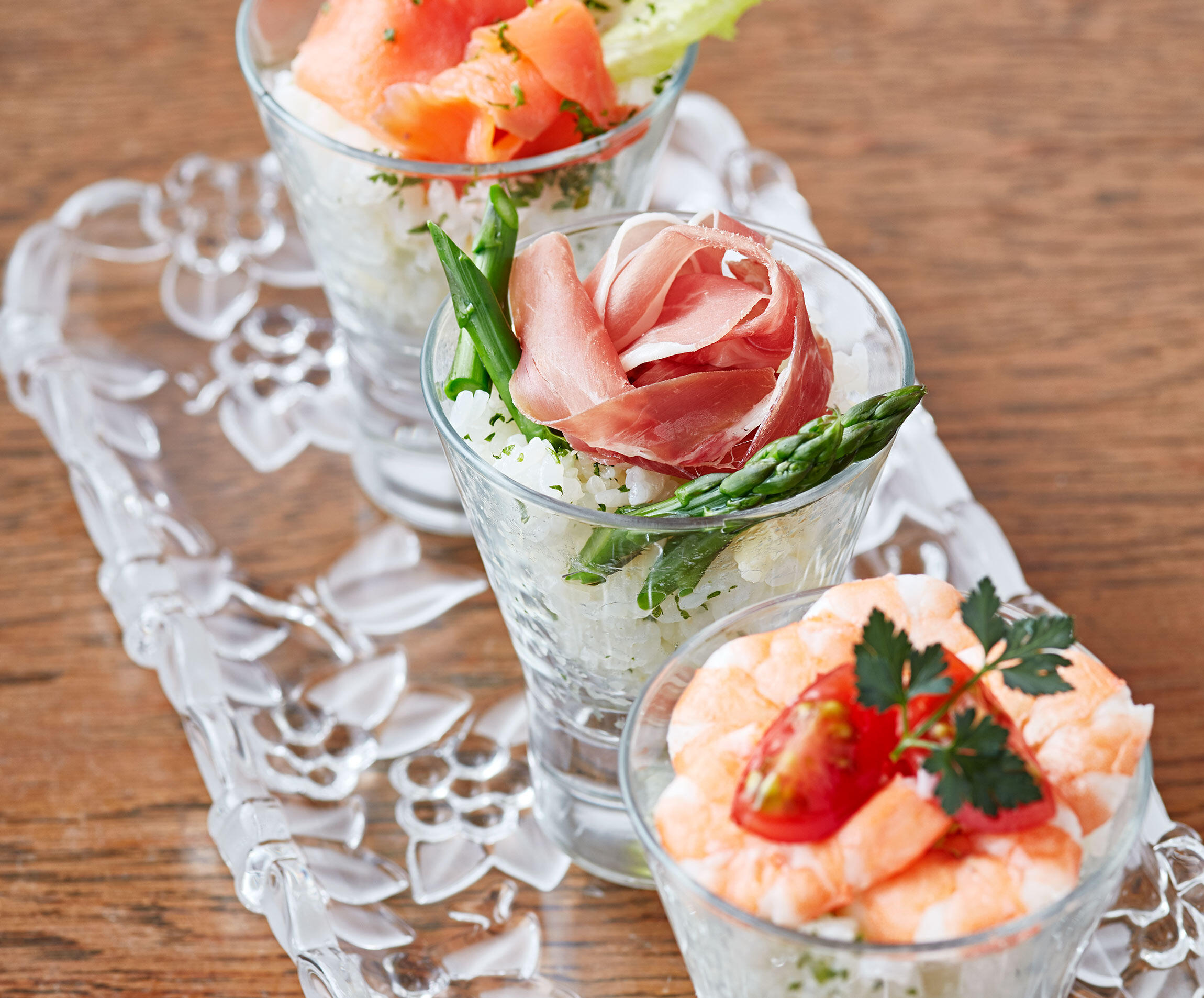 | ★ 飾り用の具材 | 適量(ゆで海老、スモークサーモン、生ハム、ミニトマト、ゆでアスパラガス、ハーブなど) |