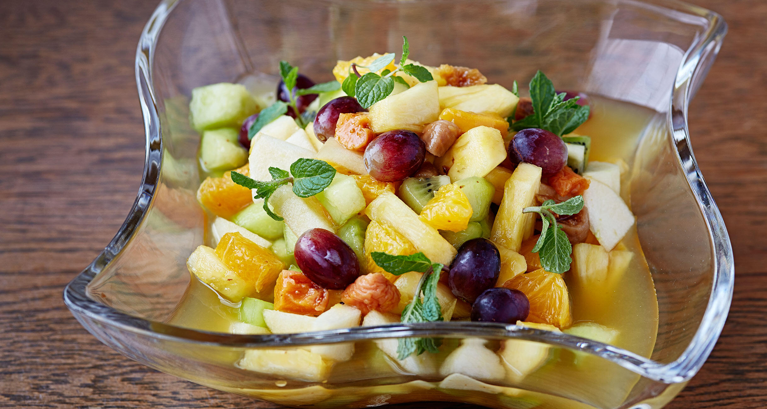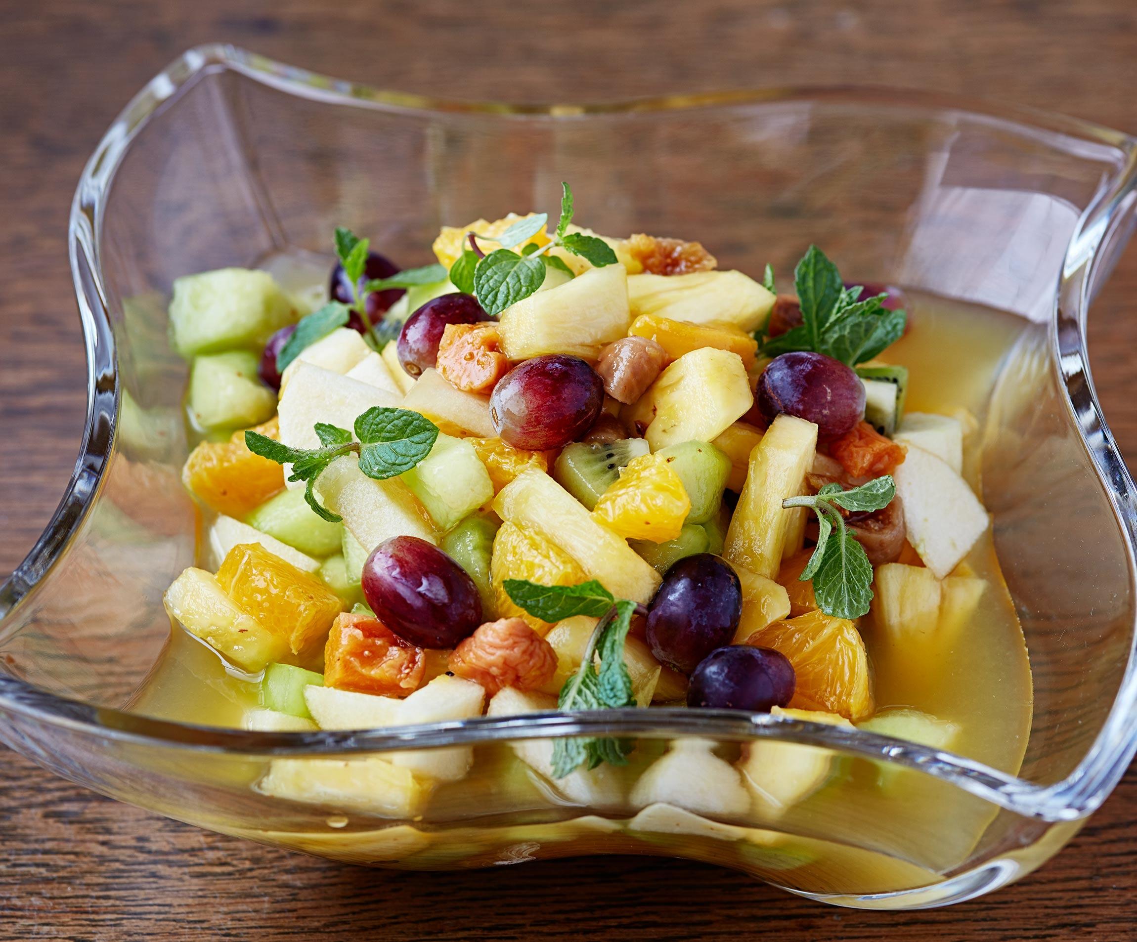 フルーツをザクザク切って砂糖とレモン汁を加えただけなのに、食べる手が止まらなくなる魔法の一皿。食感の異なる果物、酸味のある果物を彩りよく合わせるのがコツ。キンと冷たくして召し上がれ。フレッシュフルーツに加えて、ドライフルーツを混ぜることで、味にぐんと深みが増します。夏満喫のフルーツサラダはキリッと冷やして、スパークリングワインや炭酸を加えてドリンクに。アイスクリームやヨーグルトを添えてデザートにしてもおいしいです。