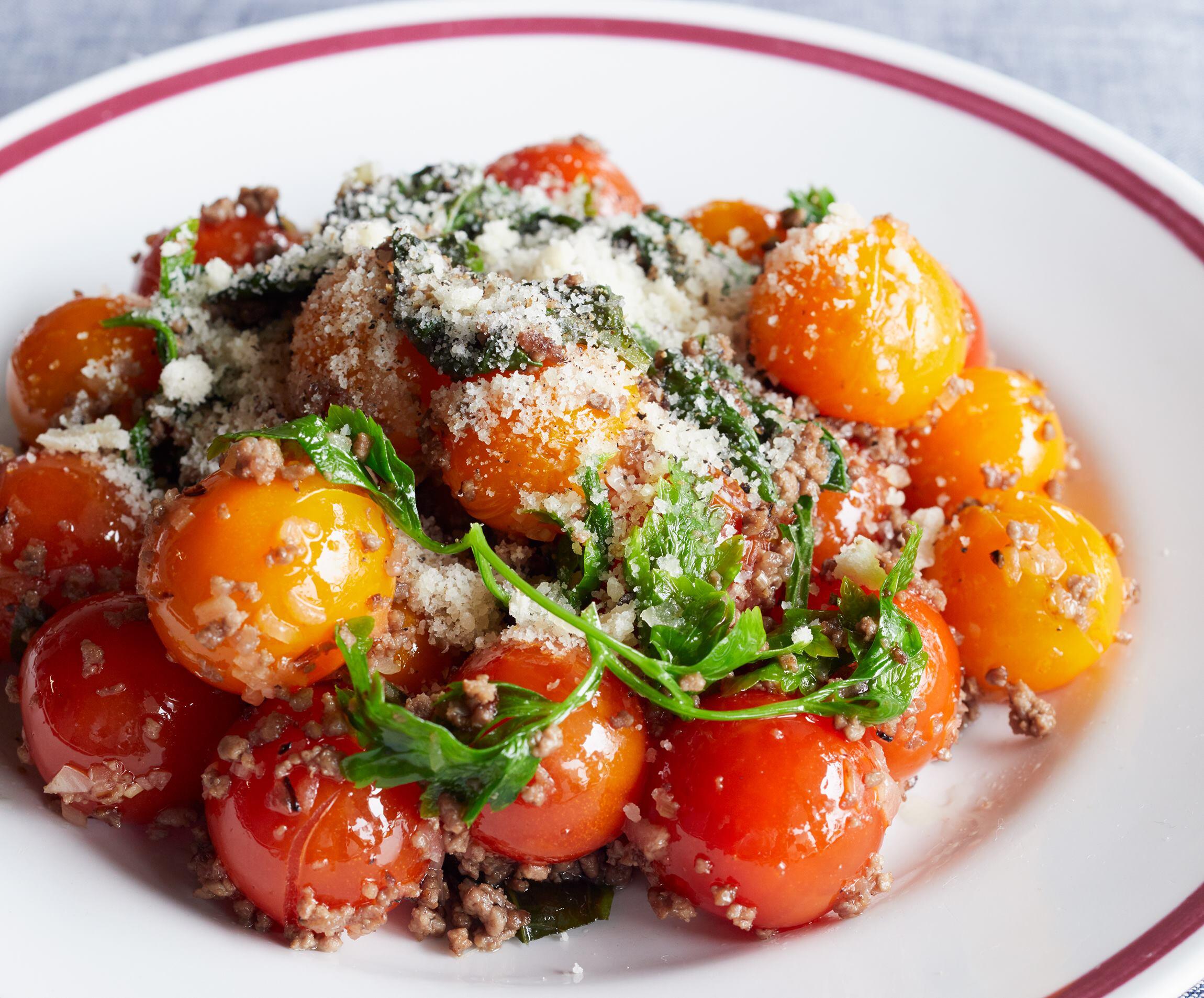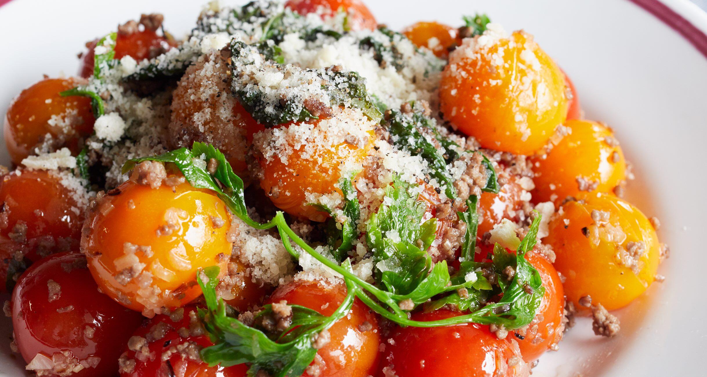 ミニトマトを加えて中火で炒め、皮がはじけたらバジル、イタリアンパセリを加えて炒め、白ワインをふり、塩、胡椒で調味して器に盛り、パルミジャーノチーズをふる。