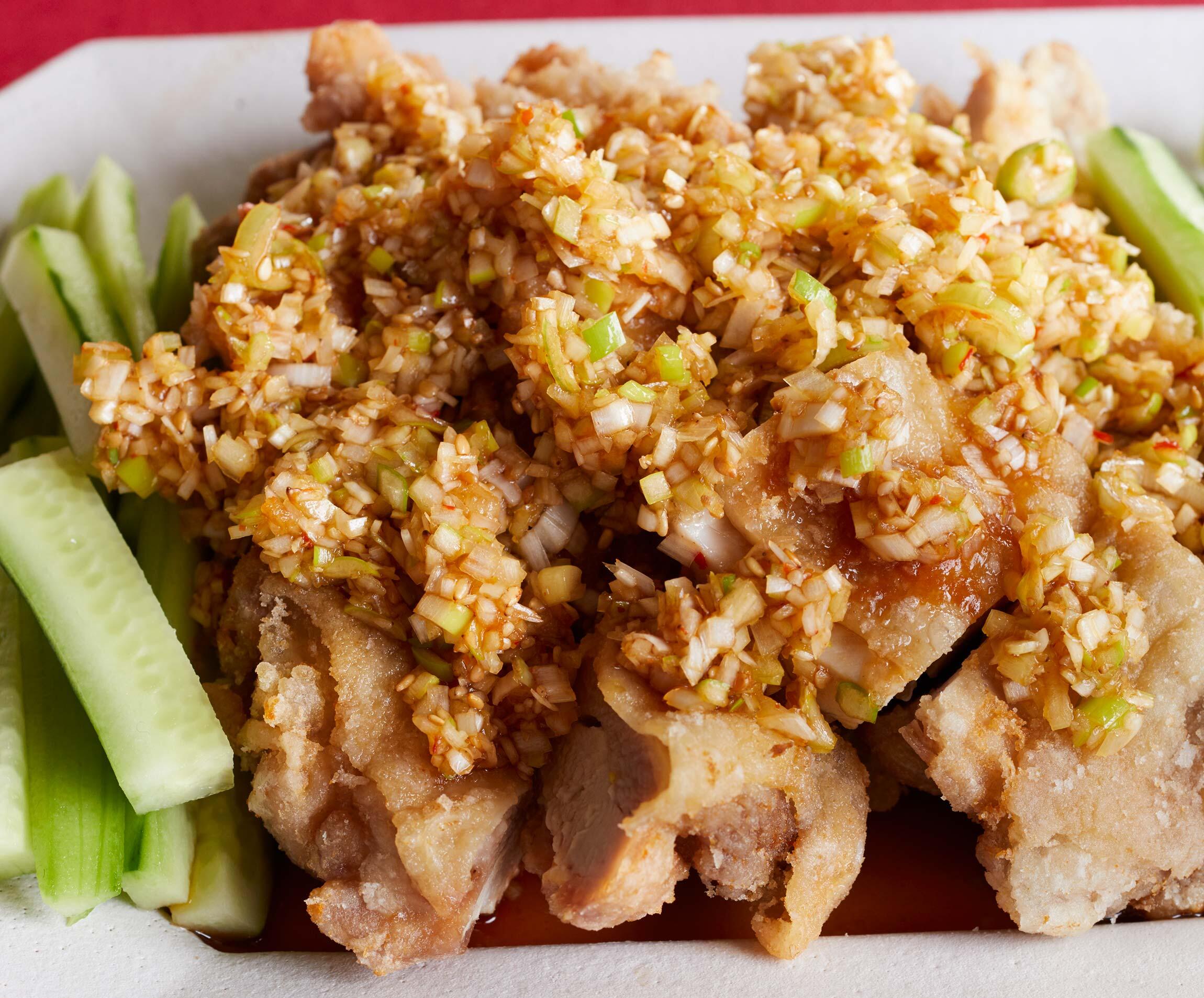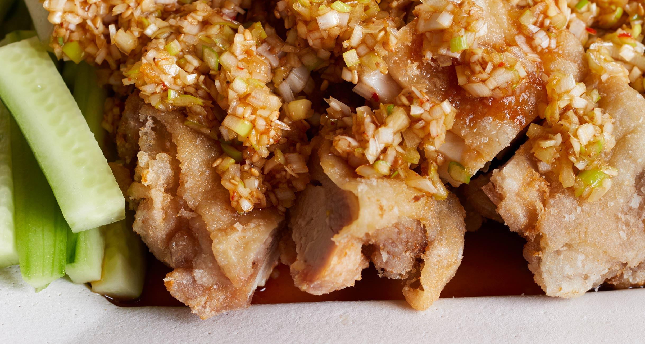じわじわ、ゆっくり揚げてください。外はカリカリ、中はジューシー。大きな塊で揚げるから、この風味に仕上がります。ねぎたっぷりのソースをかけて召し上がれ。