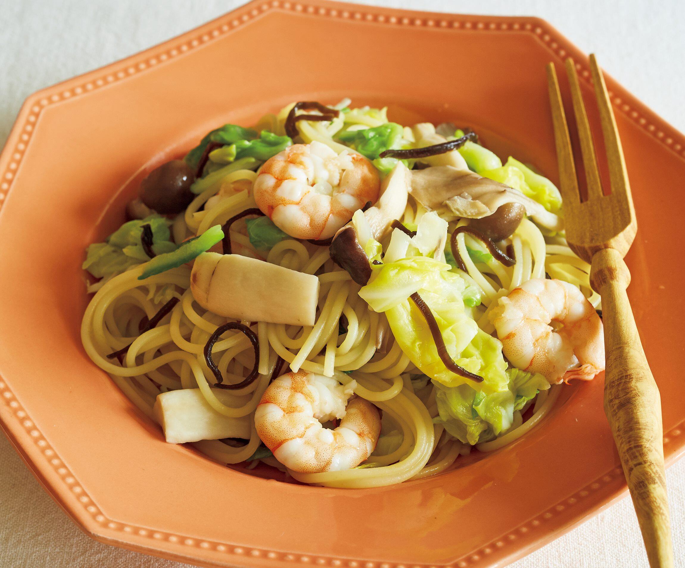 タイマーが鳴ったら3とミックスきのこを入れる。湯が再び煮立ったら、ざく切りキャベツも加え、再度煮立ったら一気にザルにあげる。ゆで汁はきのこや海老の旨味もあるので別途スープなどにしてもいい。