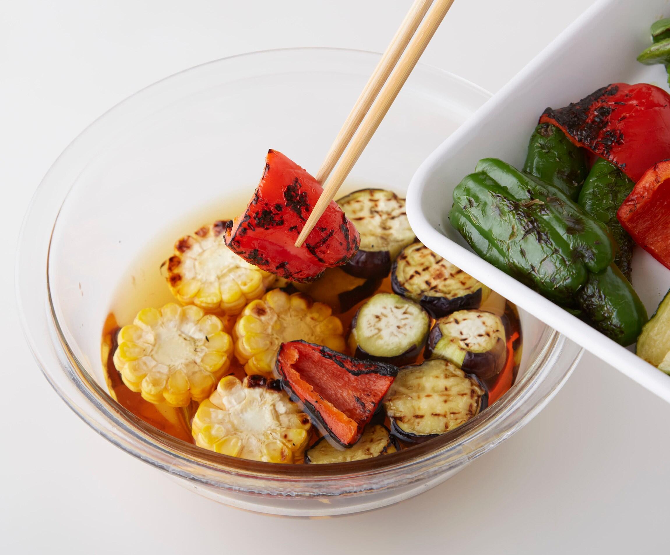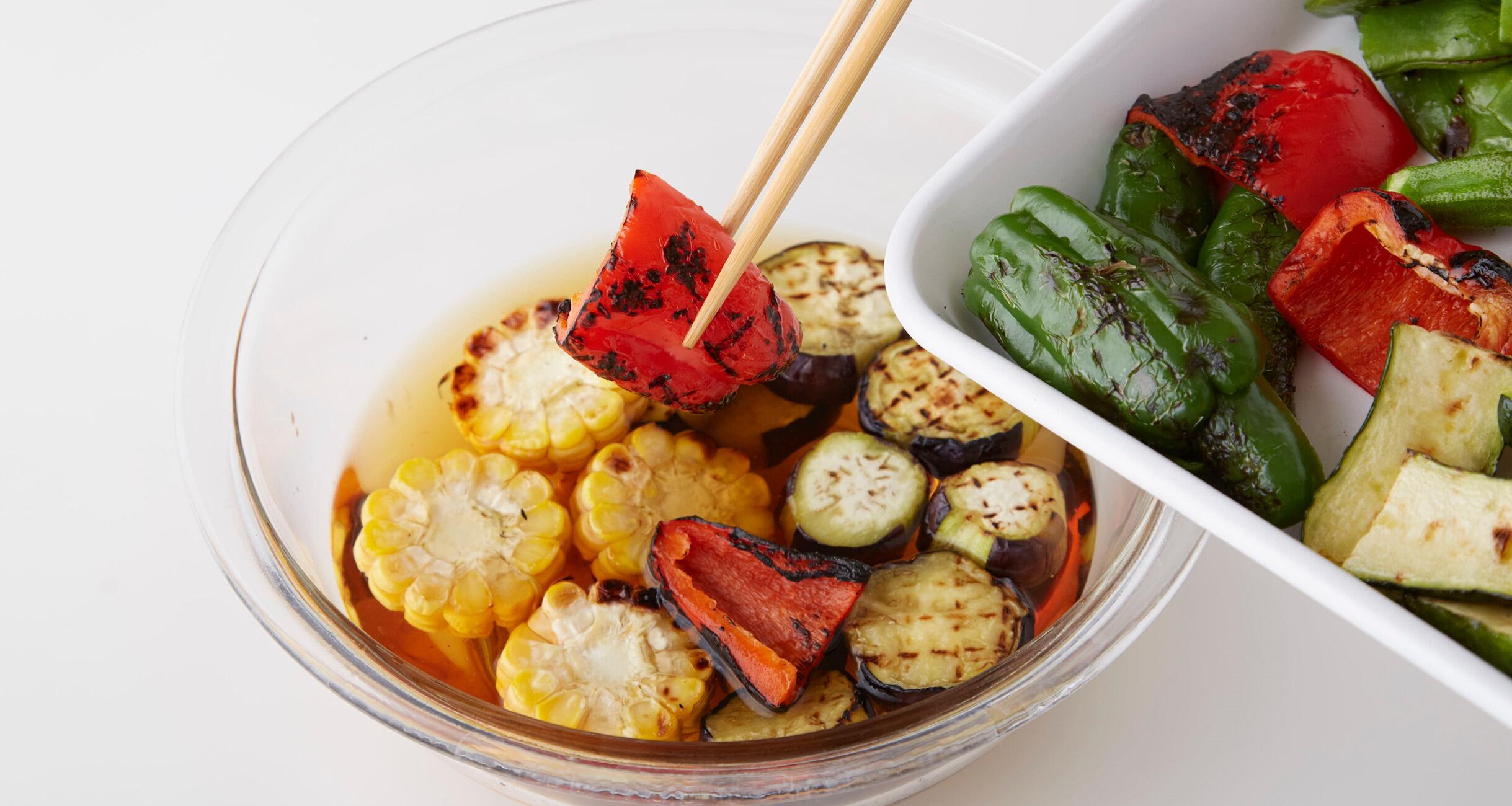シンプルながら失敗なくつくれるレシピに定評がある料理研究家・大庭英子さんに教えてもらった、簡単レシピです。鮮やかな色を引き出す酢力を使った料理で、夏のさっぱりした酒にもぴったり。酢と同量のだし汁でつくるマリネ液に漬け込むので、上品な和テイストに仕上がります。