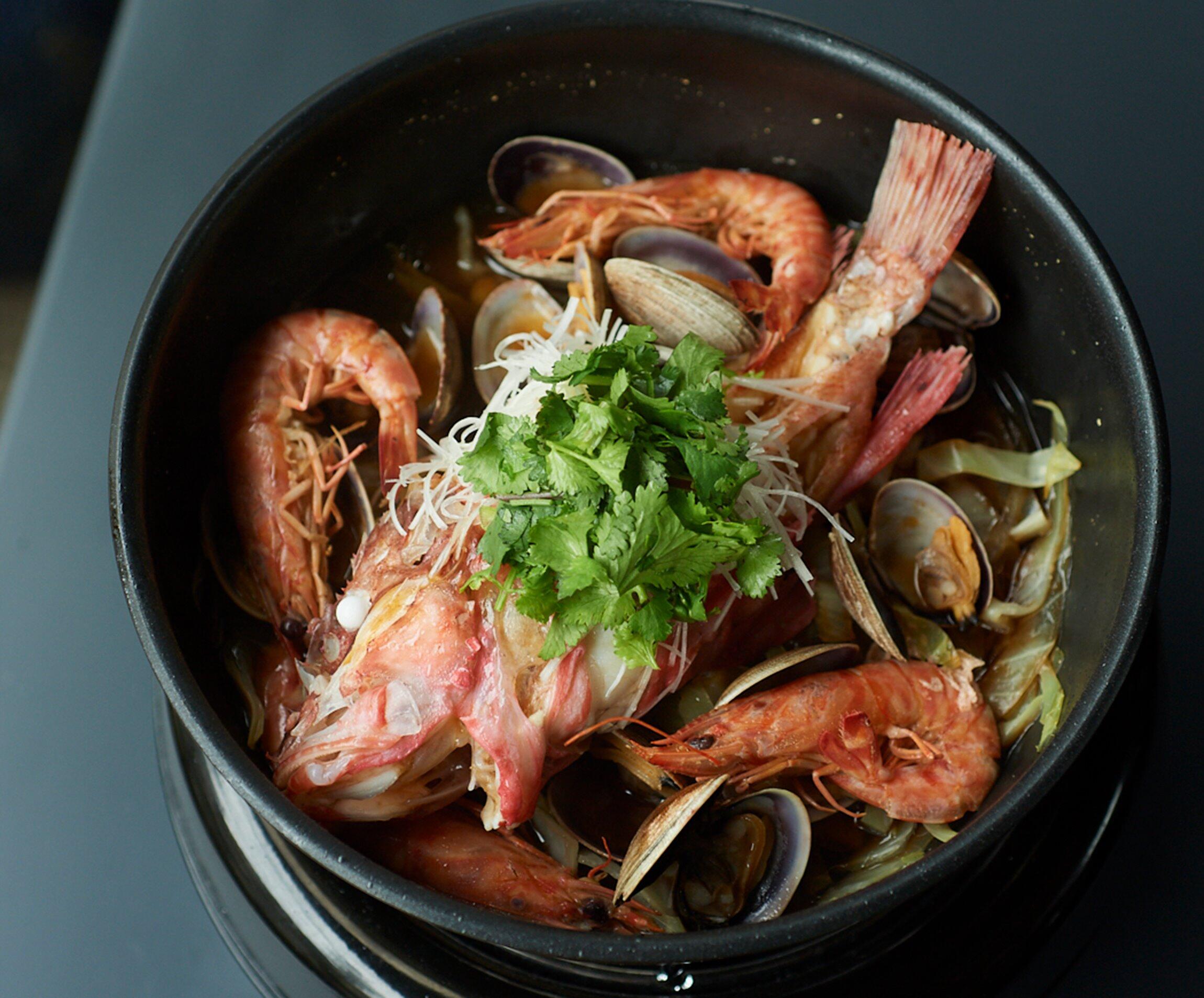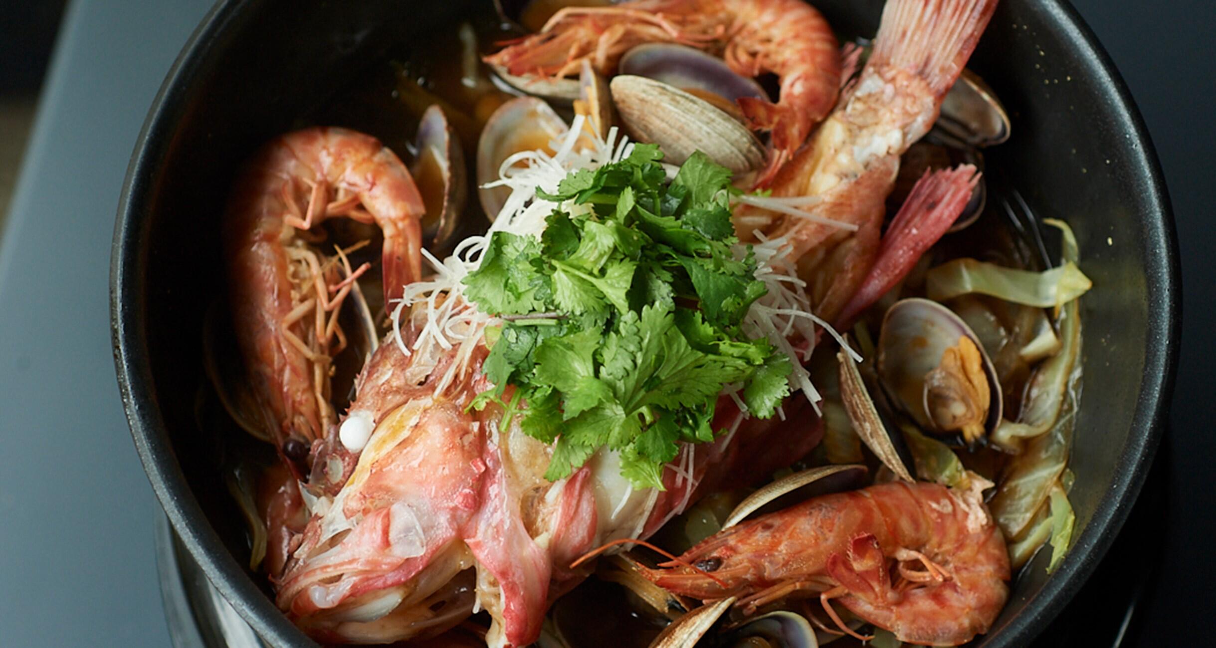 カサゴに紹興酒を回しかけ、水100ml(分量外)を加える。強火にかけて煮汁が煮立ったら、蓋をする。中火に落とし、アサリの殻が開いてカサゴと海老に火が通るまで、8分ほど蒸し煮にする。