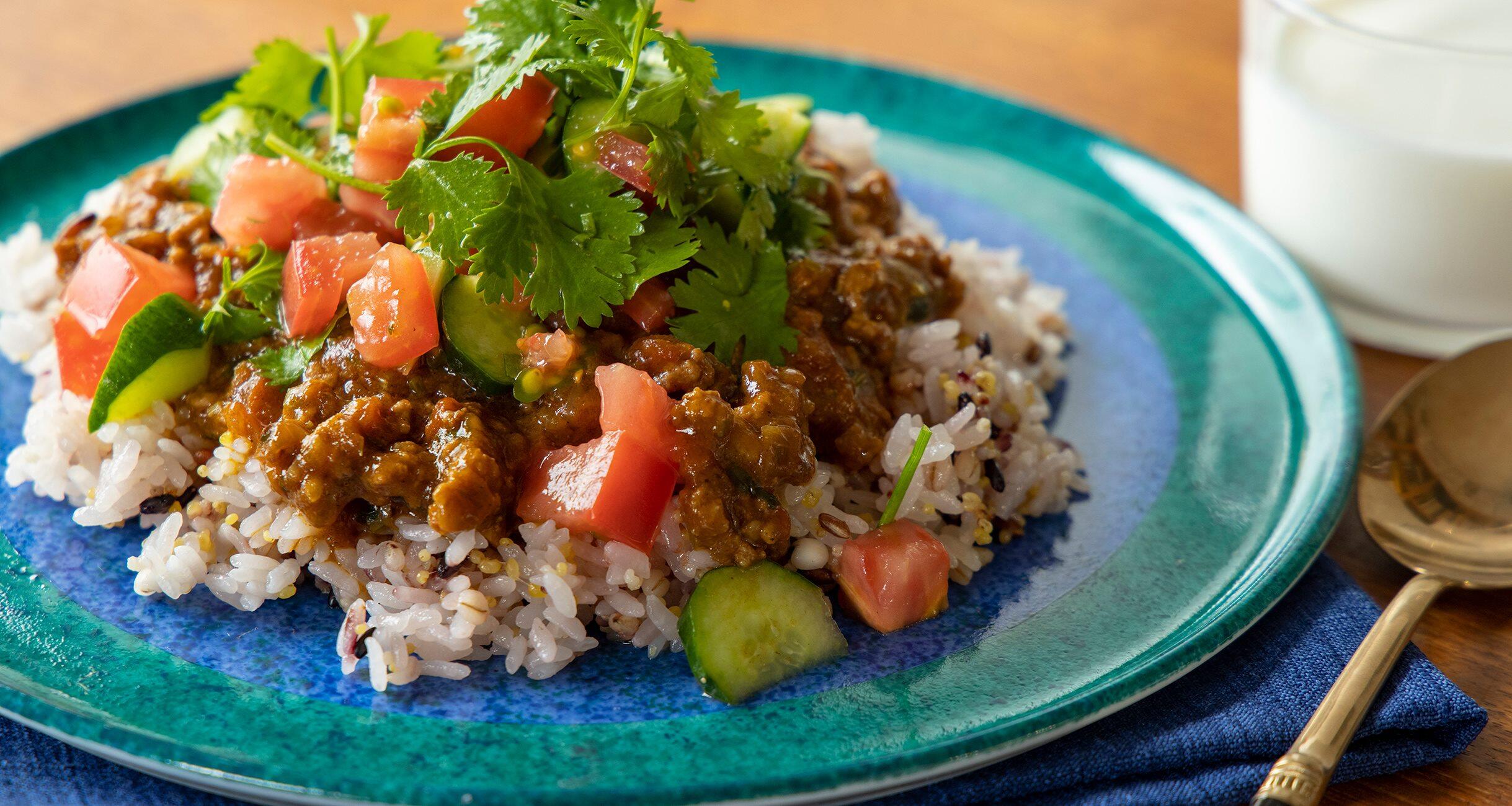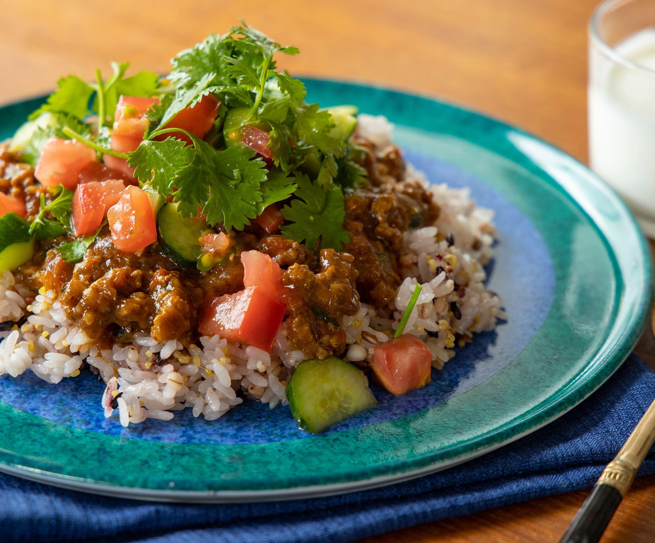 器に雑穀ご飯、③のキーマカレー、④のサルサ、飾り用のパクチーの葉を盛り合わせる。