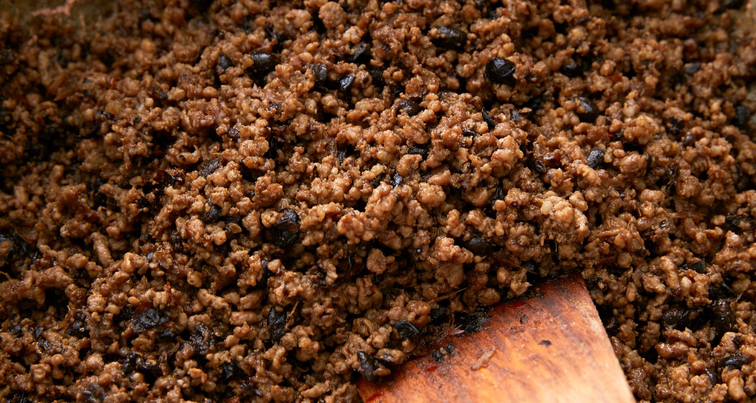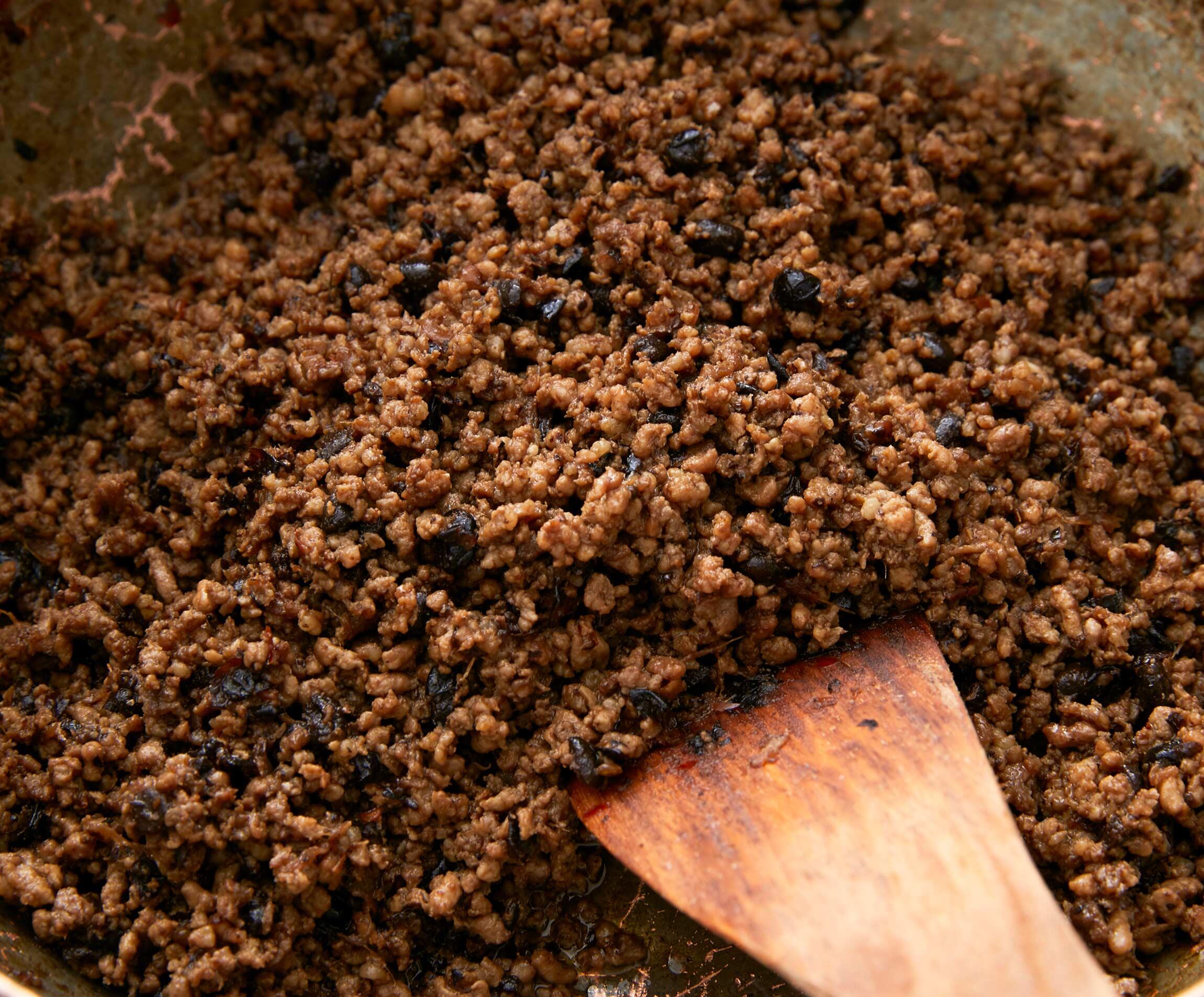 挽き肉も加え、肉から脂がにじみ出てくるまでしっかり炒め、醤油と砂糖を加えて混ぜ合わせる。