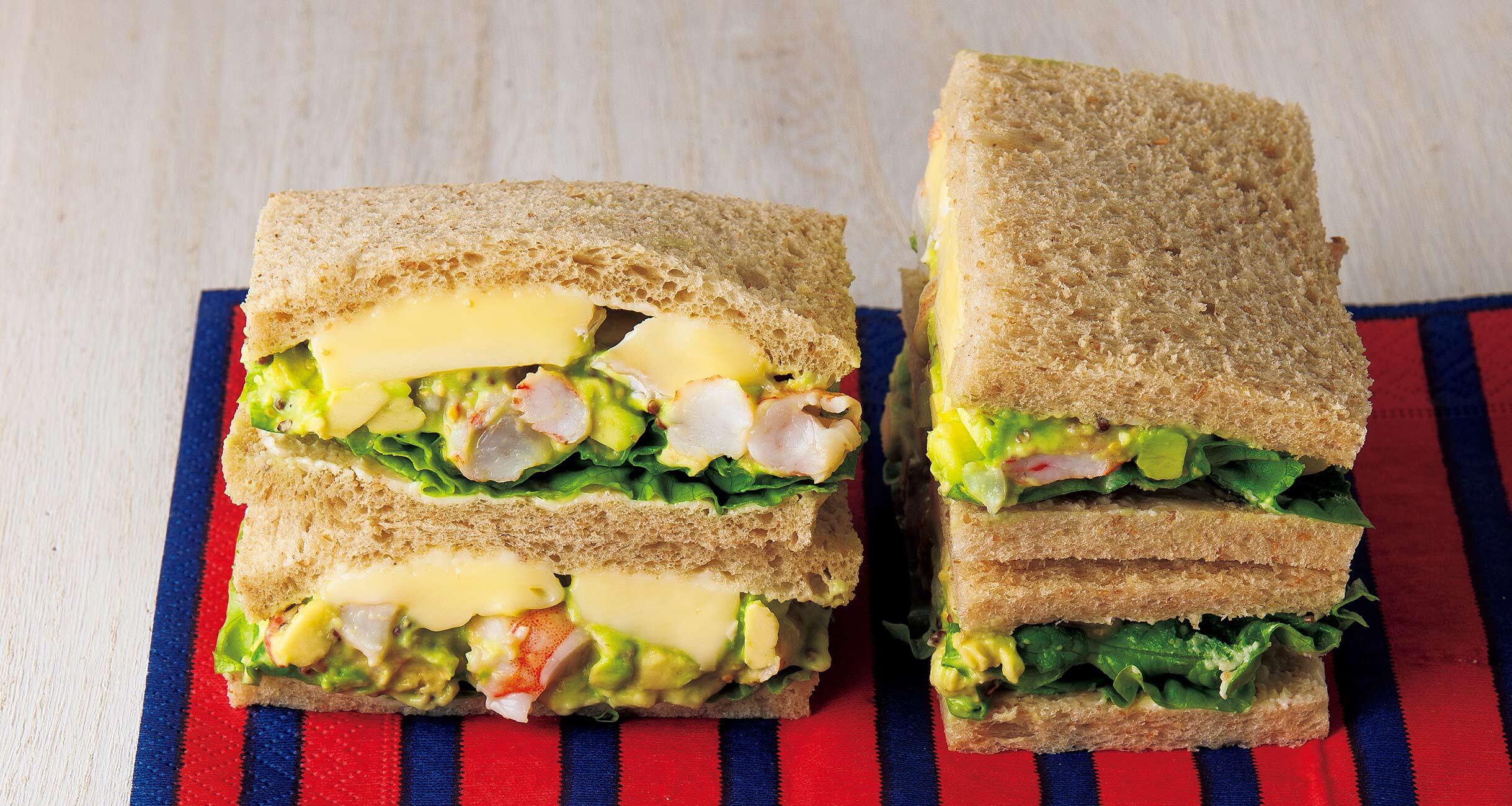 アボカドと海老の黄金コンビを、胚芽入りの旨味が濃い食パンで挟んだリッチな味わいの一品です。そのマイルドでクリーミーな食べ応えをぜひ楽しんでください。季節感を大切にした素材選びと、つくりやすいレシピに定評がある料理研究家の井原裕子さんに満足感たっぷりのサンドイッチを教わりました。