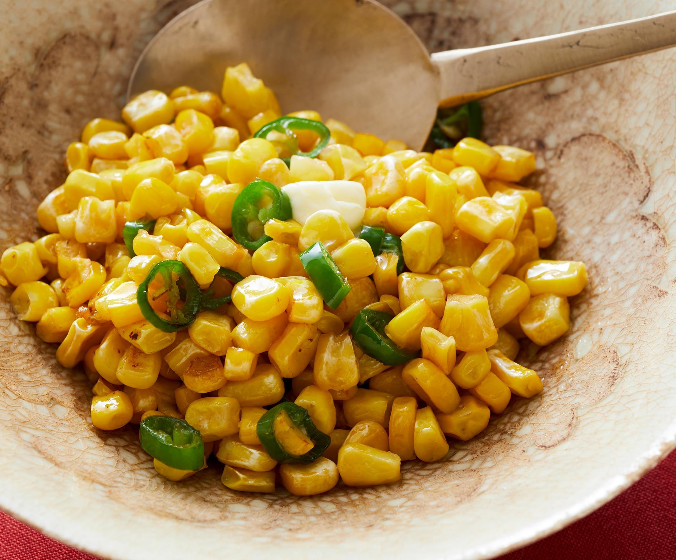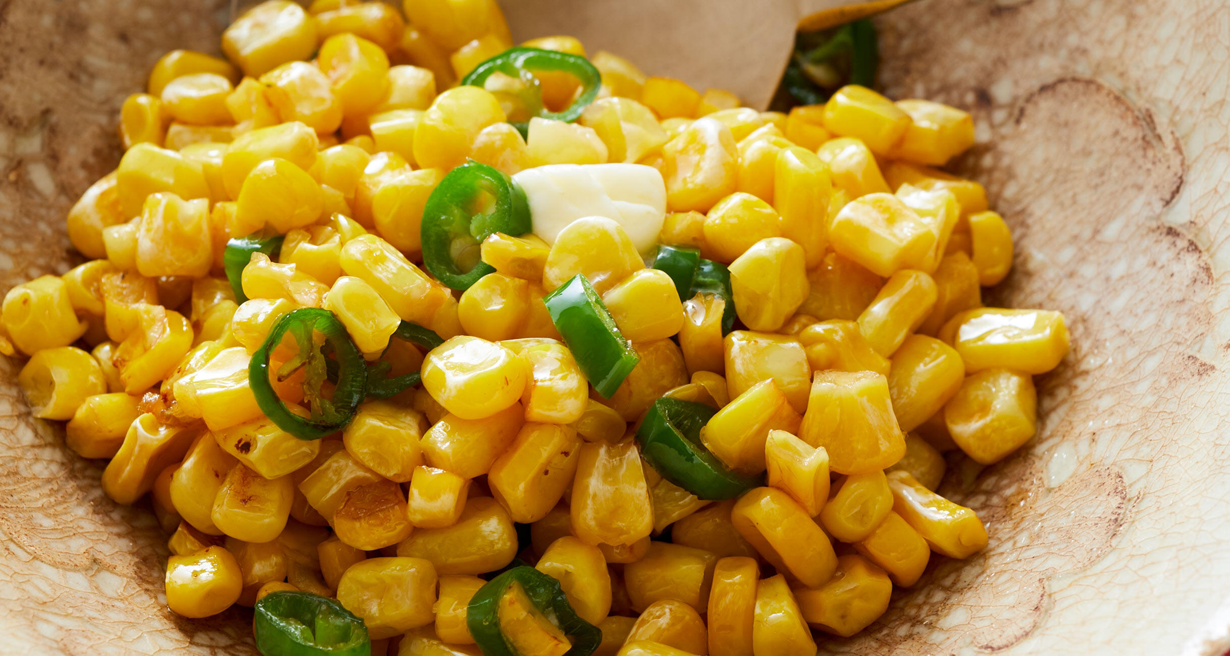 とうもろこしが色鮮やかになり、火が通ったら青唐辛子を入れてさっと炒め合わせ、醤油を加えて好みの味にととのえ、好みでバターを適量加えて混ぜ、器に盛る。