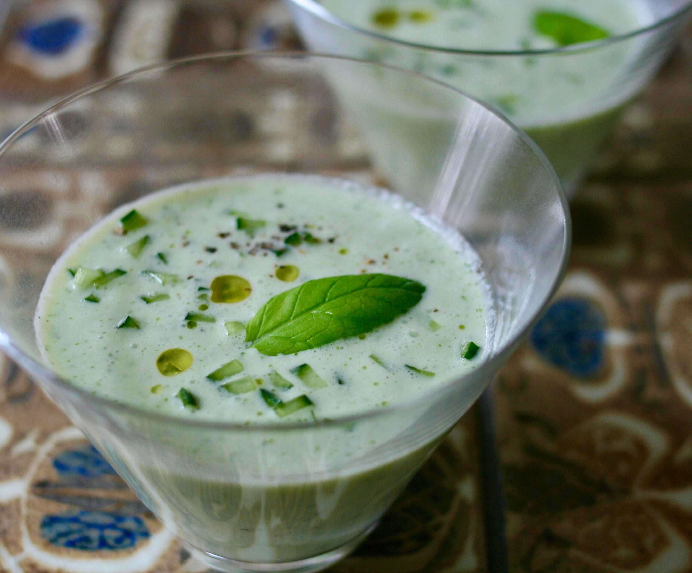オリーブオイルを加え、さっと混ぜて、え???はい、もう完成なのです。器に注ぎ、みじん切りにしたきゅうり(分量外)、ミントの葉を飾り、オリーブオイルを一筋垂らしてから、召し上がれ。