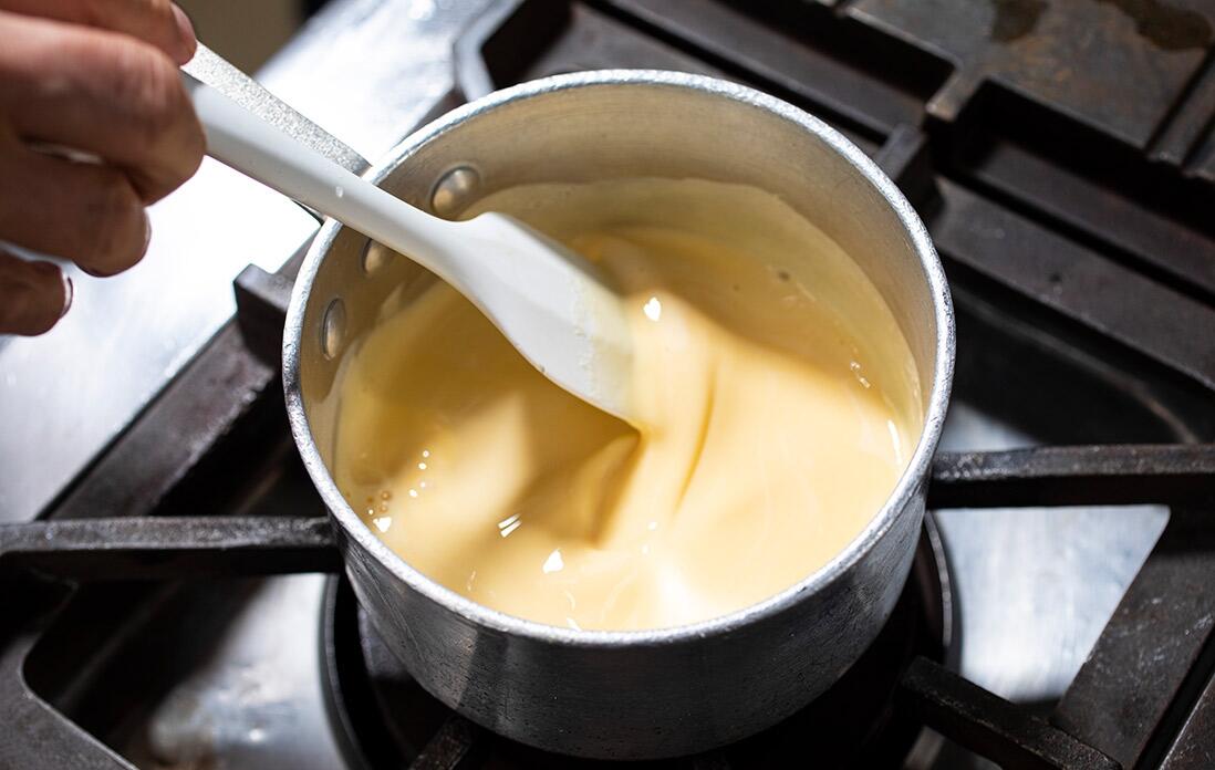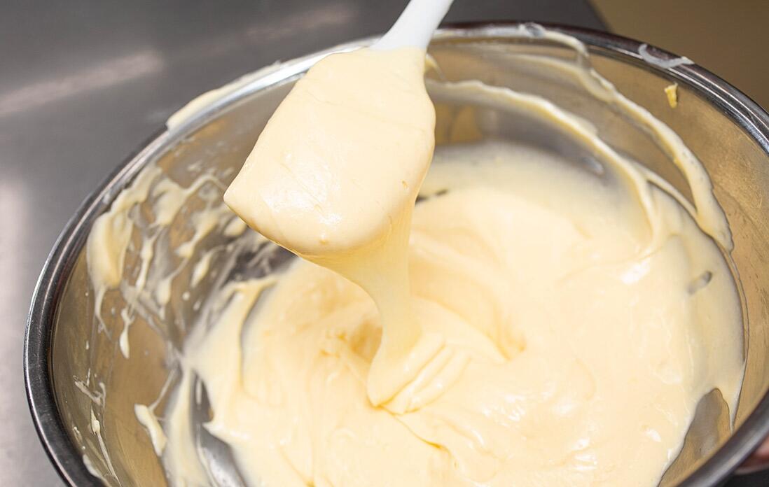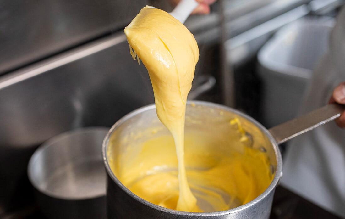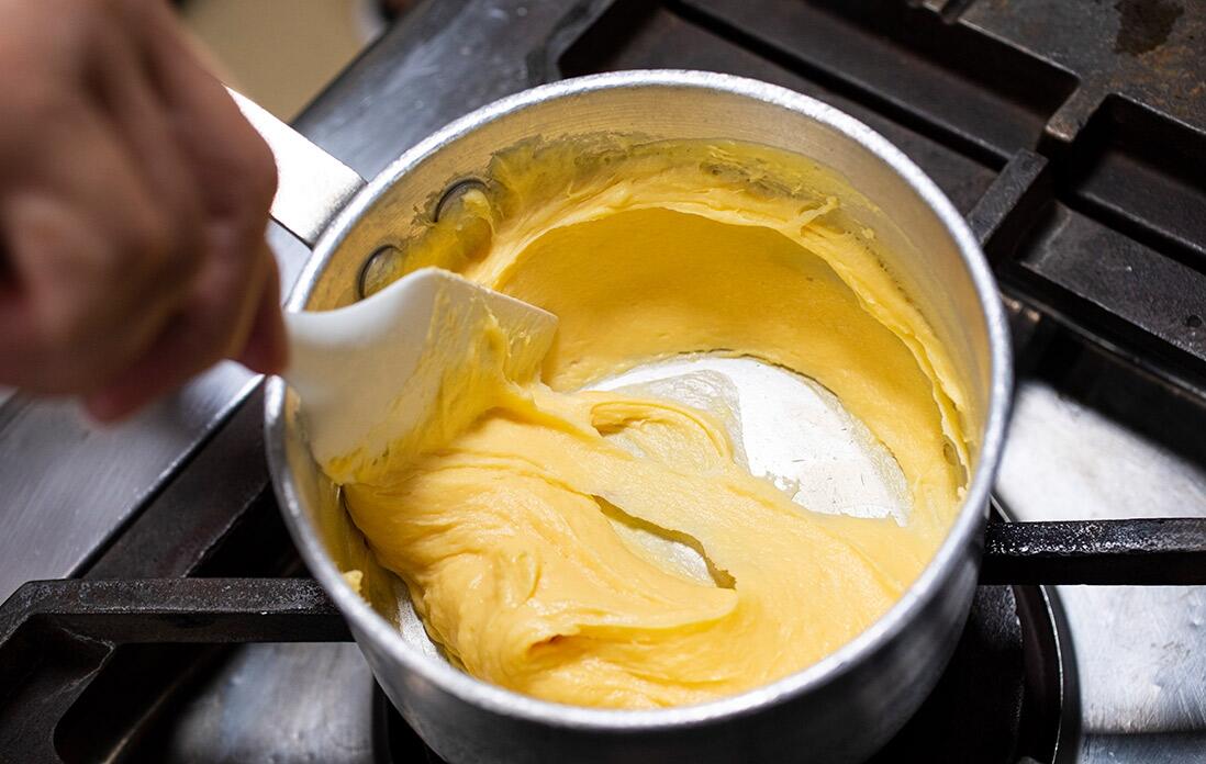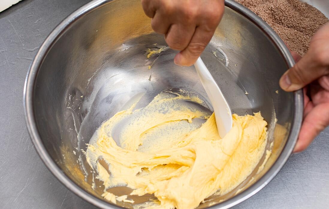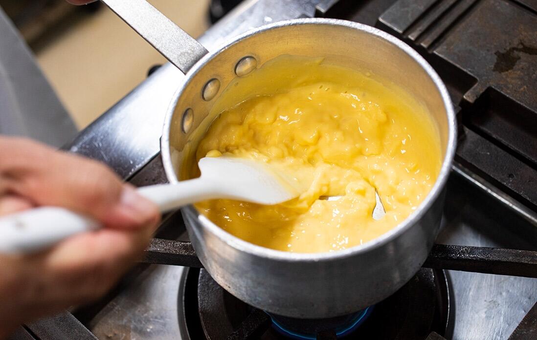 「注意点は、湯煎にかける際のお湯の温度。熱すぎると卵がかえってかたまっちゃうからね。あとは、バターを加える際に分離しないようにしっかり混ぜて乳化させ、滑らかな生地にすることだね」と西野シェフは語る。