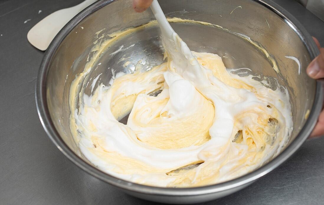 メレンゲを生地に合わせたら、すばやく型に流し込んで焼き上げること。
