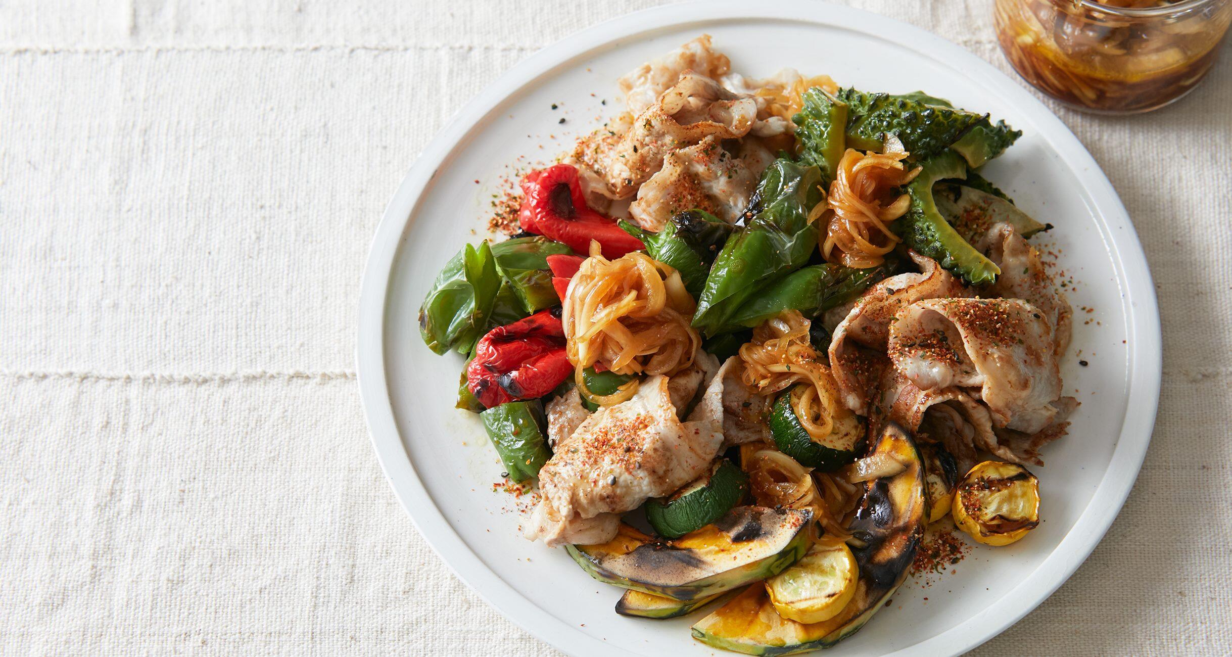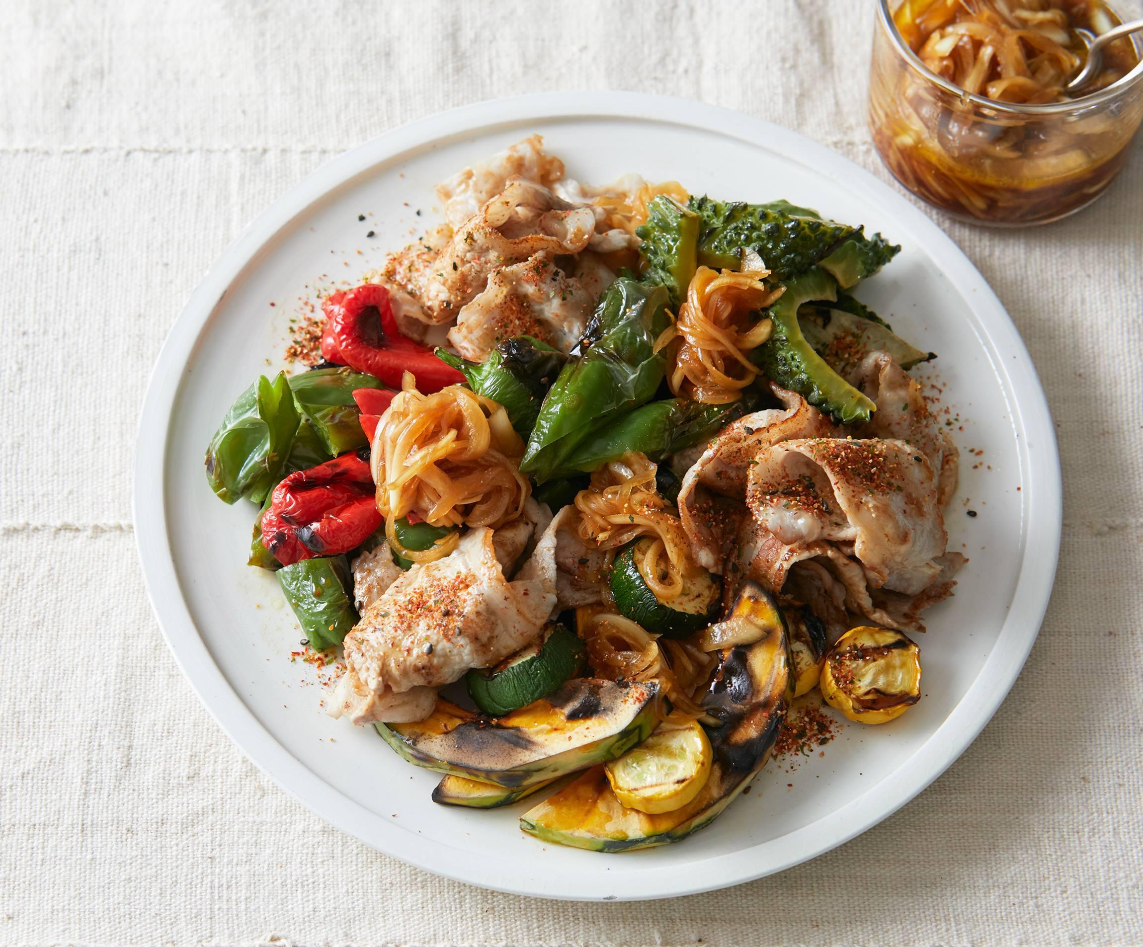 ピーマンのスパイシーな香り、ゴーヤーの苦味、かぼちゃの甘味etc.少し焦がし気味に焼いた夏野菜を堪能してください。夏に食べたい豚肉と合わせて元気度倍増。