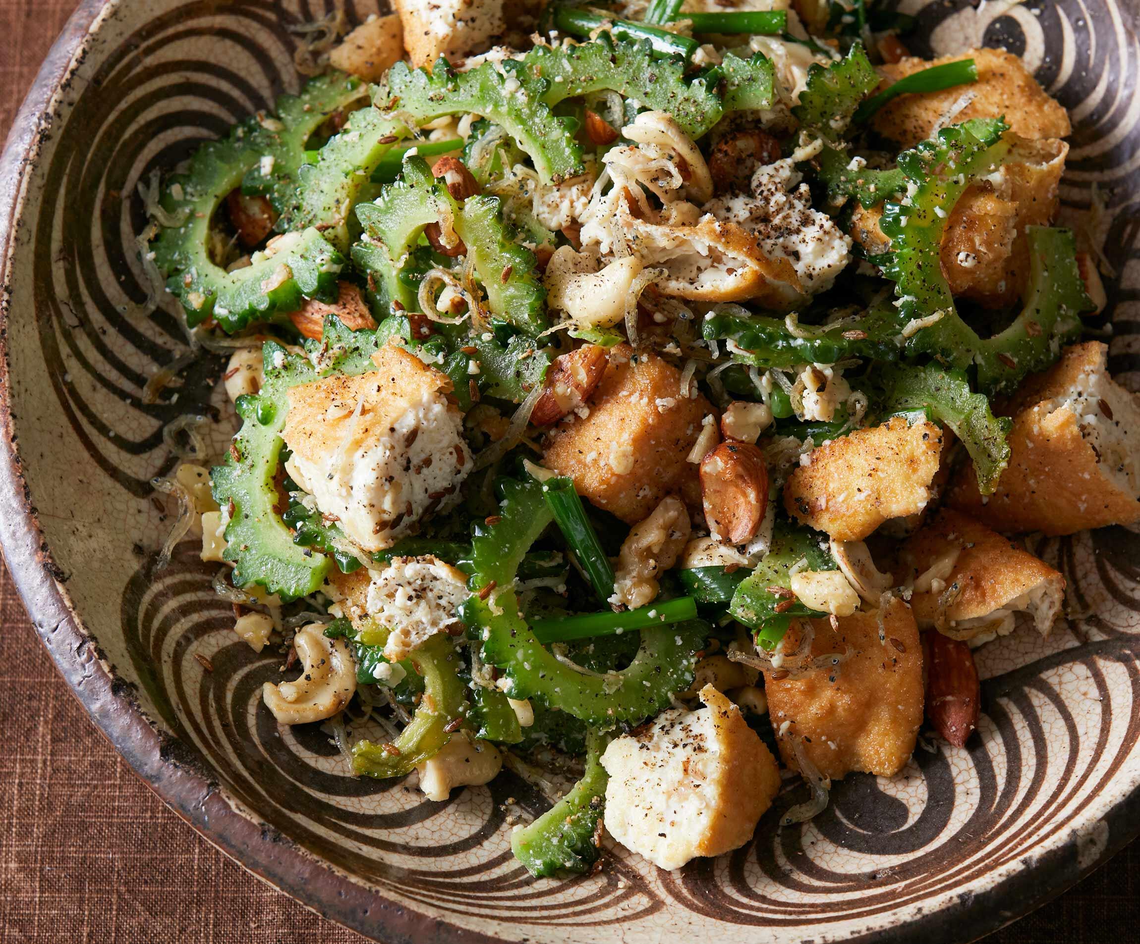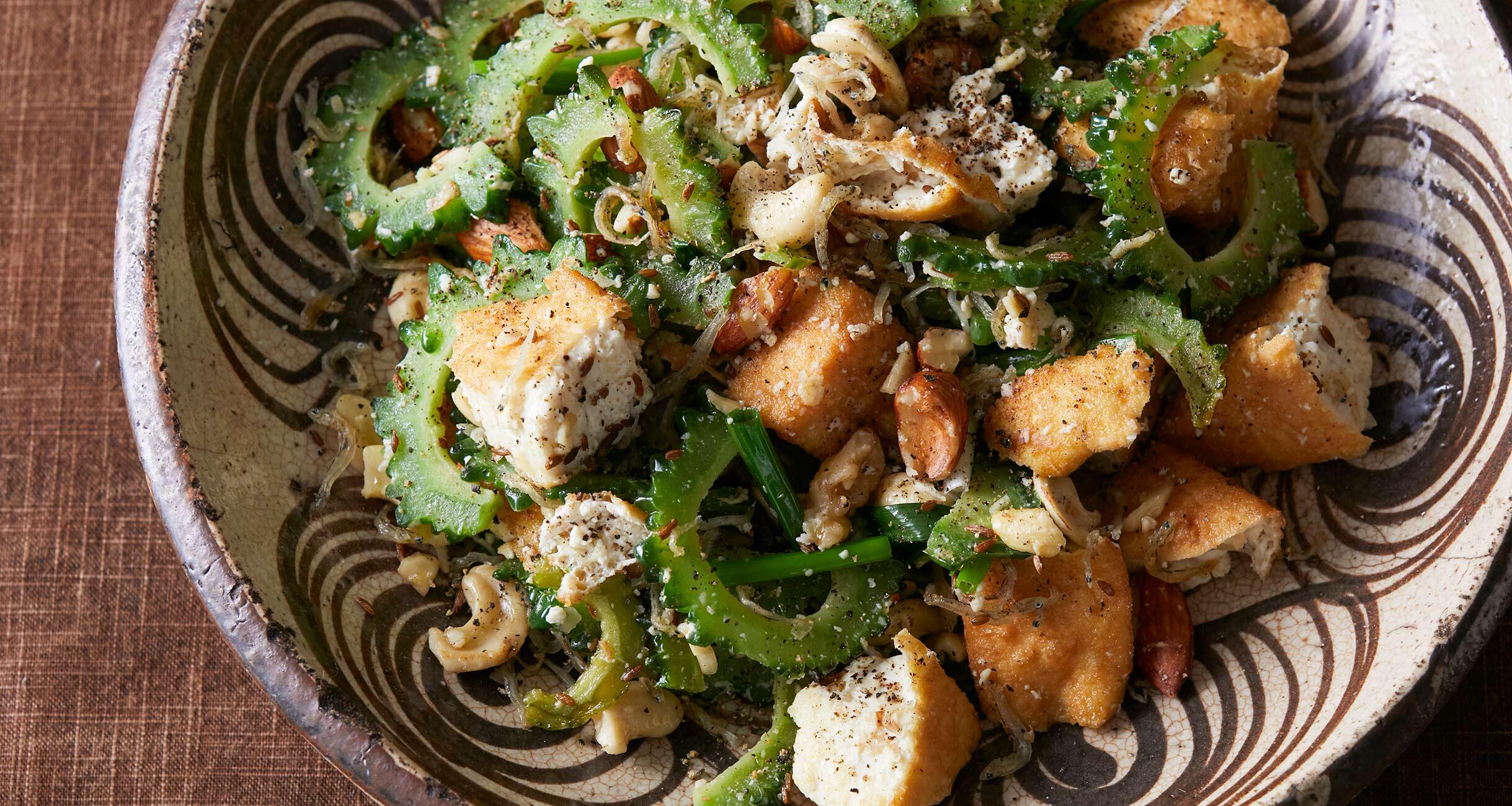ミックスナッツは粗く刻む。ゴーヤーは縦半分に切って種とワタを除き、厚さ2~3mmの半月切りにする。小ねぎは長さ3cmに切る。厚揚げは包丁ですぱっと切らず、コップの縁などを使って一口大にちぎる。