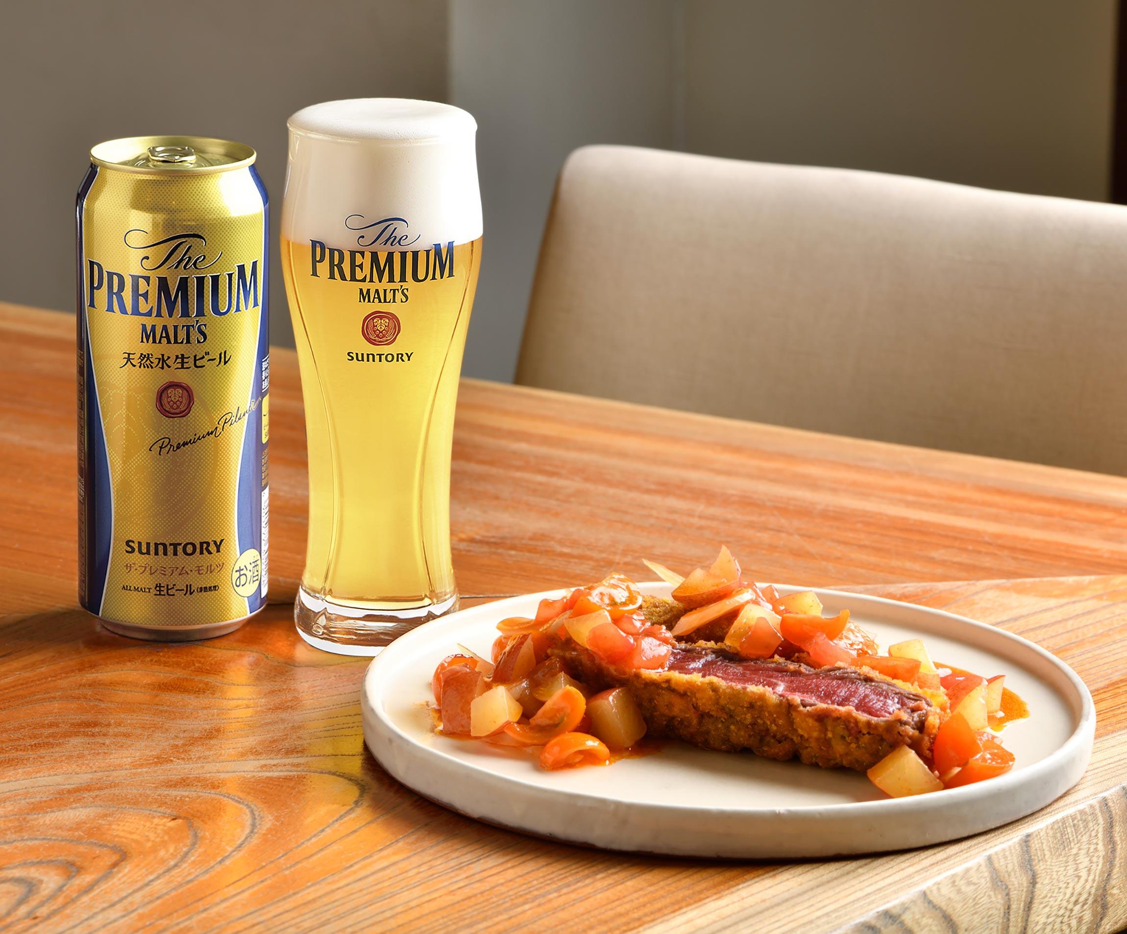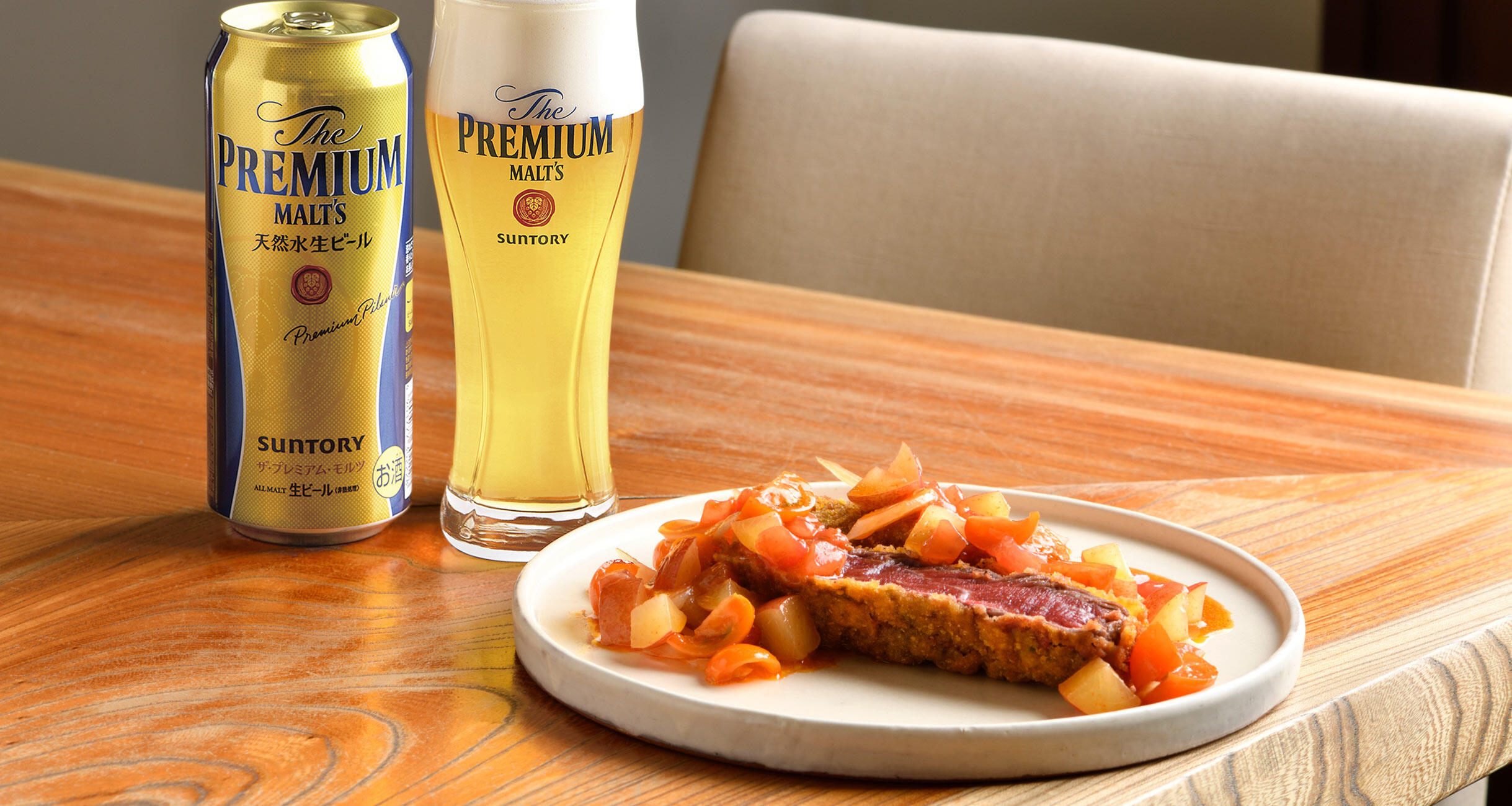 さっそくプレモルで喉を潤す。ビフカツを頬張れば、コーンフレーク衣のザクッ、塩の粒のガリッという食感が脳を刺激する。やがて噛むほどに広がる牛肉の力強い旨味。万能サルサはビフカツと一緒はもちろん、それだけ食べても実に旨い。「これらがビールを誘う(笑)。サルサに効かせた、フルーツのほのかな酸味や甘味がプレモルの豊かな香りやほろ苦さを受け止め、味わいに奥行きが出ます」とご満悦。プレモルの家飲みは大人の至福である。