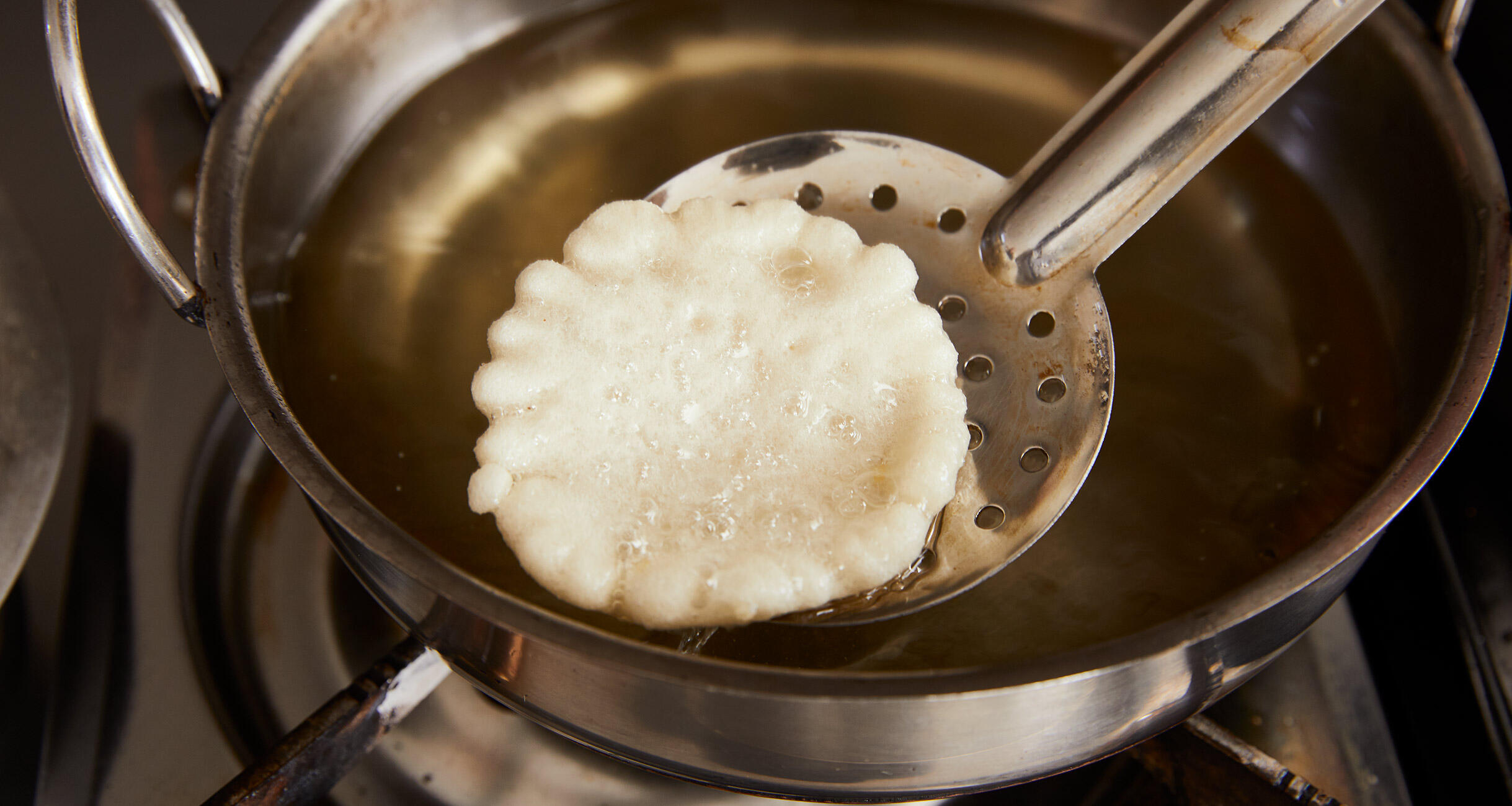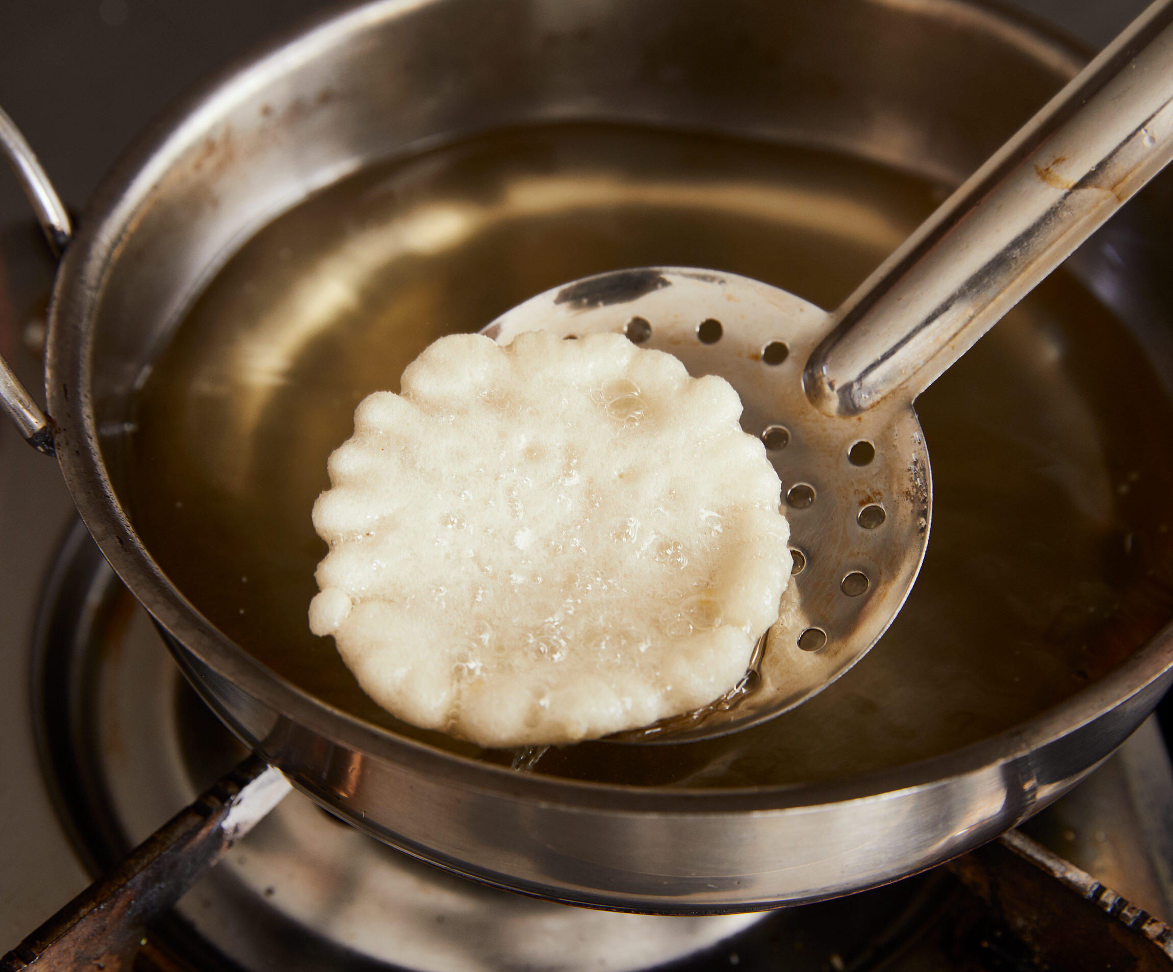 南インドには、米と豆の生地でつくるカレーのお供がたくさん。パニヤラムは、たこ焼きのように丸くきつね色に焼くクリ・パニヤラムと、焦がさずに揚げるベーライ(白いの意)・パニヤラムがある。熱い油をかけながら揚げ、フリル状に仕上げるのがポイント。ちぎってカレーなどをつけて食べる。