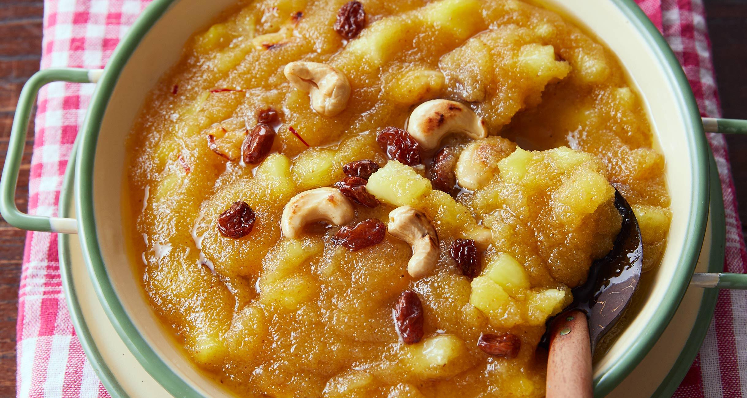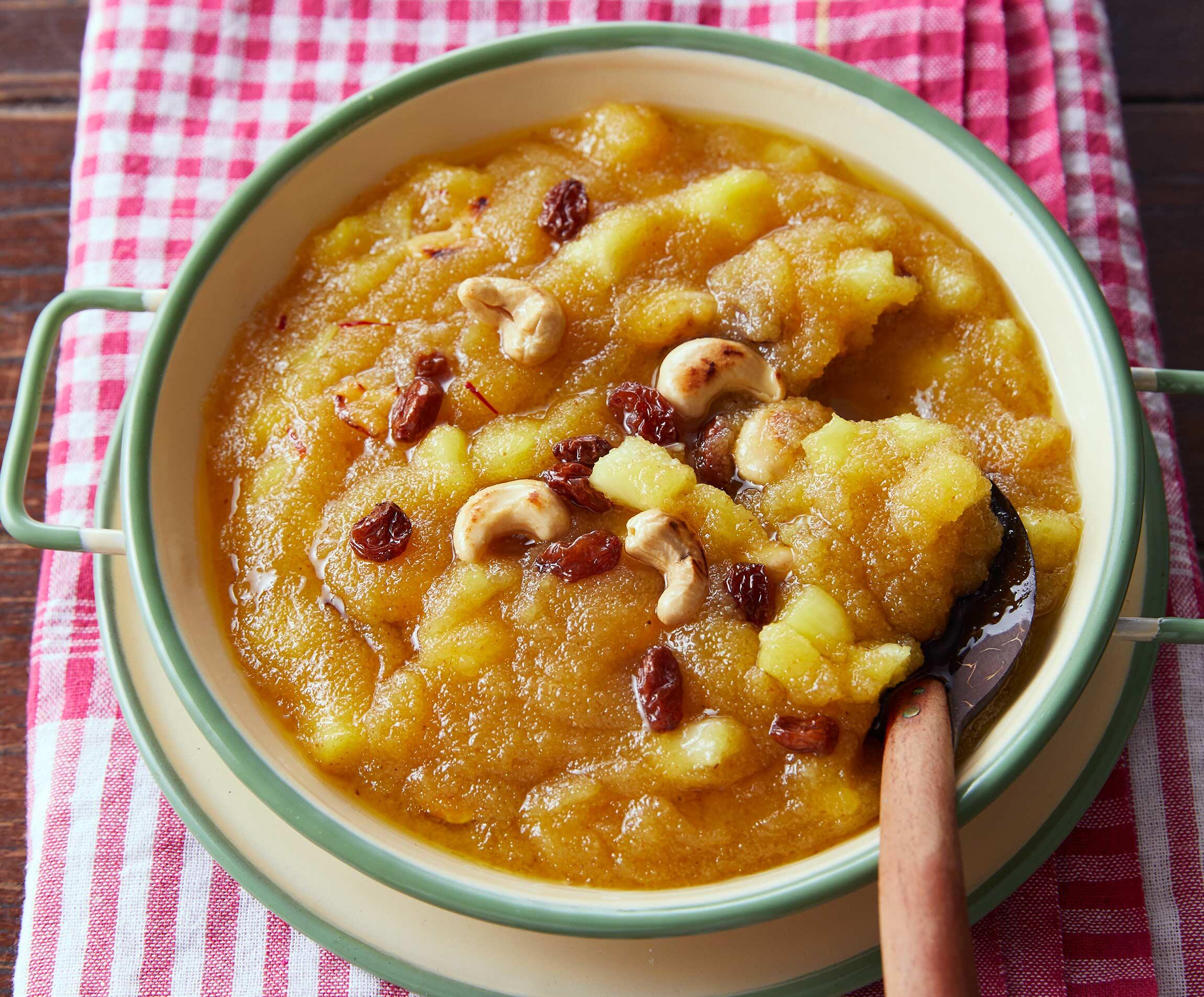 スージ粉でギーを練り上げ、サフランとパイナップルの高貴な香りと酸味を添える熱々でリッチなデザート。これは、伝統料理が現代に受け継がれている、カルナータカ州ウドゥピのスタイル。仕上げのギーもたっぷり。
