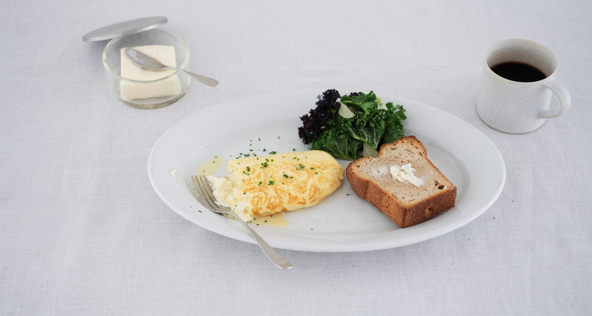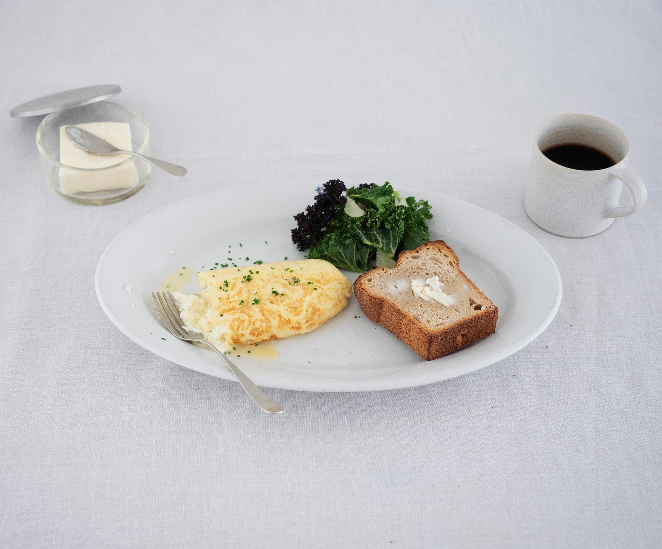 オーバルの大皿をおもちの人は、盛り皿として使用することが多いのではないでしょうか。でもこうして、朝ごはんなどのときに1人分の料理を盛り合わせるワンプレート使いもおすすめです。人数分揃えなくても、それぞれが違うオーバル皿を使うのも楽しいですよ。オムレツは卵を丁寧に溶き混ぜることで、ふんわり、なめらかな食感に。パンは、ちぎりながらオムレツやサラダとともに食べることを想定し、手前に盛りつけて。