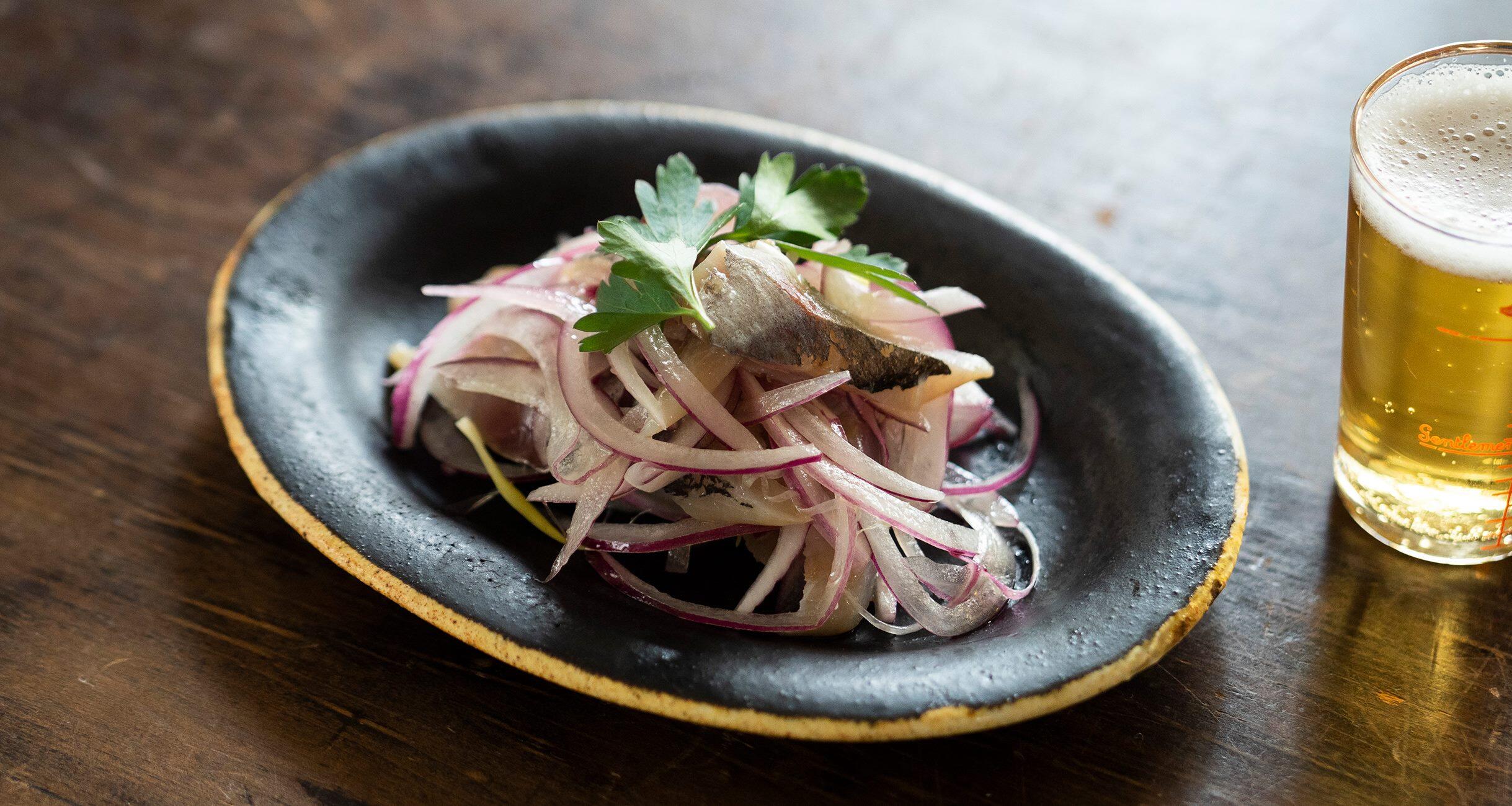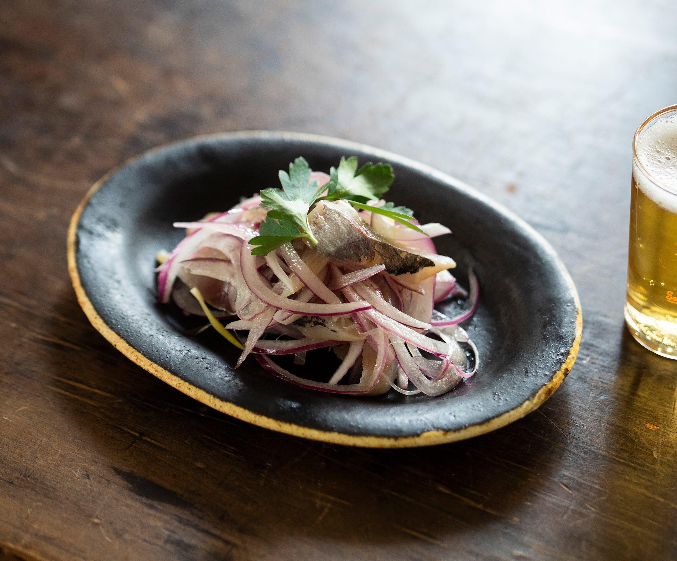 自家製〆あじに玉ねぎやナッツ、オレンジを合わせた酒の肴のような小皿料理も、オーバル皿に盛るだけでちょっとおしゃれな雰囲気に。見ばえよく盛りつけるには、なるべく中央がこんもりするように高さを出すのがポイントです。特にこんな墨色だと特別感が出て、洗練された印象に。夏野菜のようなカラフルな食材も映えます。