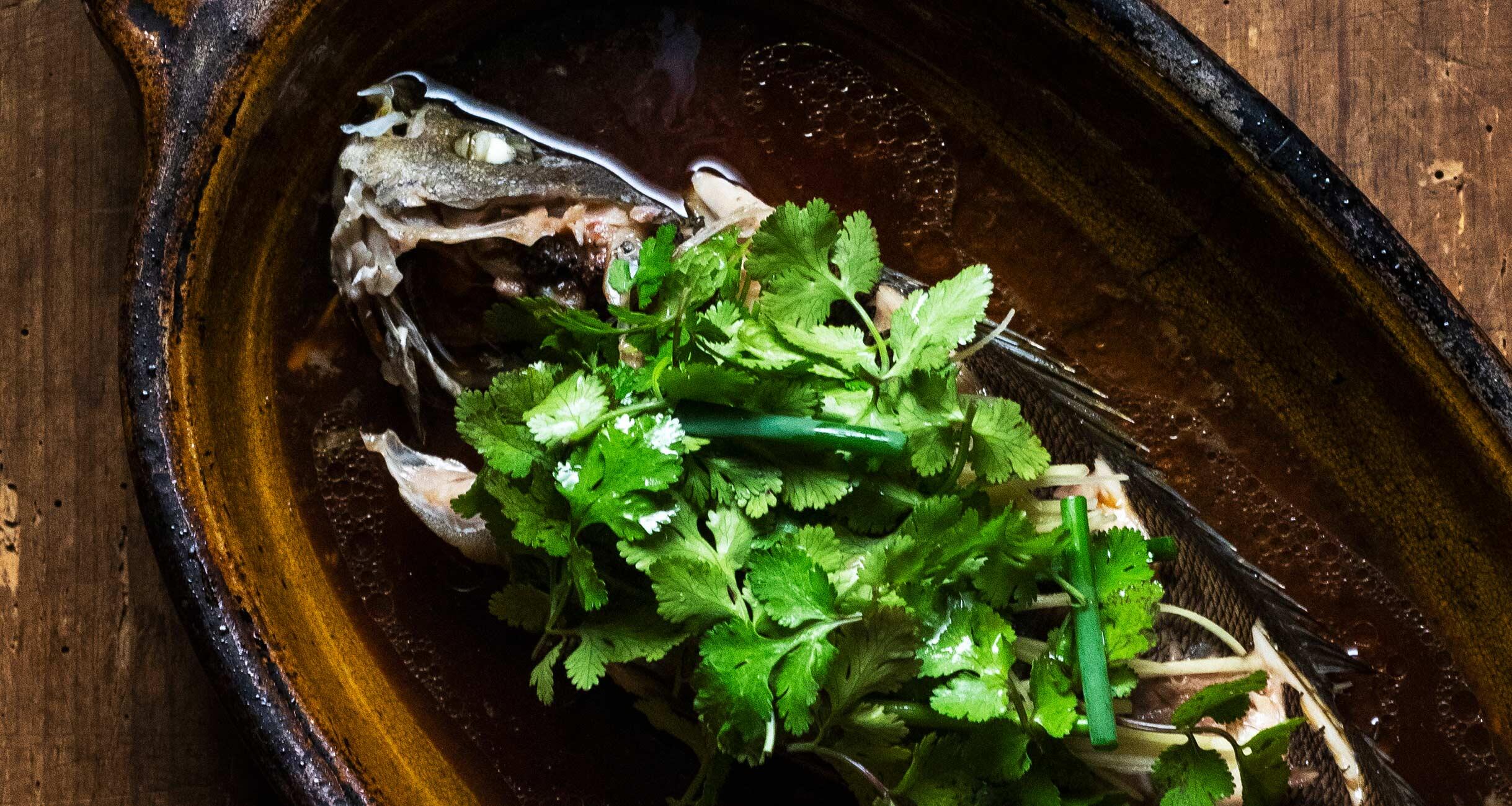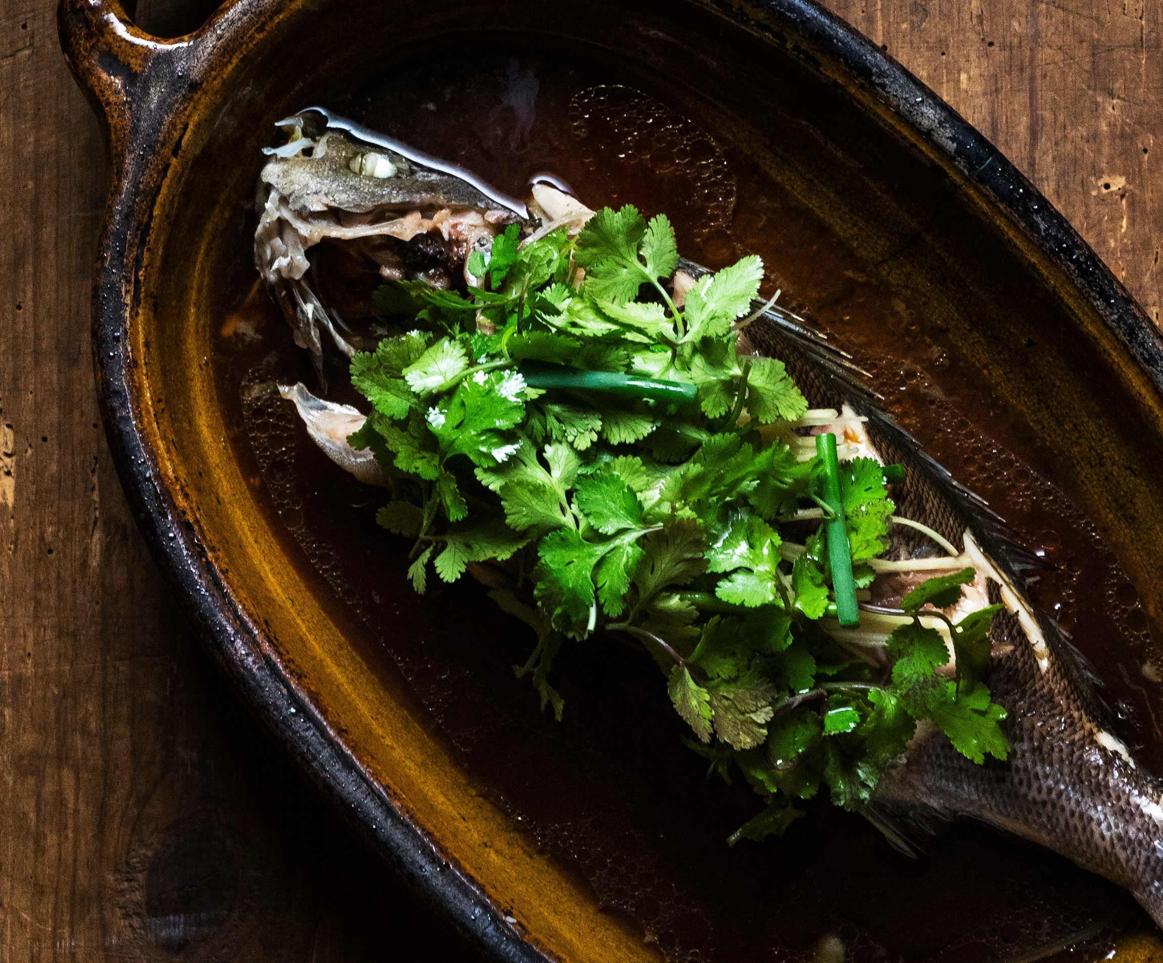 尾頭つきの魚を一尾丸ごと使った料理は、おもてなしにもってこいの華やかさ。もともとヨーロッパの楕円形の器や鍋は、細長い魚の姿が収まるようにつくられたものも多いんですよ。香味野菜と一緒にふっくらと蒸した魚に、熱した甘じょっぱいたれをジュッとかけると、食欲を刺激する豊かな香りが立ちのぼります。