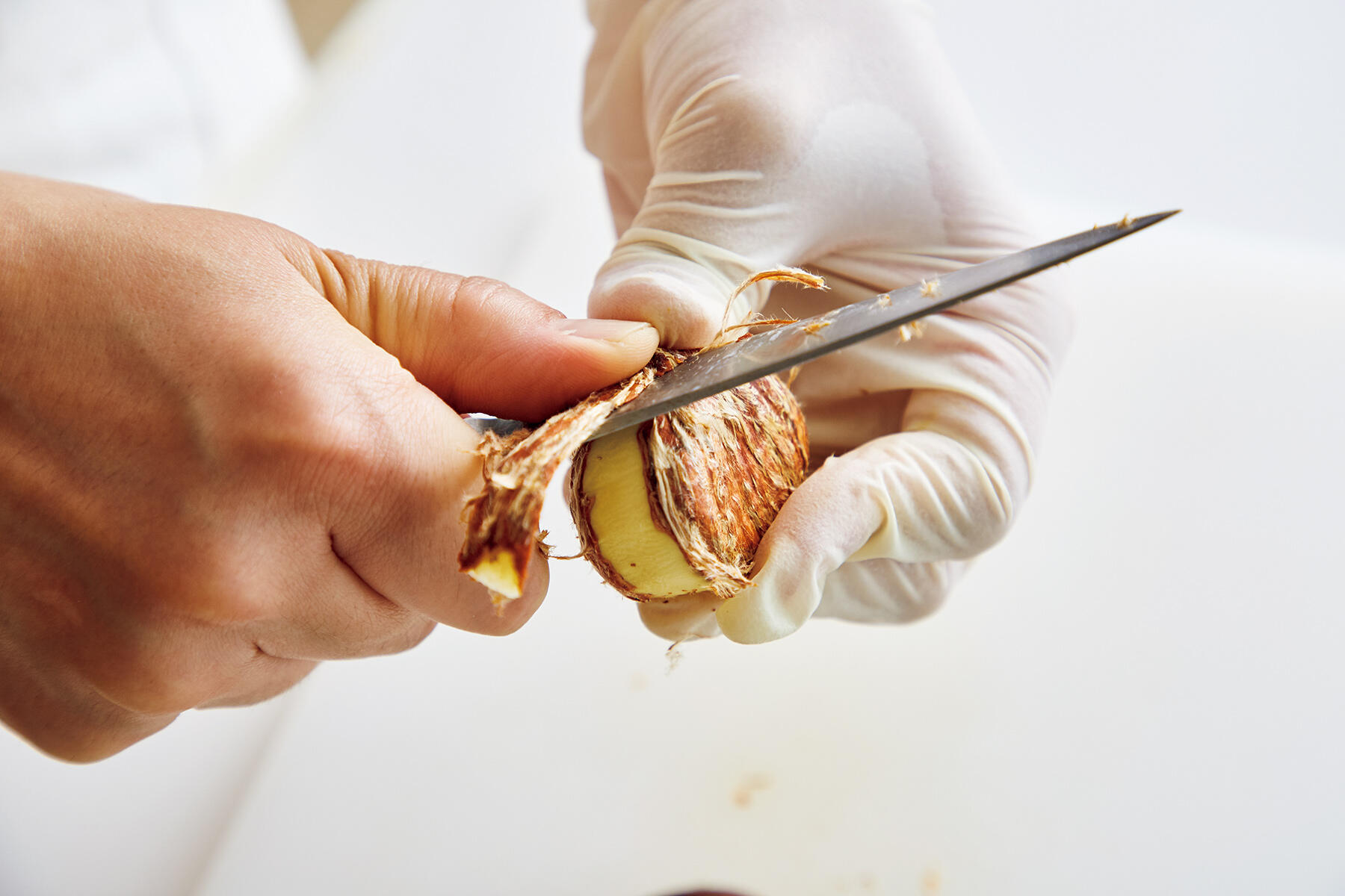 お湯につけておいた栗のおしりのかたい部分を切り落とす。切り落とした部分から、包丁にひっかけるようにして鬼皮をはがす。鬼皮を取ったら、渋皮を包丁でむいていく。全体的に力がいるので手を切らないよう注意。