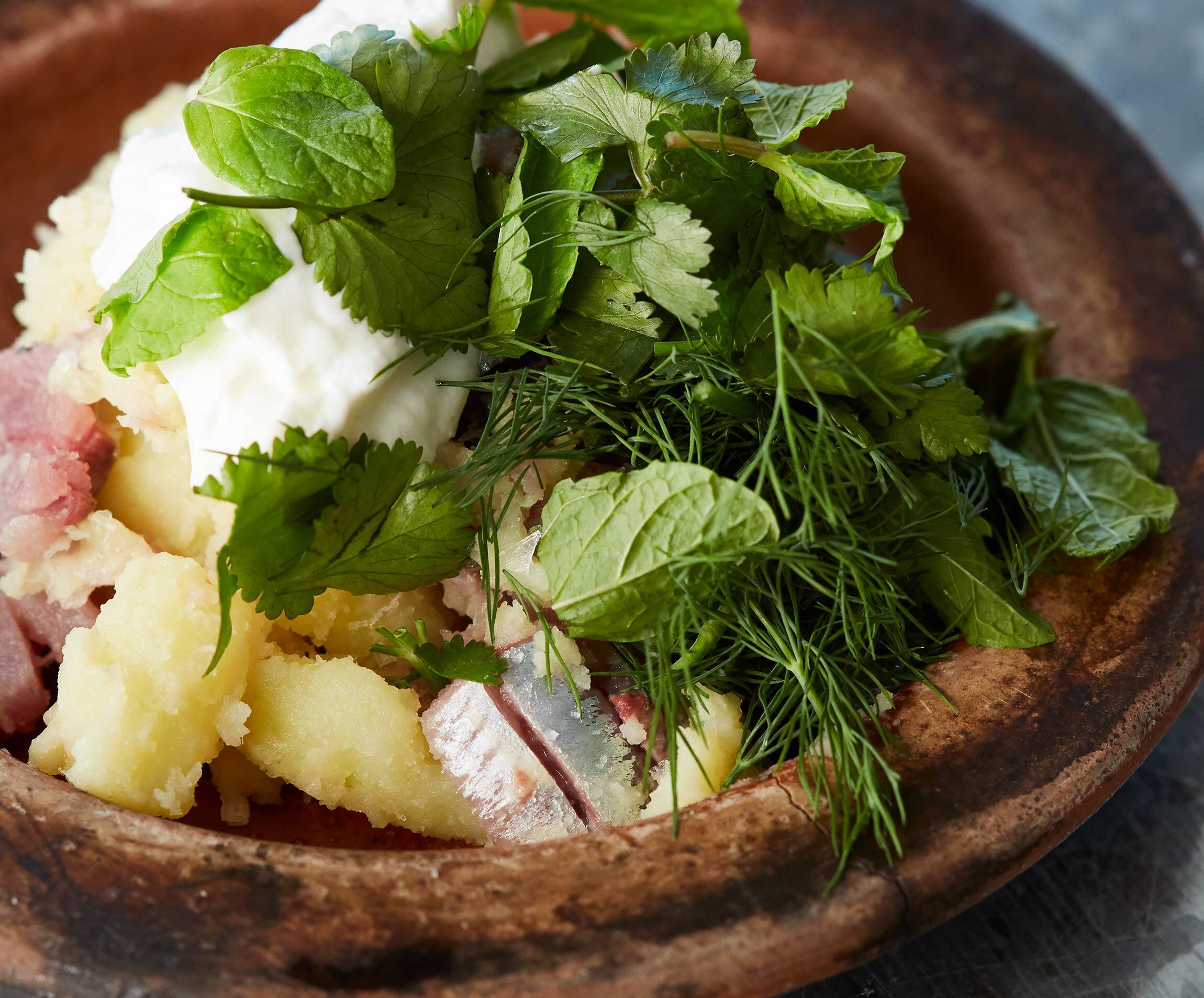 器に盛りつけ、ヨーグルトとハーブをのせ、塩をふったら出来上がり。混ぜ合わせたら、温かいうちにどうぞ。