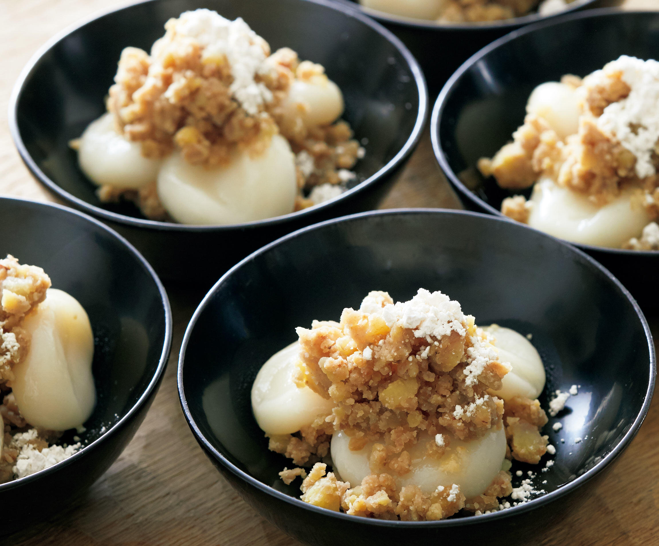 栗粉といっても、粉状にはせずに、粗くつぶしてそぼろ状にしてつくります。栗の出始めのときから何回でもつくりたくなってしまう、一押しの和スイーツです。白玉は少しやわらかめにつくると、栗粉とよくなじんでおいしく食べられます。栗粉は冷凍保存ができるので、つくりおきしておくのもおすすめです。