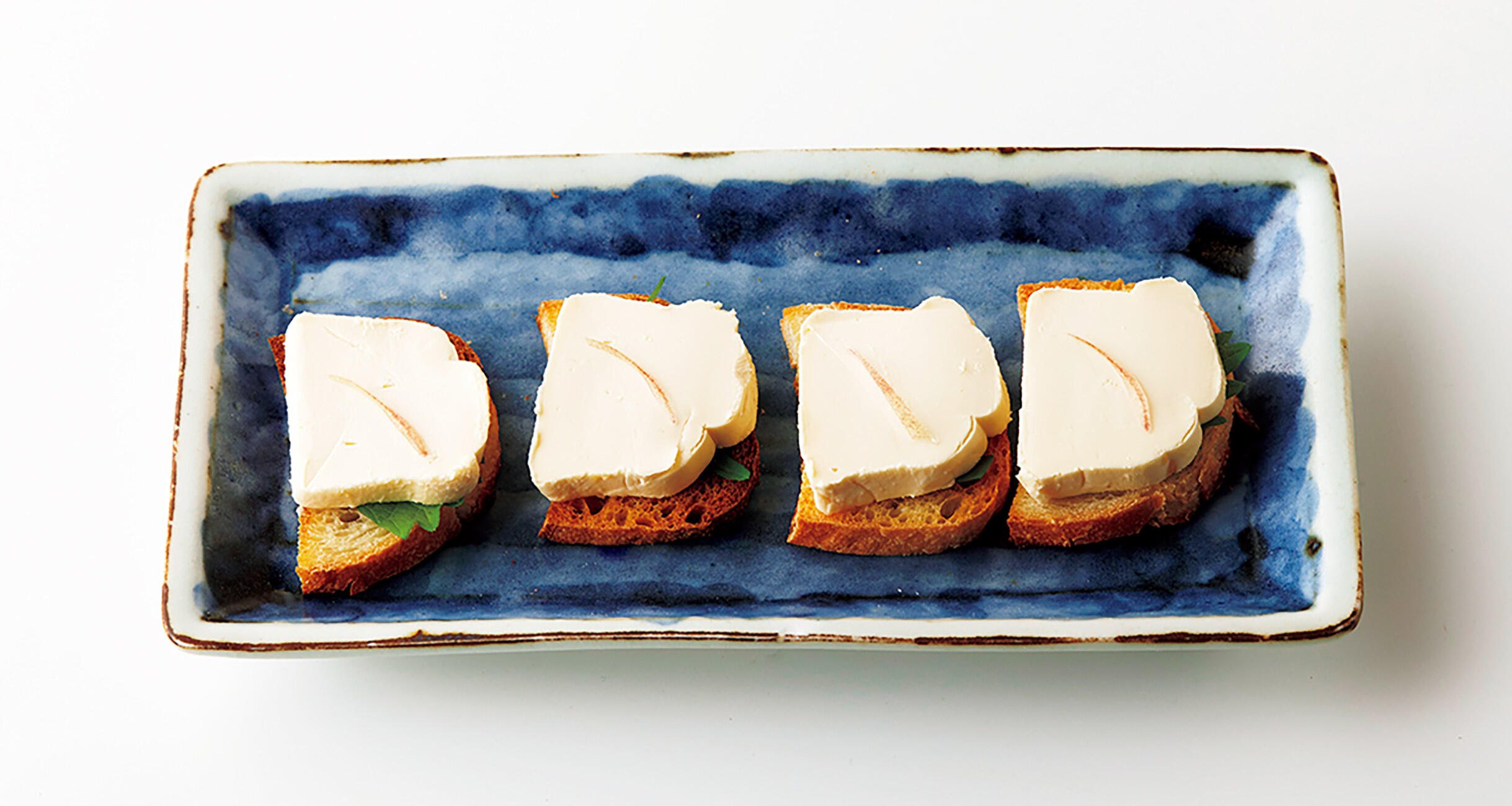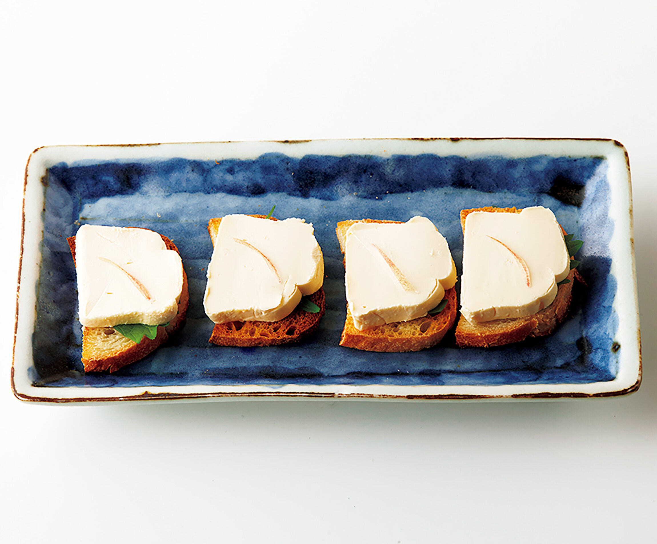 甘味のある白味噌と香りのいい麹味噌、二つの合わせ味噌に漬けた風味豊かなクリームチーズ。こんがり焼いたバゲットにのせるだけでもおいしいが、しそを加えると“和”の香りが引き立って、より日本酒に合う味に。