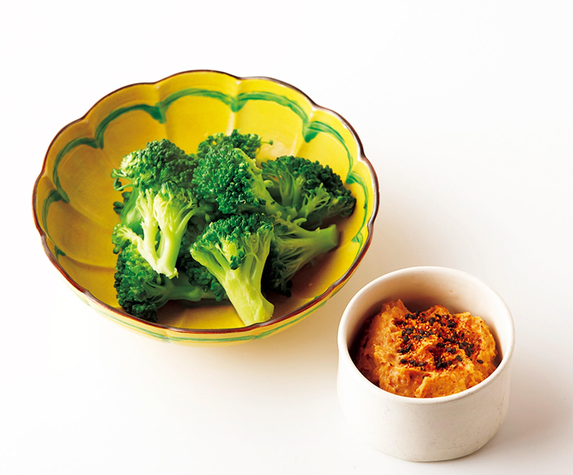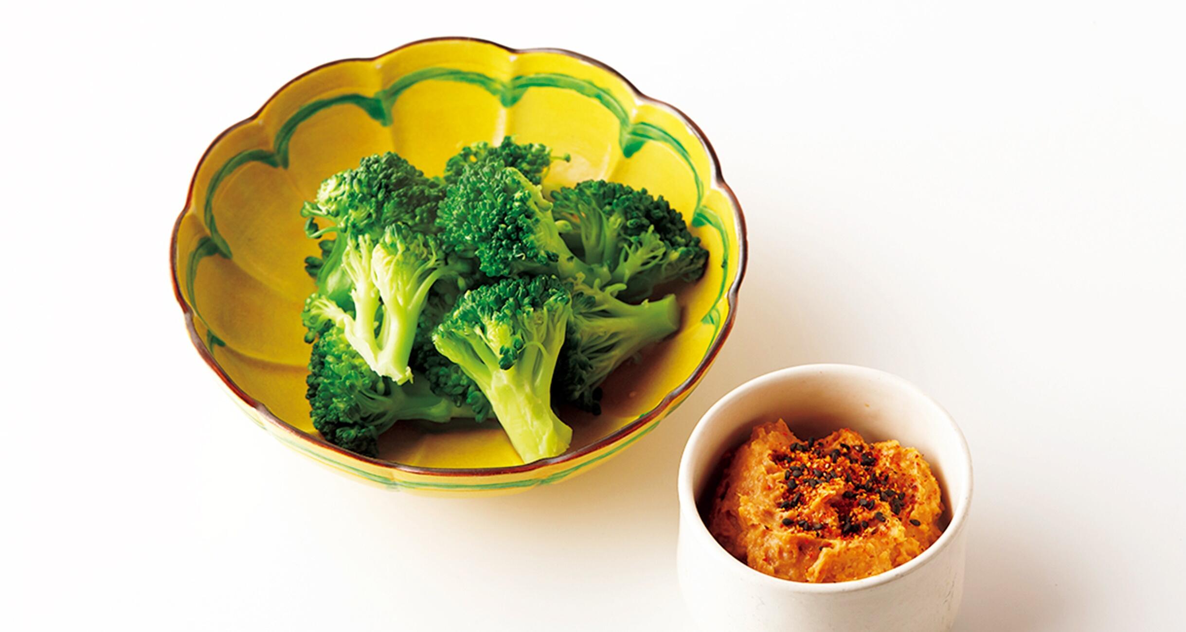 クリーミーなクリームチ ーズに味噌がなじんで口溶けのやさしいディップに。温かいゆでたてのブロッコリーにつければチーズのとろみが増しておいしさアップ。七味唐辛子のピリ辛がアクセントになって酒がすすむ!