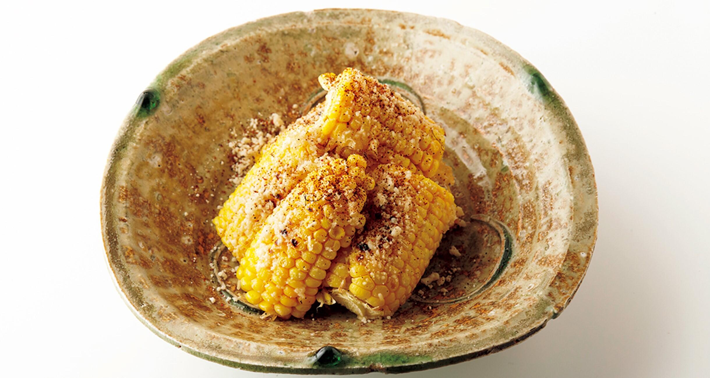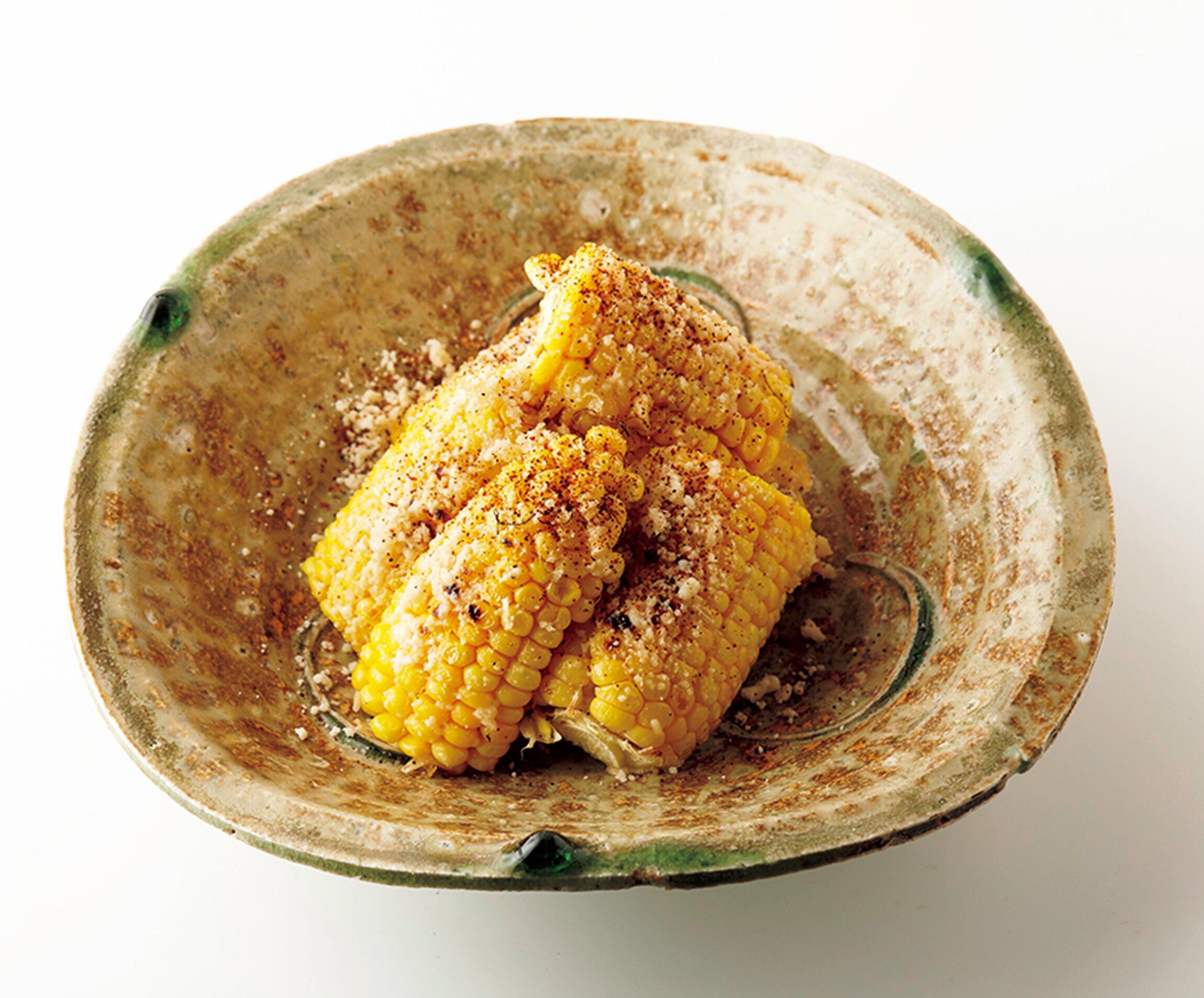 香ばしいだけじゃない。複数の香辛料をミックスした香り豊かなチリパウダーと、コクのあるパルミジャーノをかけて焼いた、エキゾチックでリッチな味の焼きもろこしである。ふくよかな香りのお酒とともに。