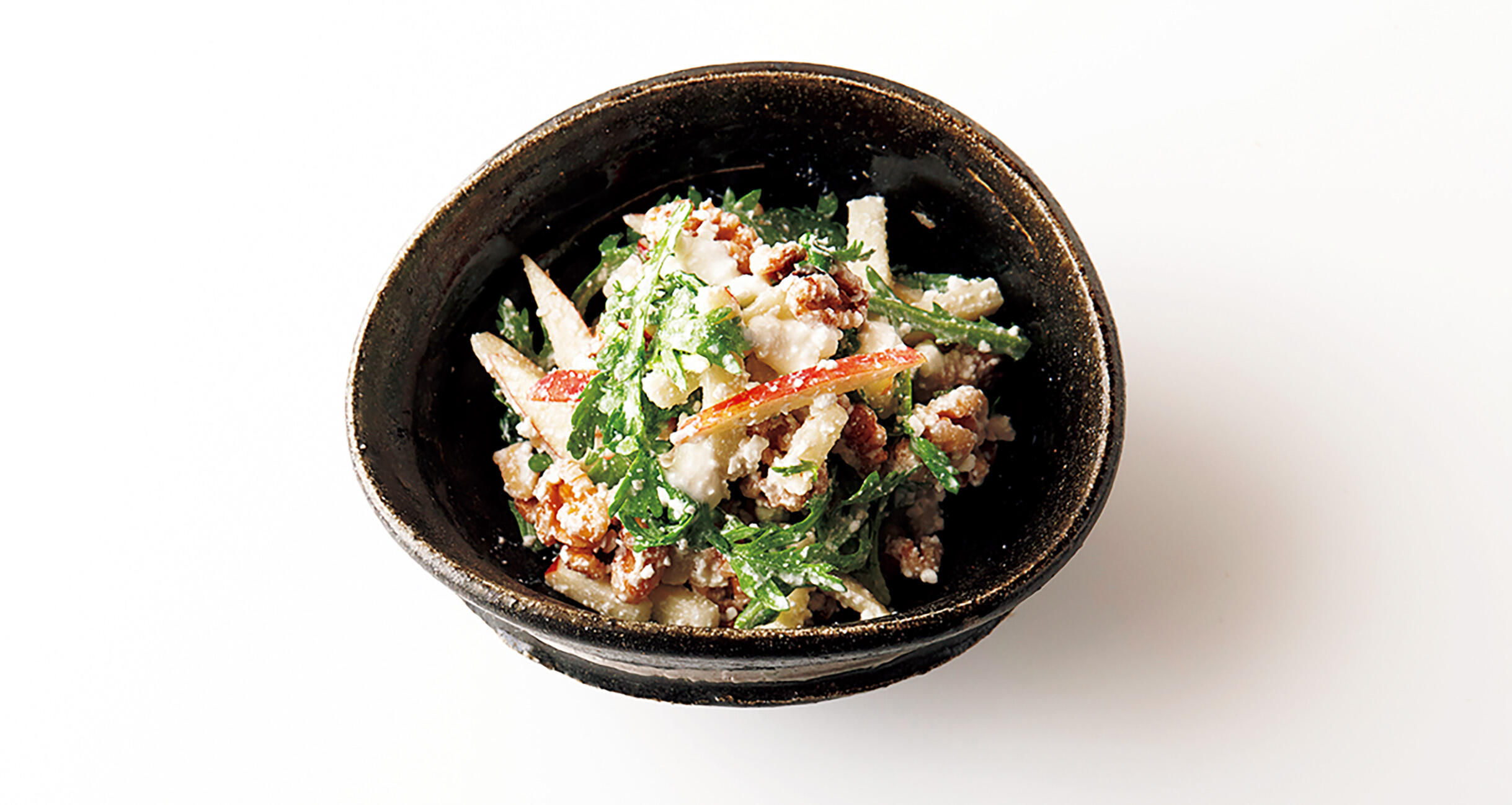 春菊、りんご、クルミを混ぜた、食感と甘味が心地よいサラダです。醤油が入ることで、おかずにもなる一品。チーズといえば、当然ワインと合わせたくなりますよね?でも、和の酒にもチーズのつまみは魅力的なんです。チーズつまみを洋から和に変換するポイントは?東京・赤坂にある人気居酒屋「まるしげ夢葉家」の店主・小久保茂紀さんに伺いました。