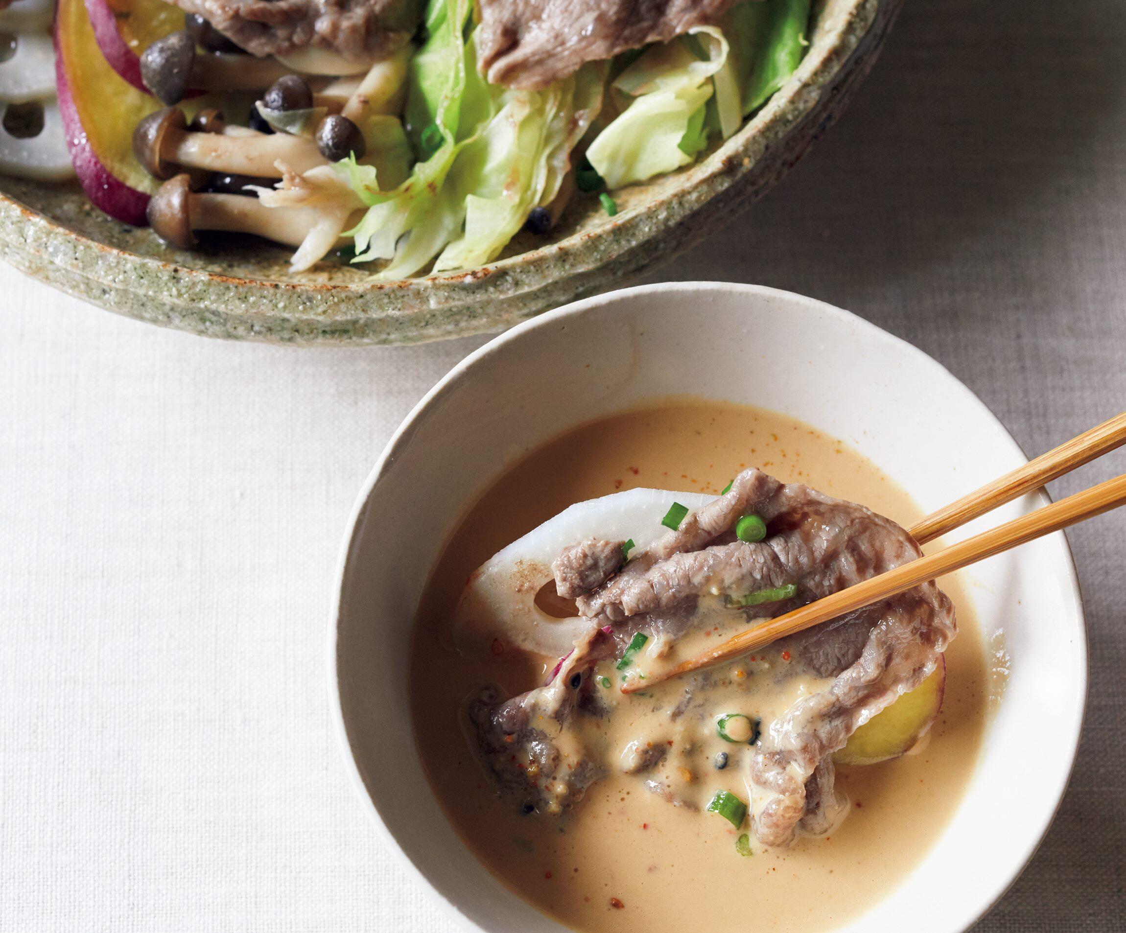 野菜を牛肉ですっぽりと覆って蒸します。肉汁が野菜にじわじわとしみ落ちて全体がまろやかな味わいに。自家製胡麻だれは生姜風味でさっぱり。
