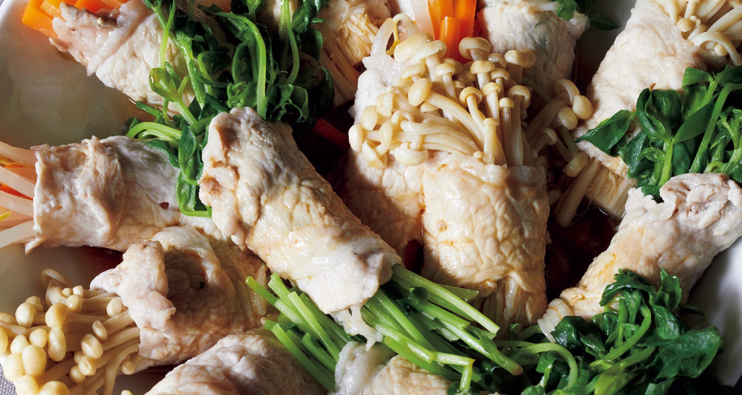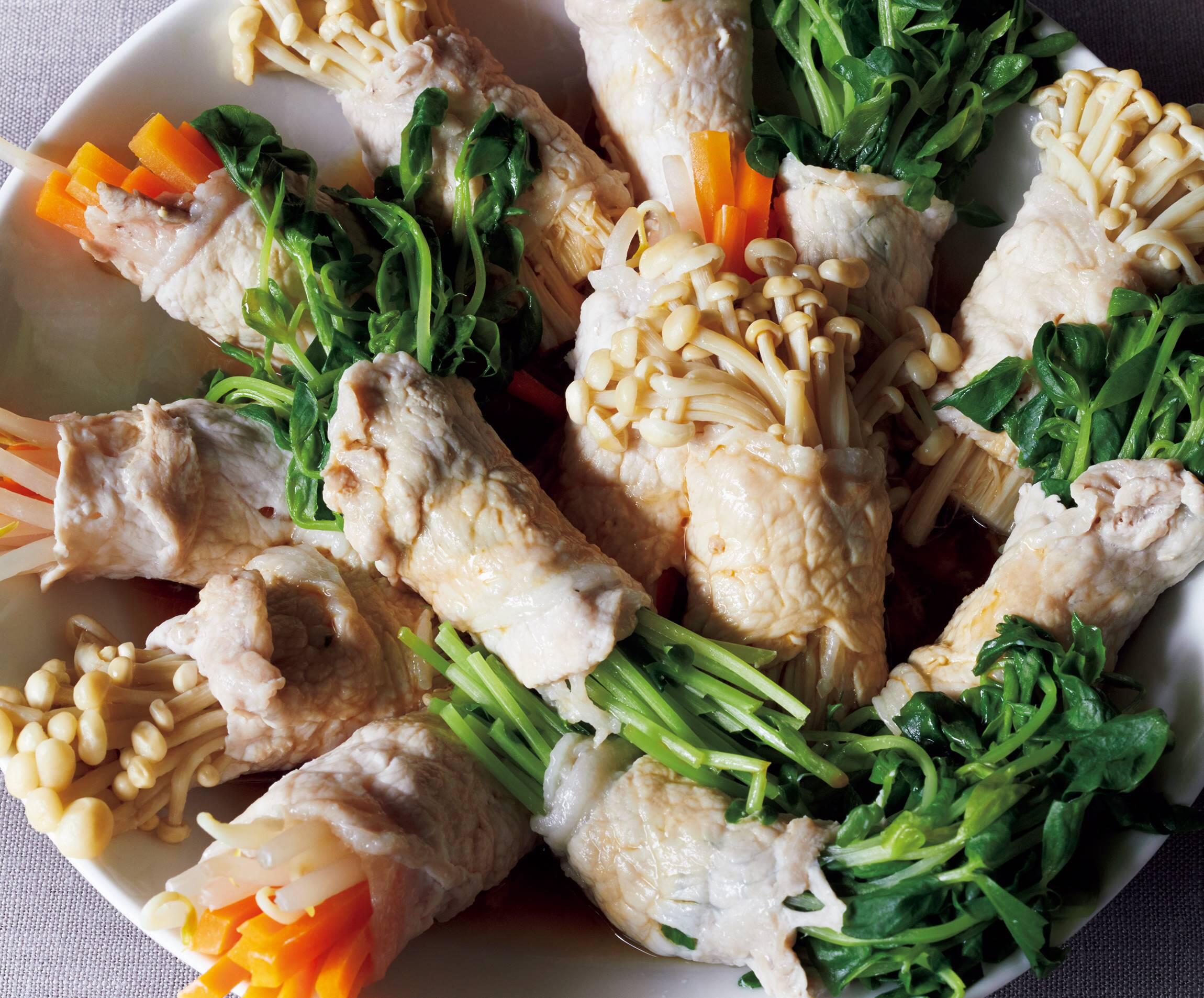 お好きな野菜を豚肉で巻いて蒸すことで、余分な脂が落ち、さっぱりと仕上がります。さらに蒸し効果で豚肉はしっとり美味。