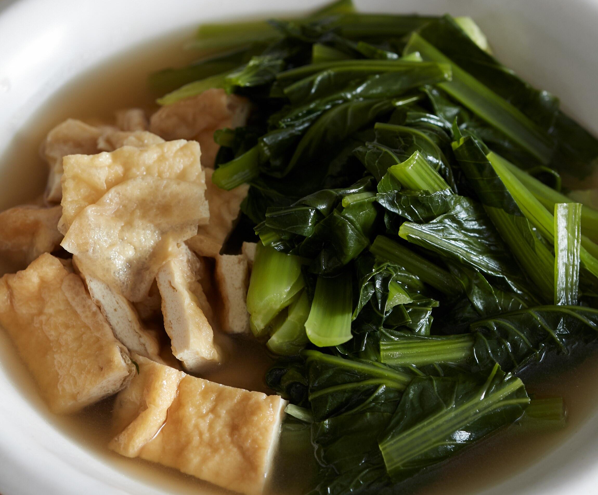 軸が口の中でとろけるくらいまでやわらかく煮るのがポイント。葉が十分に厚みをもった小松菜でつくってください。油揚げは油抜きせずに入れてコクを出します。好みで七味唐辛子をふっても。