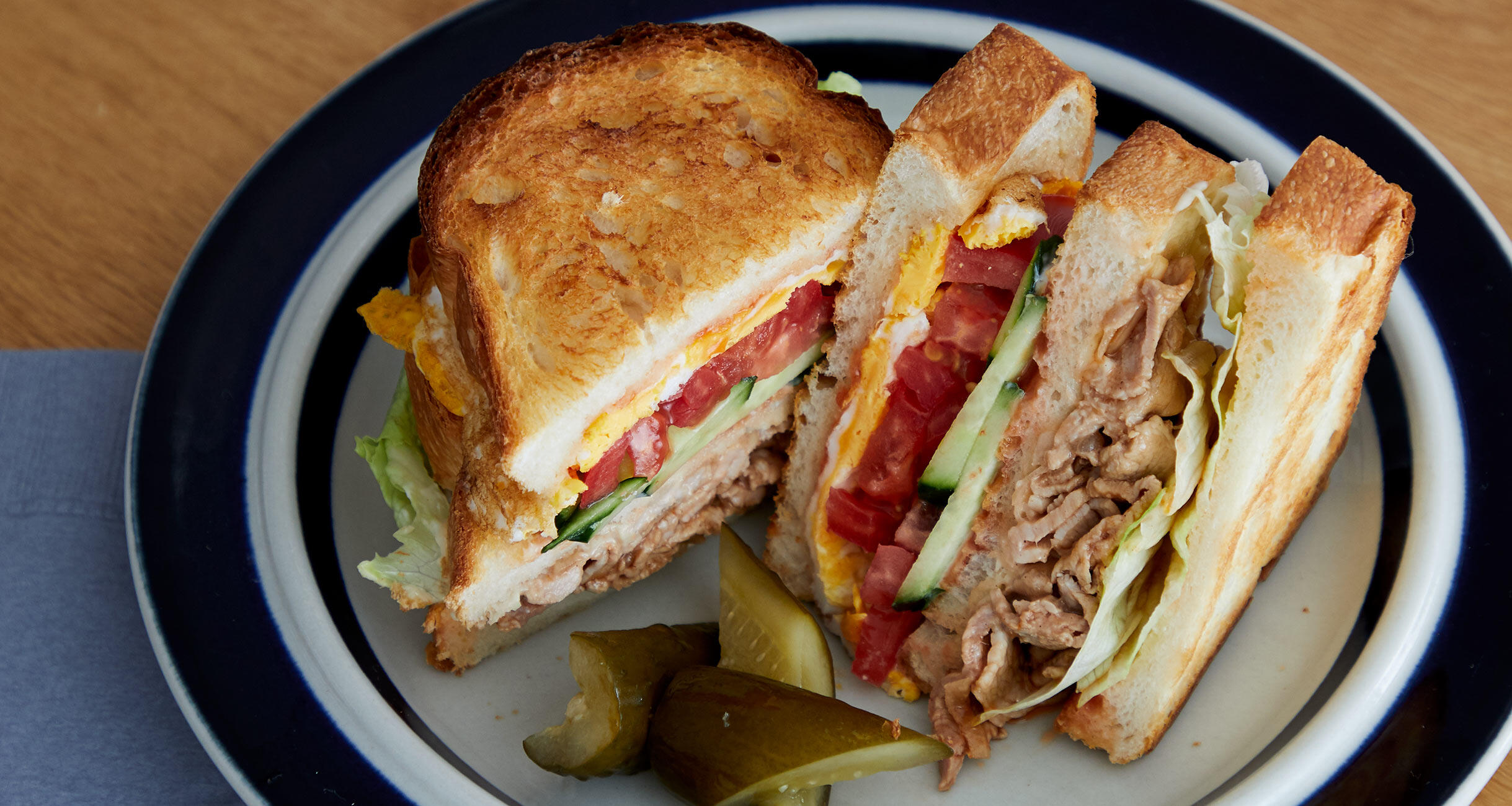 1枚目のパンにレタス、1のマリネの順にのせ、2枚目のバター面にマヨネーズを塗ってその面を下にして重ねる。上になった面にトマトケチャップとマヨネーズを塗り、きゅうり、トマト、目玉焼きの順にのせる。3枚目のバター面にトマトケチャップを塗ってその面を下にして重ねる。