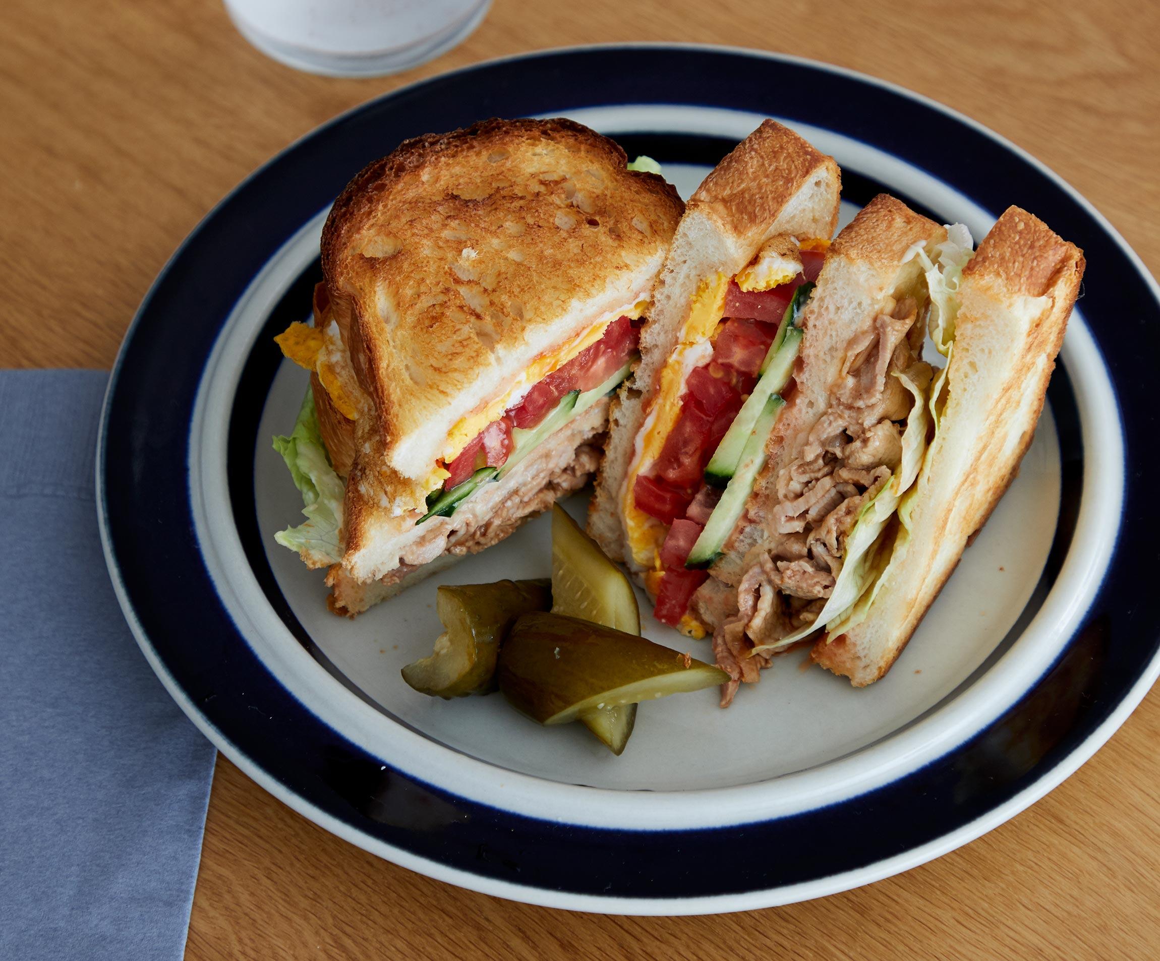 メインになる具は豚こま切れ肉。ゆでてソース&ケチャップ味でマリネにし、アツアツの目玉焼き、シャキシャキの生野菜を取り合わせ、ボリューム満点のサンドイッチに仕立てます。