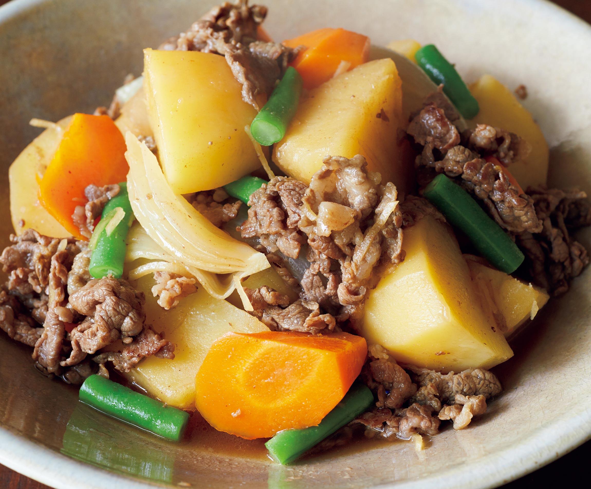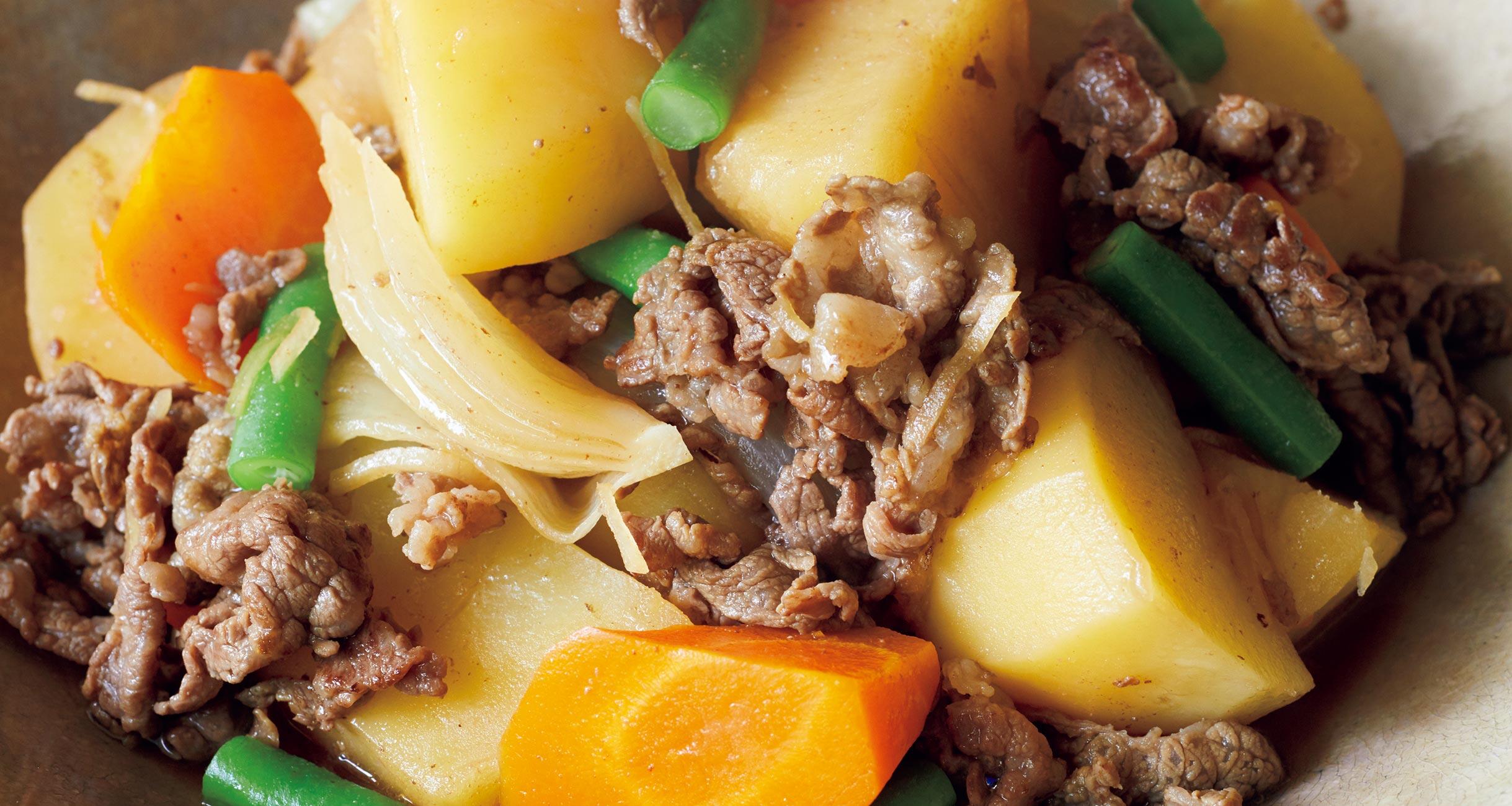 「おふくろの味」の代表格として、いつもトップクラスの人気を誇る肉じゃが。じゃがいもがおいしい秋、この定番料理をはずすことはできません。じゃがいもは大ぶりに切ってホクホクを楽しみます。みりんと砂糖を先に入れ、素材に甘味を含ませてから醤油を加えて味を決めるのがポイントです。