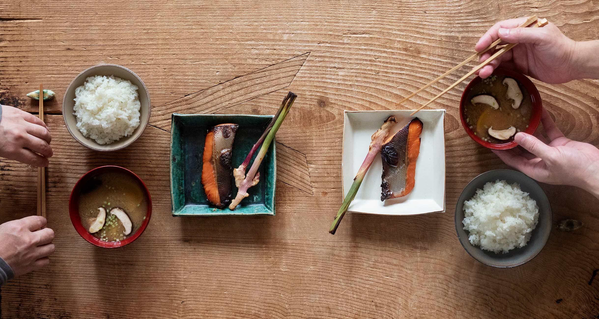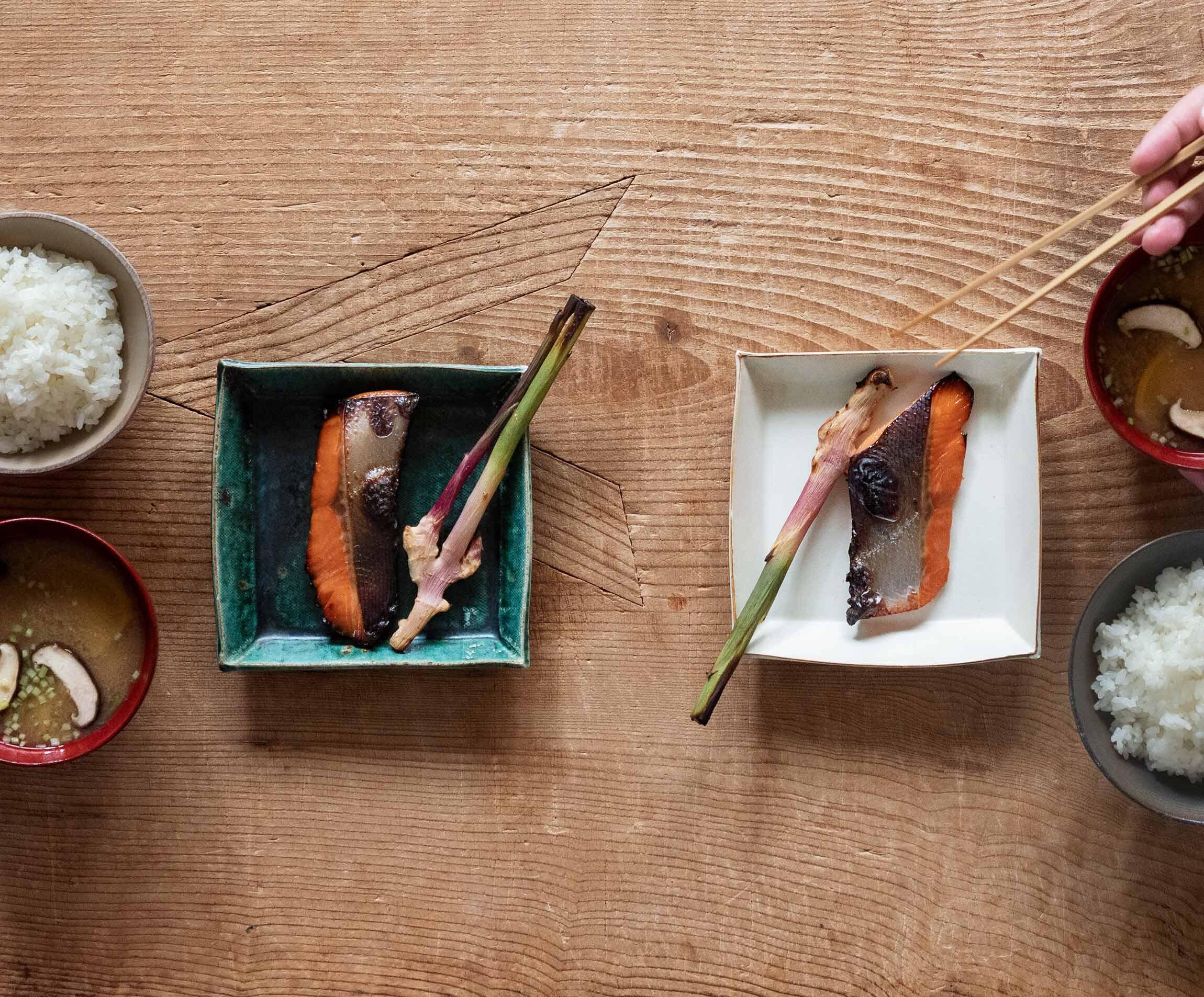 角皿のコーディネートが難しいというときは、銘々皿として使うのも手。この中里花子さん作の角皿は色違いですが、サイズが揃っていれば統一感があります。ただ、焼き魚に多い長角皿と違って、正方形は余白が気になることも。みょうがや谷中生姜の酢漬けなどを添えると収まりやすくなります。粕床はしばらく使えるので、ほかの魚介や季節の野菜、鶏肉を漬けるのもおすすめです。