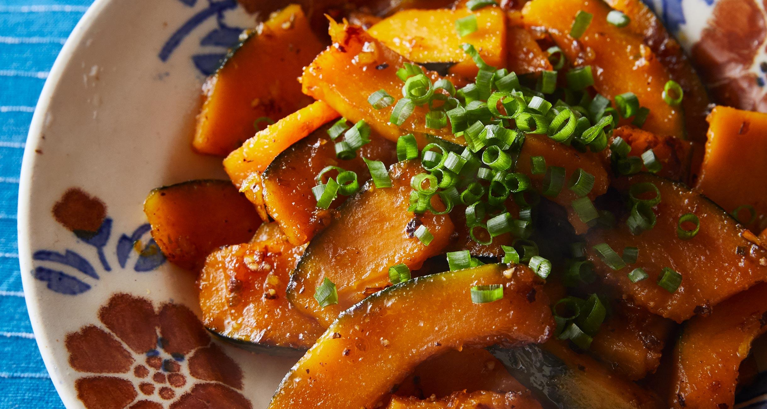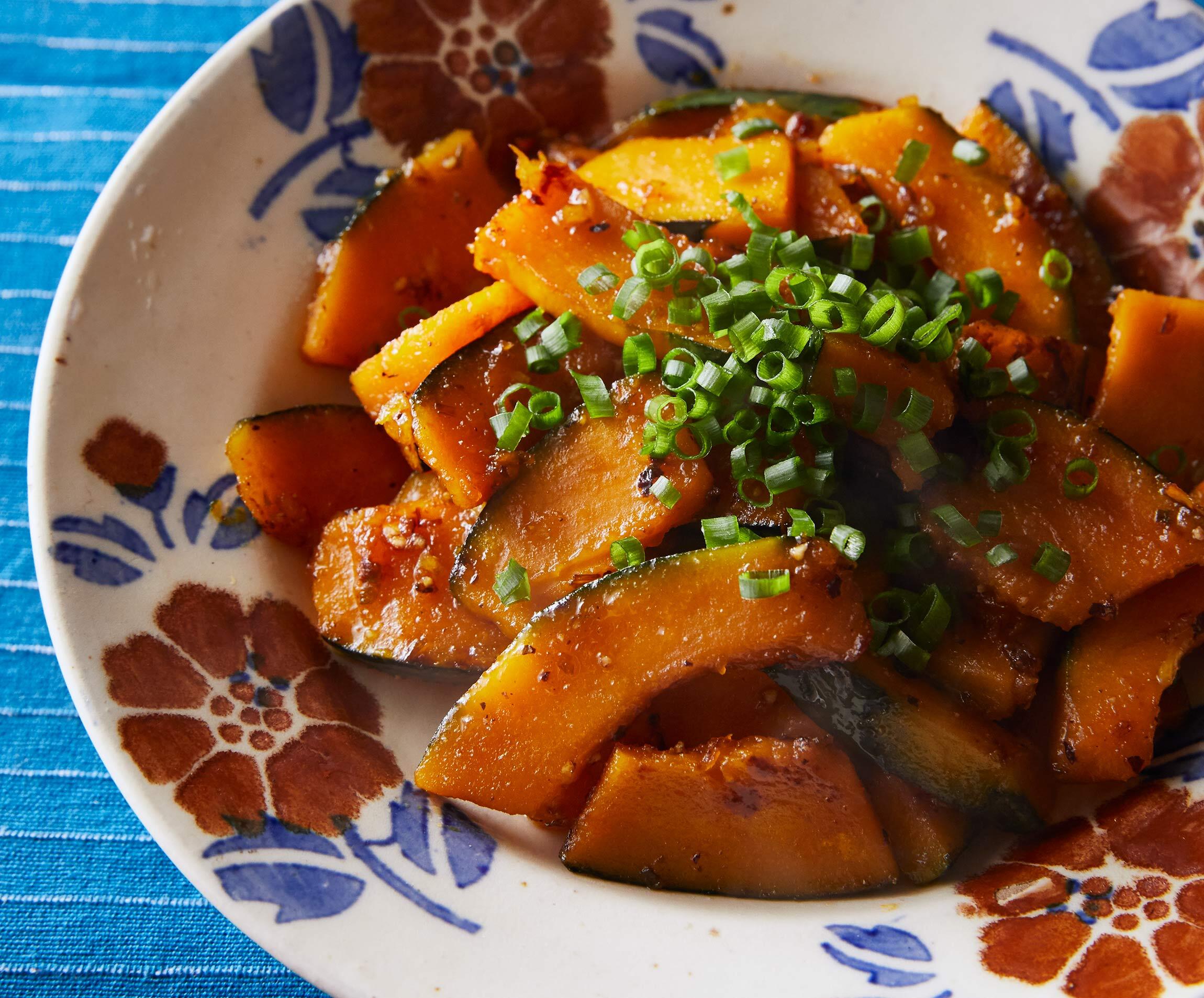 フライパンに植物油とにんにく、小ねぎの白い部分を入れて熱し、よい香りがしてきたら、かぼちゃを入れて炒める。全体に油がなじんだら水大さじ1をふり入れ、蓋をして中火でかぼちゃがやわらかくなるまで蒸し焼きにする。途中で上下を返し、かぼちゃがやわらかくなる前に水分が蒸発してしまったら、さらに水少量を足す。