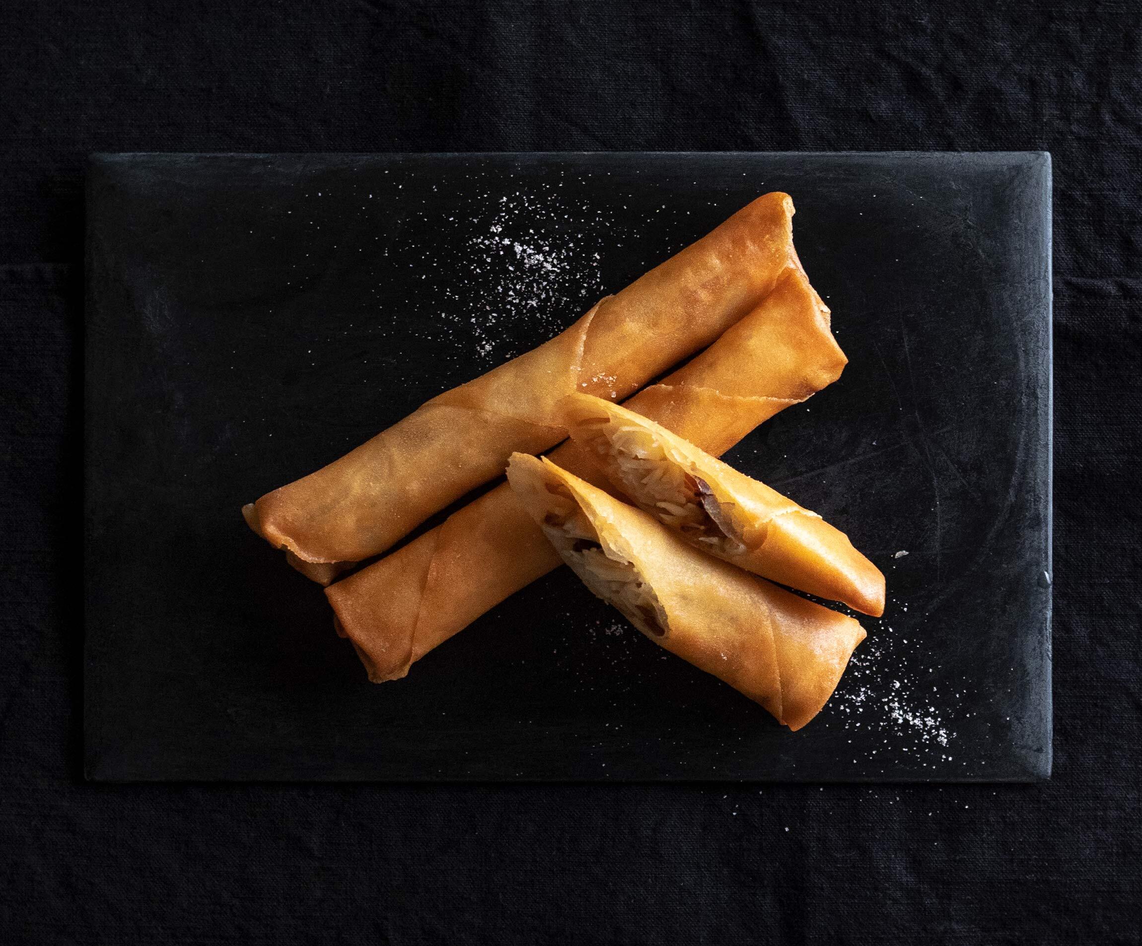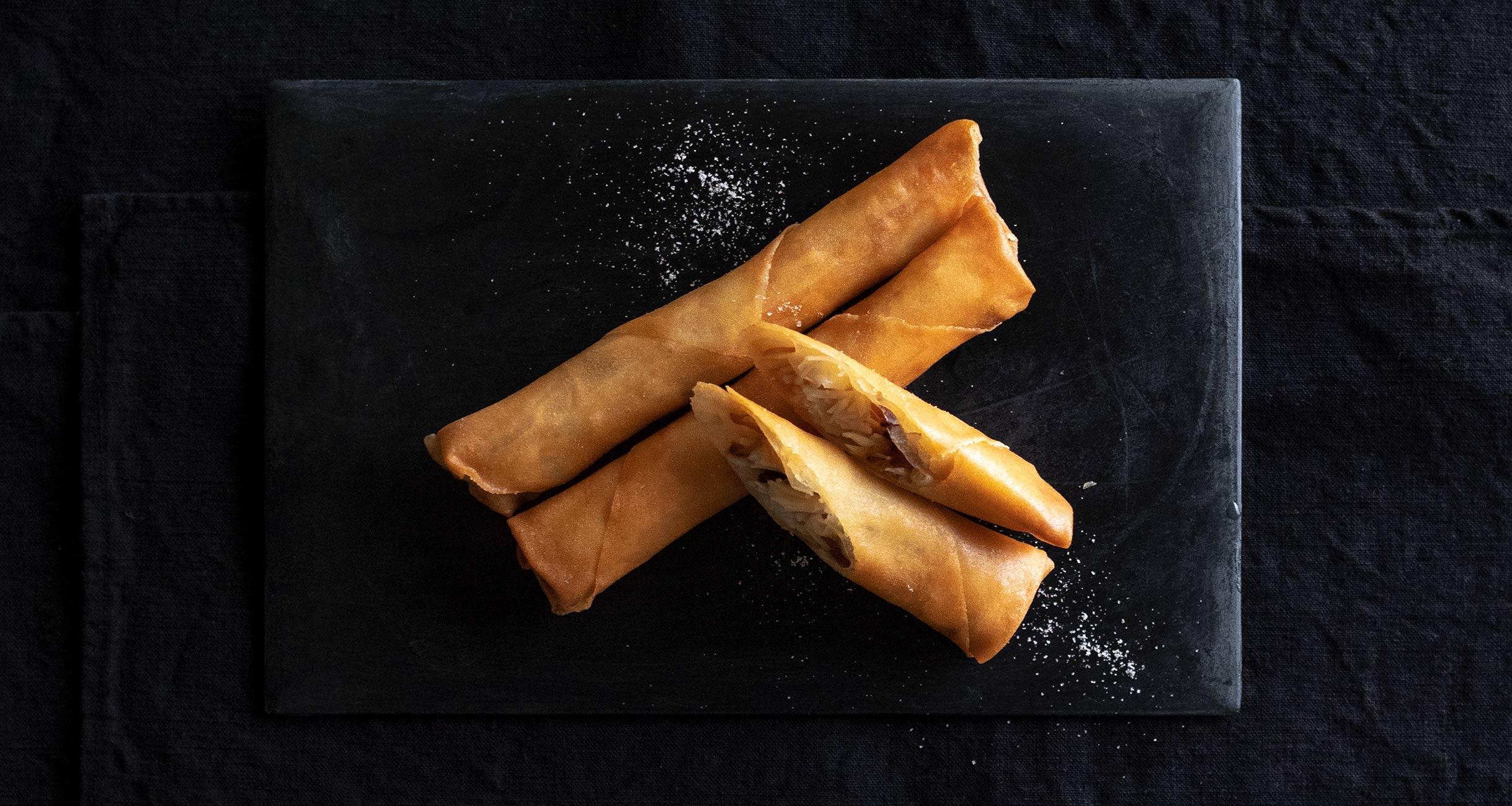 小山剛さん作の立ち上がりのない板漆皿には、日常的ではないという特別感が感じられます。和菓子やチーズなどにも合うけれど、細く巻いた春巻きを斜めにのせ、塩をぱらりとふると、余白がぐんと生きてきます。かじるとふわっと香る繊細な香りは花椒(ホワジャオ)油。春巻きは、皮の中に香りを閉じ込め、パリッとした食感がアクセントになる料理です。香りの強い椎茸や舞茸でつくってもおいしいですよ。