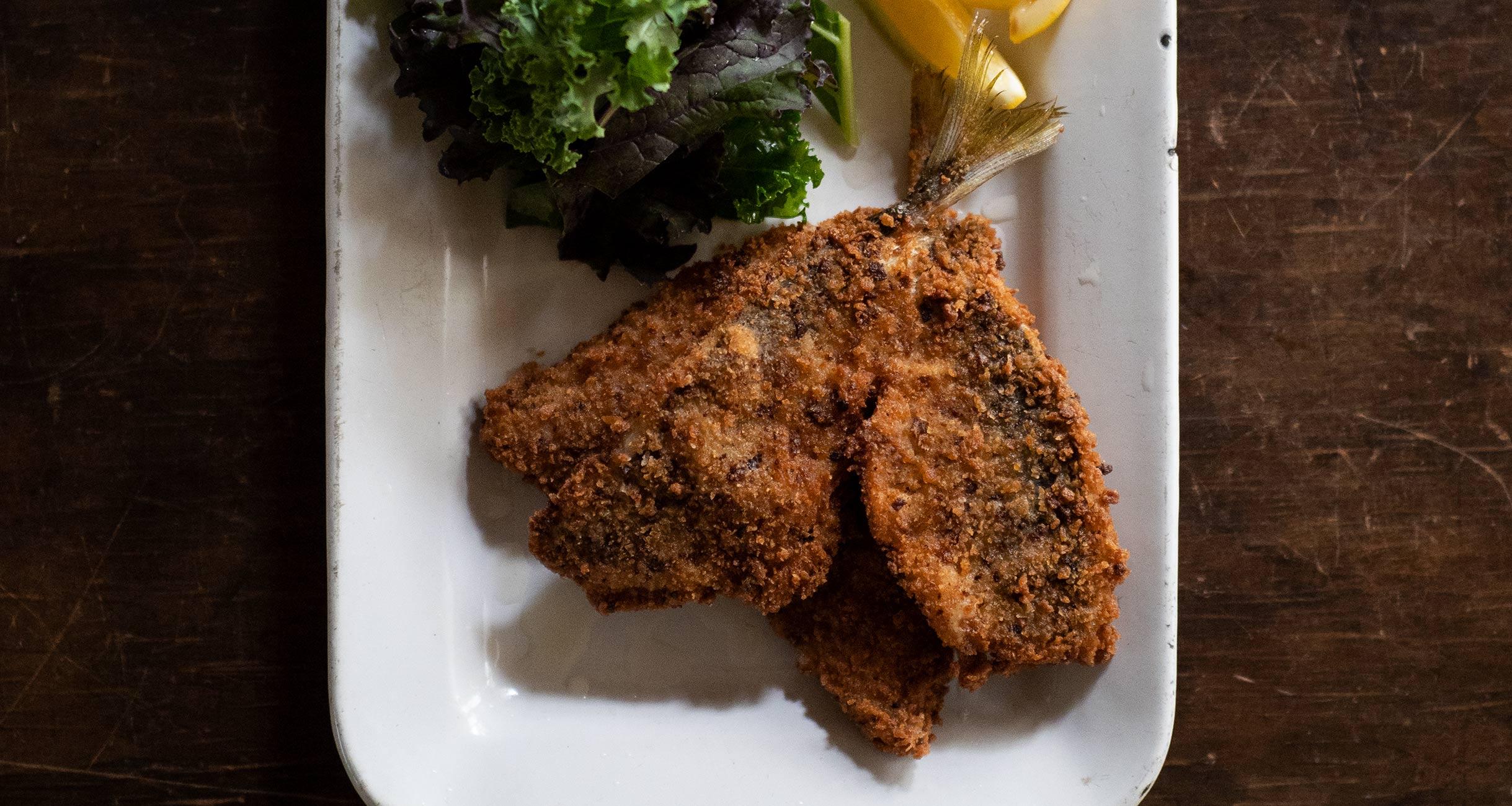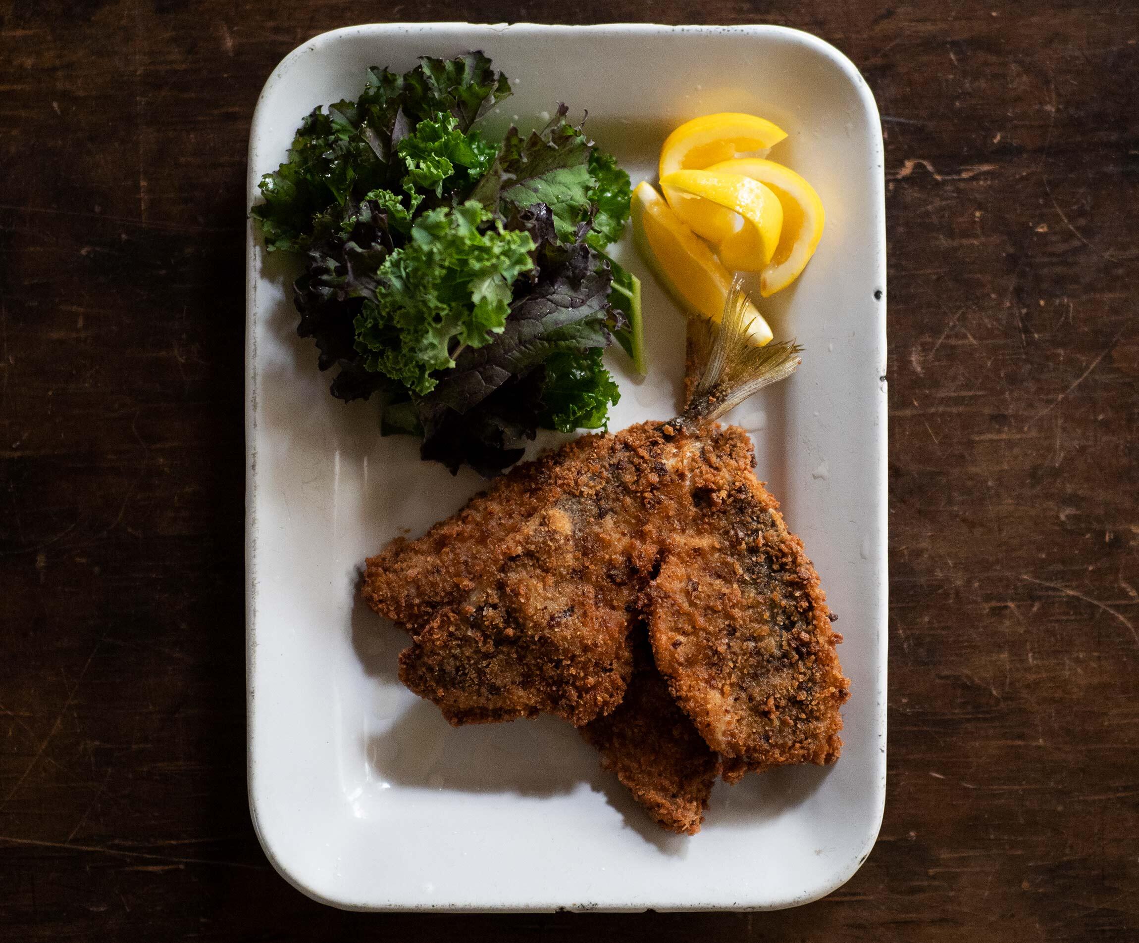 あじフライをのせた琺瑯(ほうろう)の器って、どこかアジアの食堂で見かけるような風情がありますが、四角い形によってちょっと洗練された雰囲気もあります。これはヨーロッパのヴィンテージの琺瑯皿ですが、古道具の琺瑯は、釉薬(うわぐすり)に濃淡のムラがあったり、少し錆さびているのも味わいです。パン粉は天然酵母でつくったパンを乾燥させて粉砕したものを使うと、冷めてもガリッとした食感のままでいただけます。
