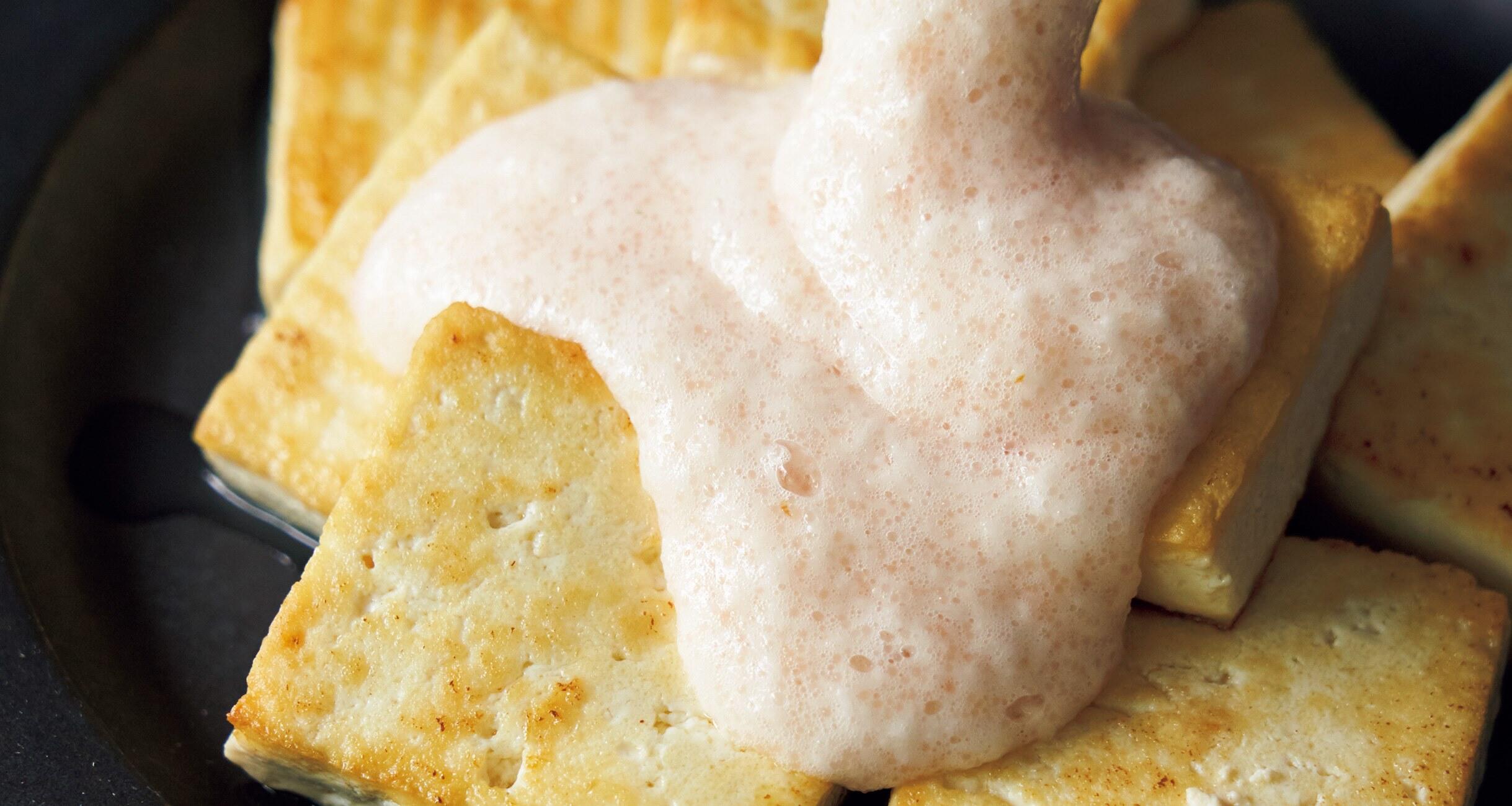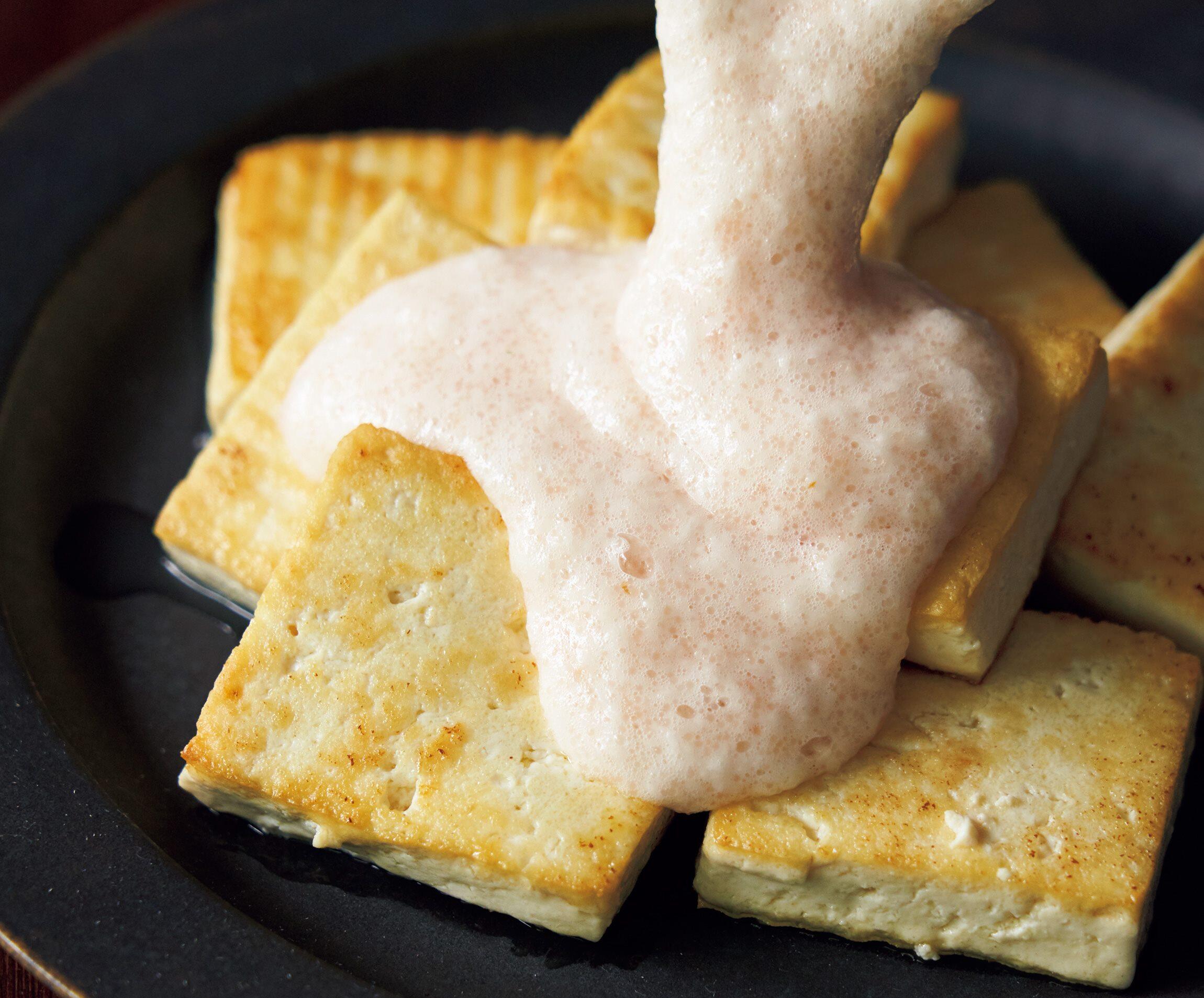 とろろの新しい提案。たらこを混ぜるとほんのりピンクに染まり、コクが増して美味。香ばしく焼いた豆腐にとろんとからませて召し上がれ。