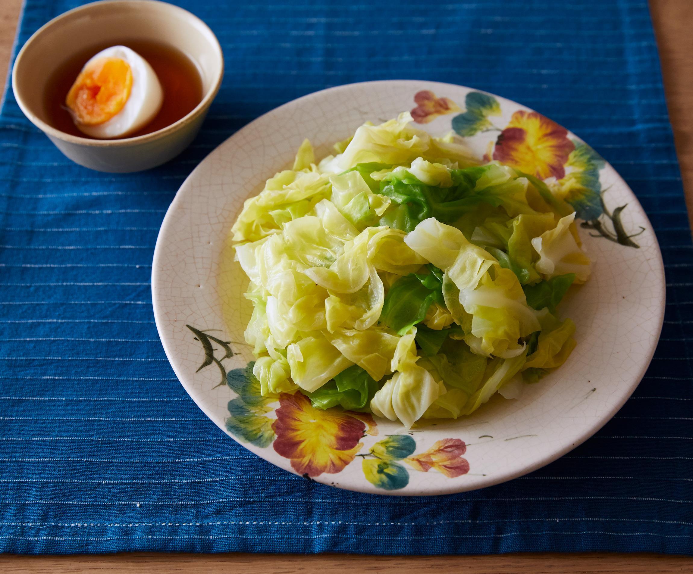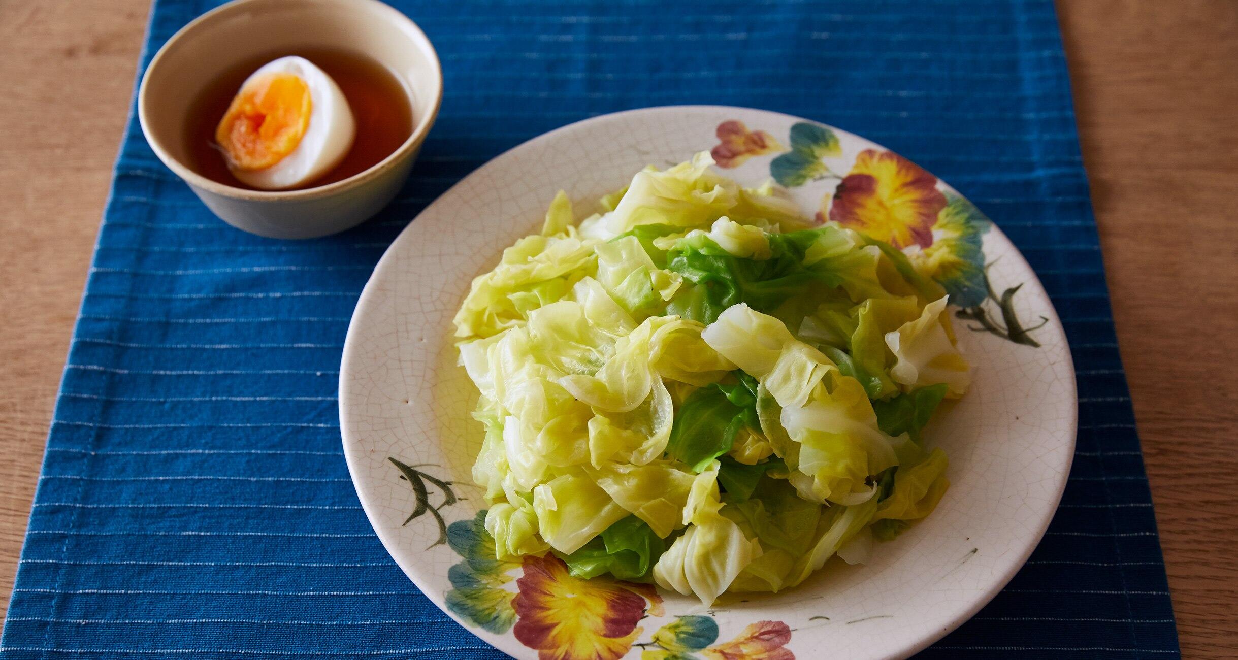 器にキャベツを盛りつけ、2のたれを添える。各自でゆで卵をスプーンや箸で細かくつぶし、キャベツにからめて食べる。