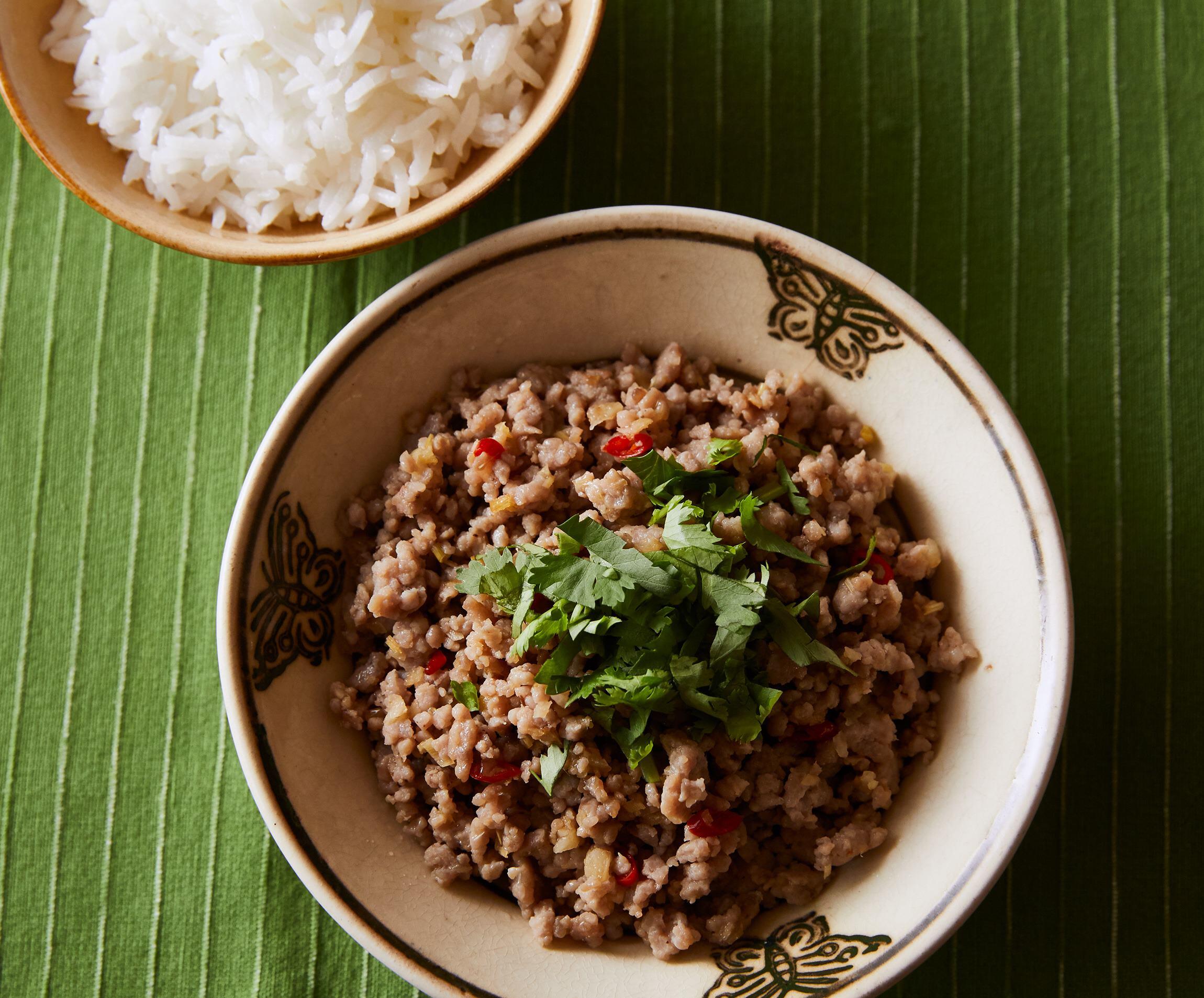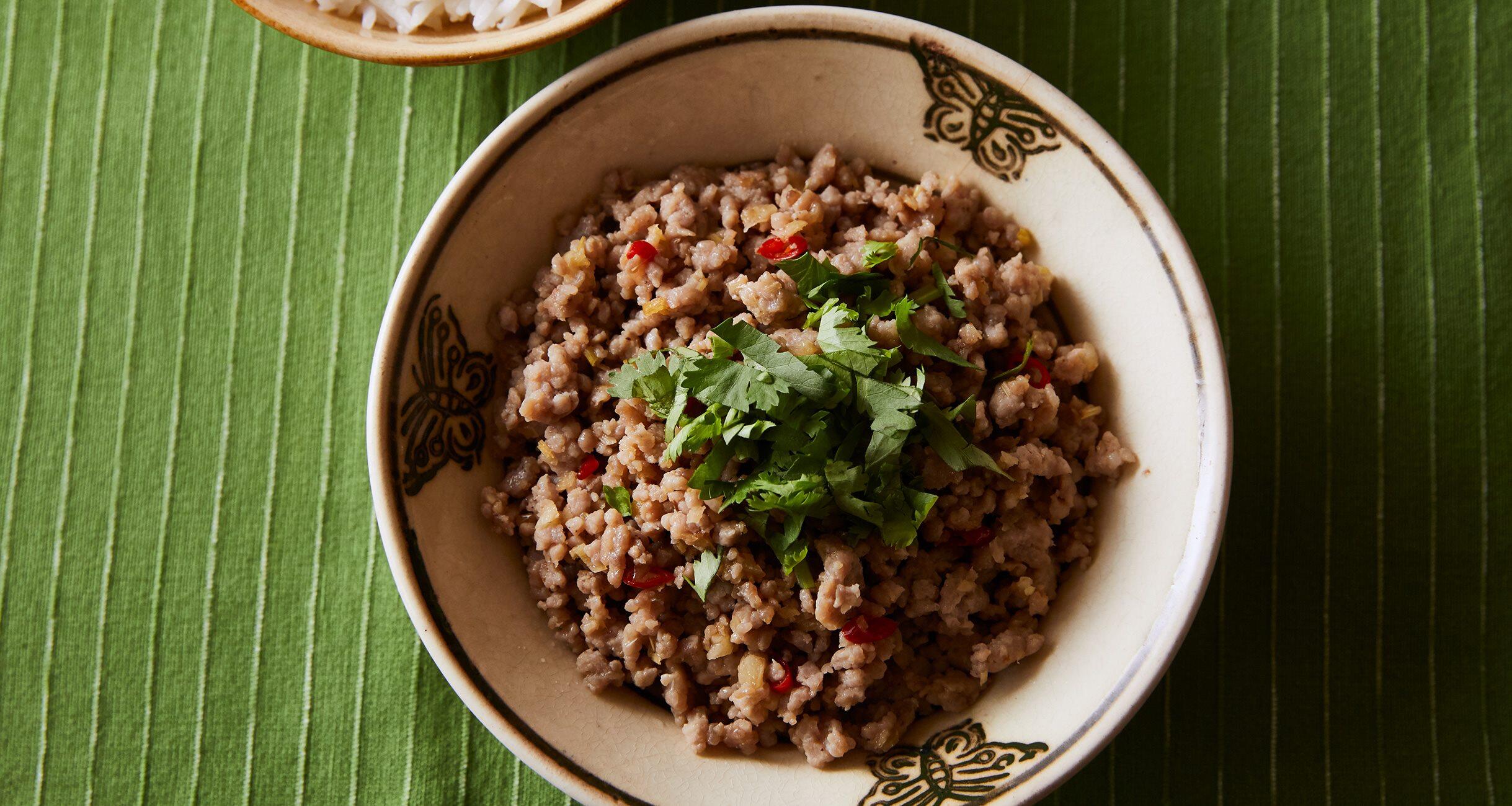 豚挽き肉がポロポロになるまで、しっかりと炒り煮にしたそぼろは、ご飯の最強おかず。現地ではレモングラスの代わりにカーでつくることもあります。