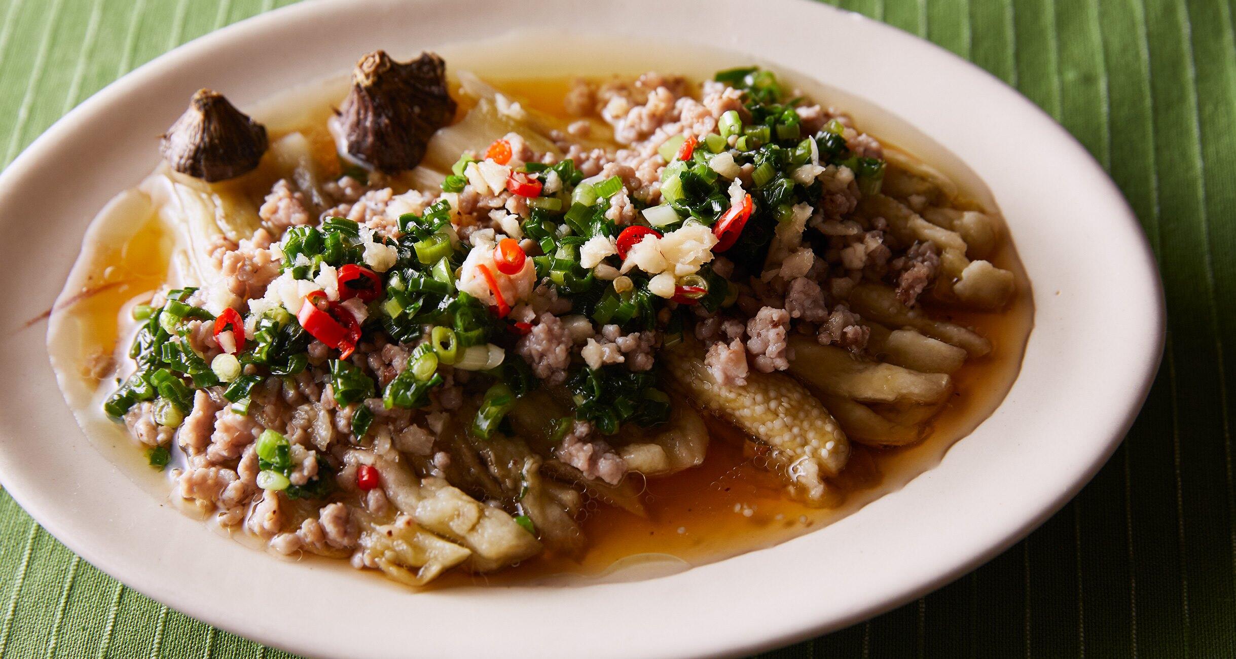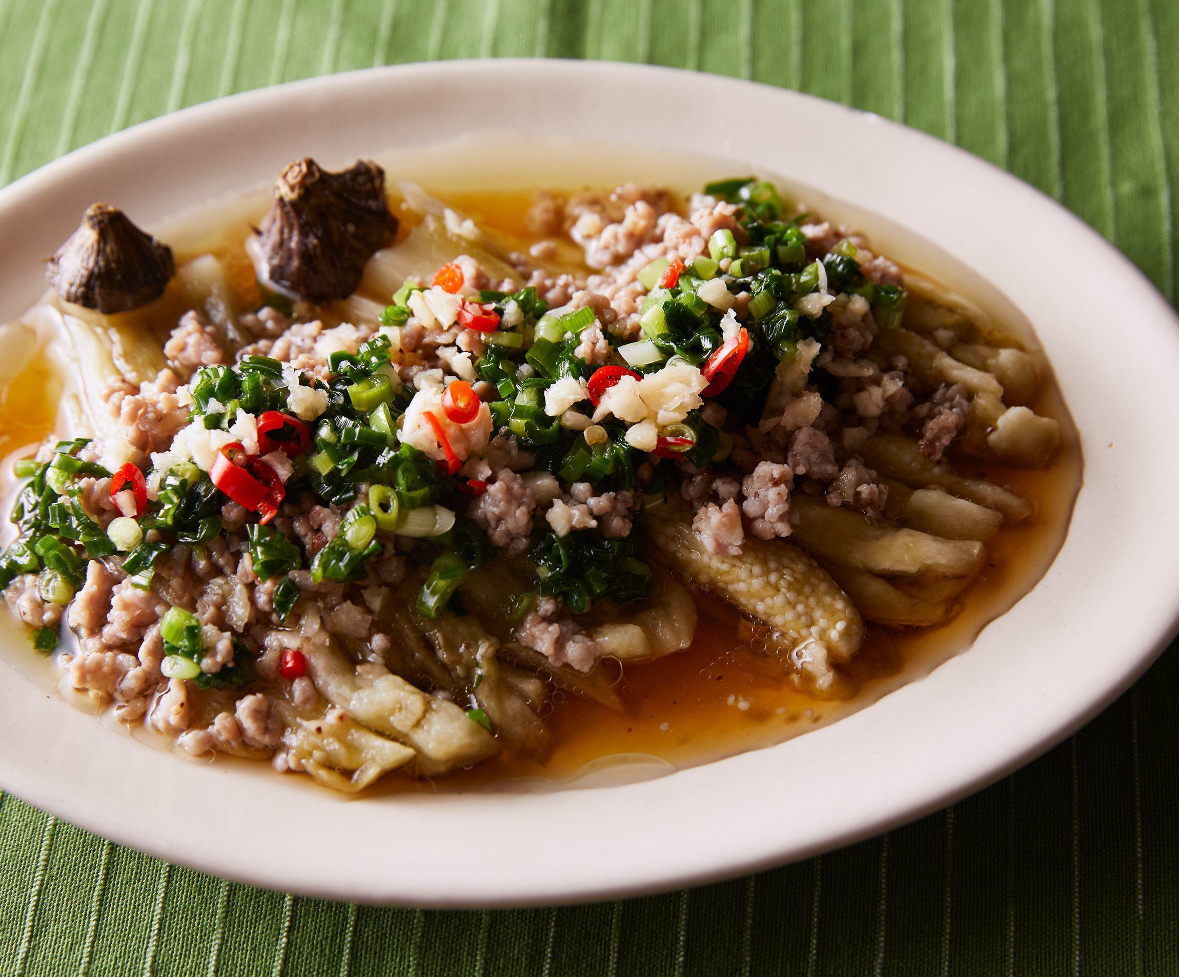 この料理は、なすとねぎ油、たれのバランスが大事。なすの量を増やしたら、それに合わせてほかも増やすこと。現地には挽き肉をのせないバージョンもあります。