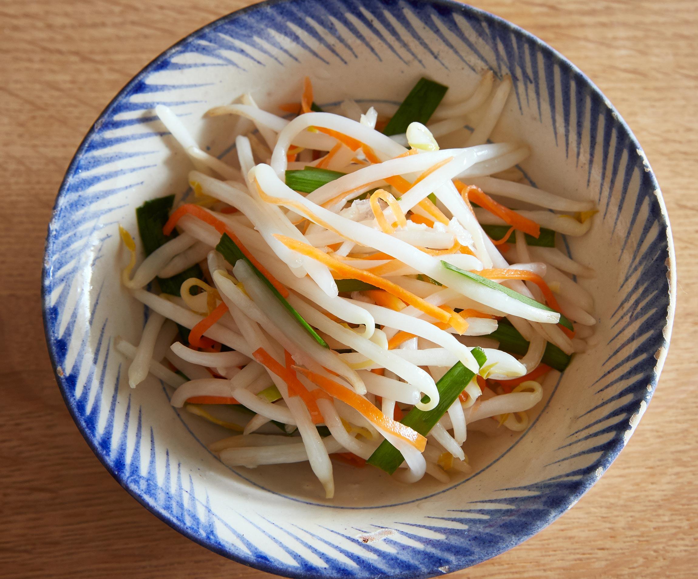もやしは何度か水を替えながらよく洗って水気をしっかりときり、ひげ根を取る。にんじんは塩をまぶして2~3分おき、しんなりとしたら水洗いして塩を落とし、水気を絞る。