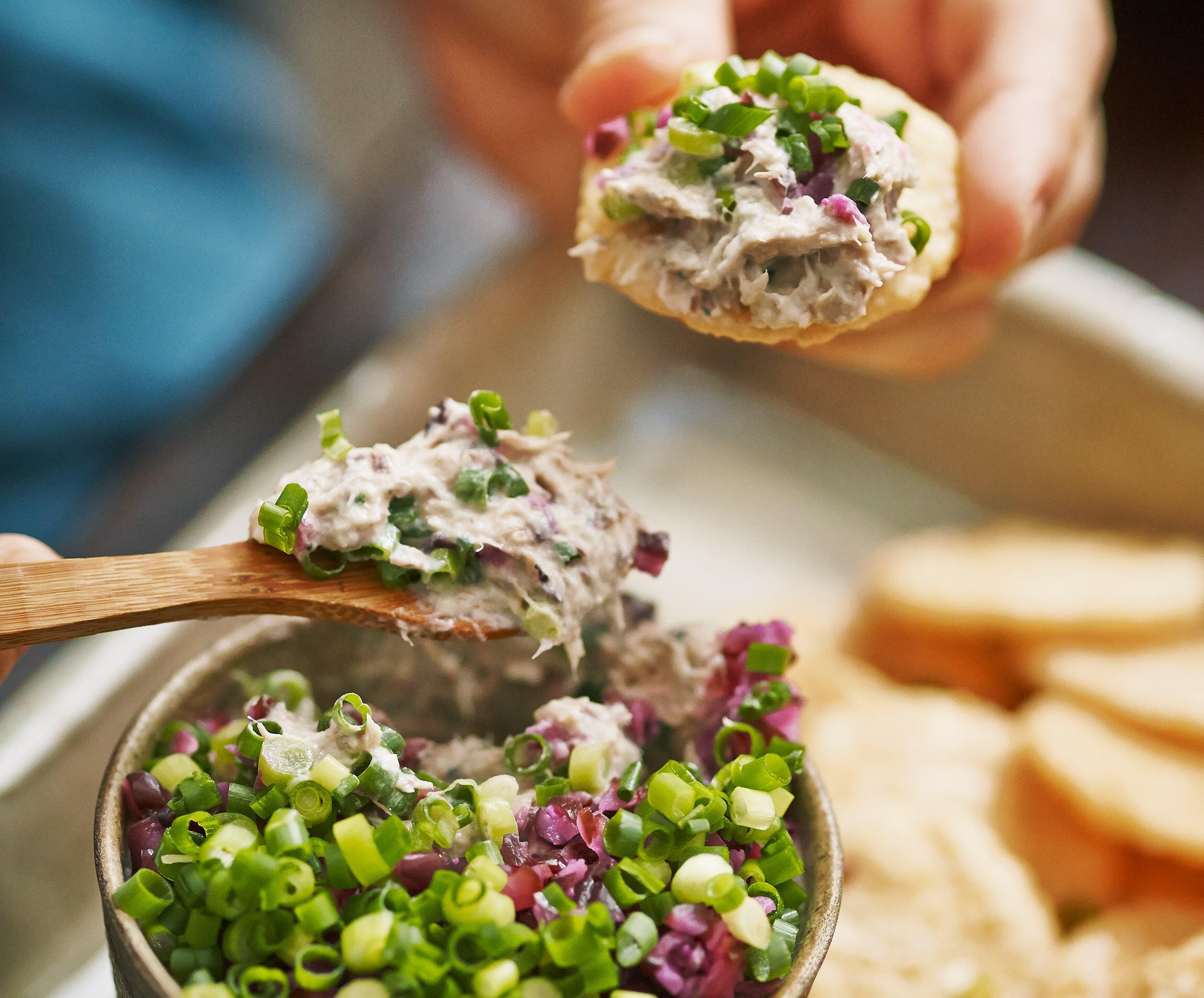 3に小ねぎとしば漬けをのせる。塩せんべいを添えて出し、ディップして食べる。