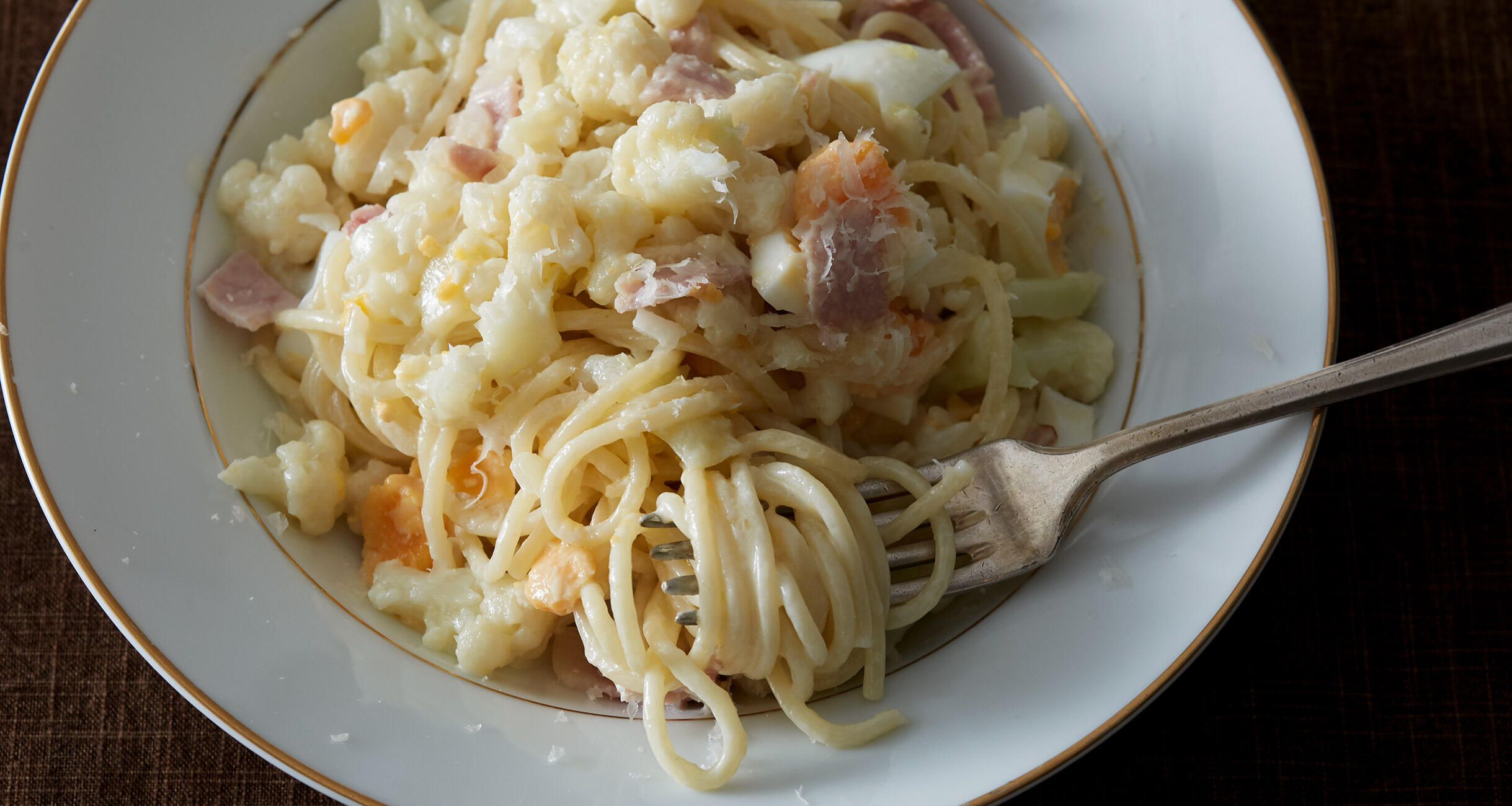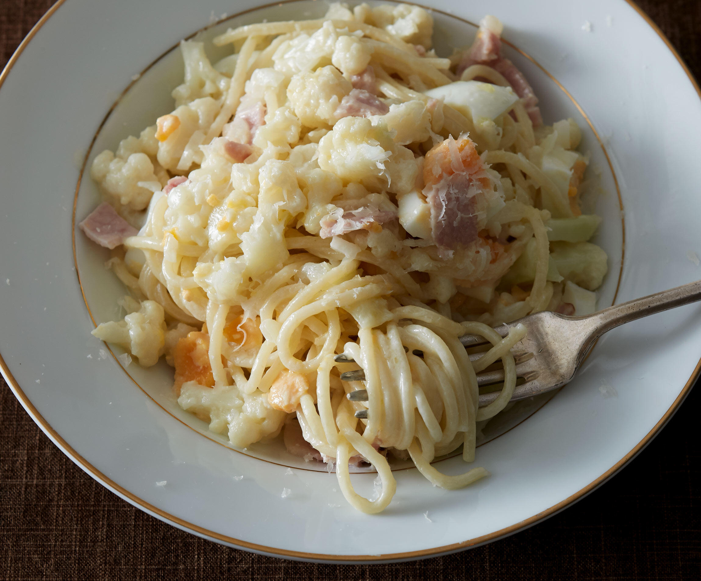 生クリームとチーズでつくるクリーム味は、まろやかであったか。冬におすすめです。カリフラワーたっぷりだから、スパゲッティが大盛りのひと皿になるのもちょっとうれしい。