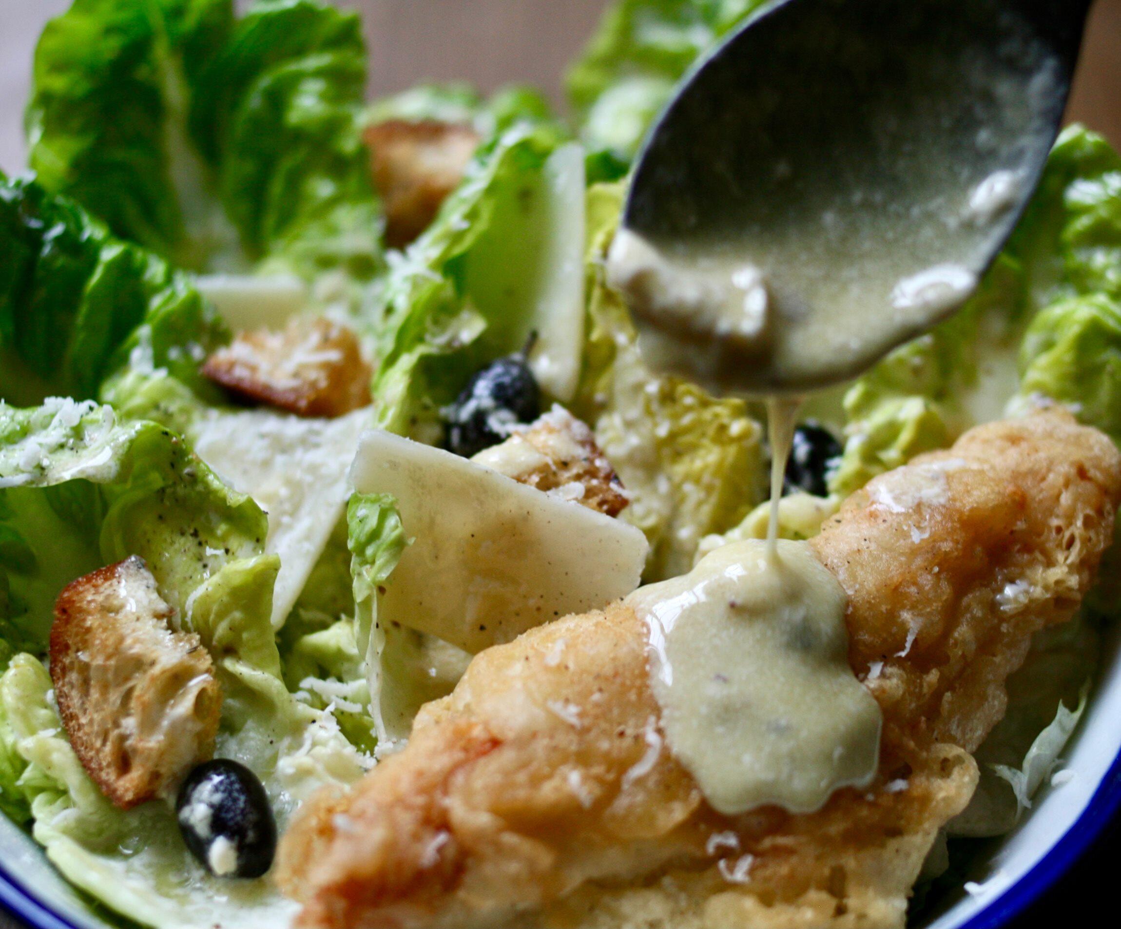 なぜ、クルトンが一番大事か、と言うとその食感である。ぼくが今回のレシピの中で、皆さんに一番頑張ってもらいたいのが、このクルトンだ。ガリっガリっと頭骨全体に響き渡る破壊的な食感に、プロヴァンスのハーブが口腔全体に持ち込む香りの奥行がすさまじい。これがにんにくとアンチョビのドレッシングが絡まったロメインレタスのシャリシャリ感と奏でるビート感が小気味いい。ジャンベとコンガのリズム・セッションだ。その食感の後に、ビールを飲んで、その後に、サクサクのフリットをつまむと、もう、頬っぺたが落ちそうになる。ガリっガリっ、シャリシャリ、サクサク……。これは、はっきり断言しよう。こんなに人を楽しませるエンターテインメントサラダは他にはない!